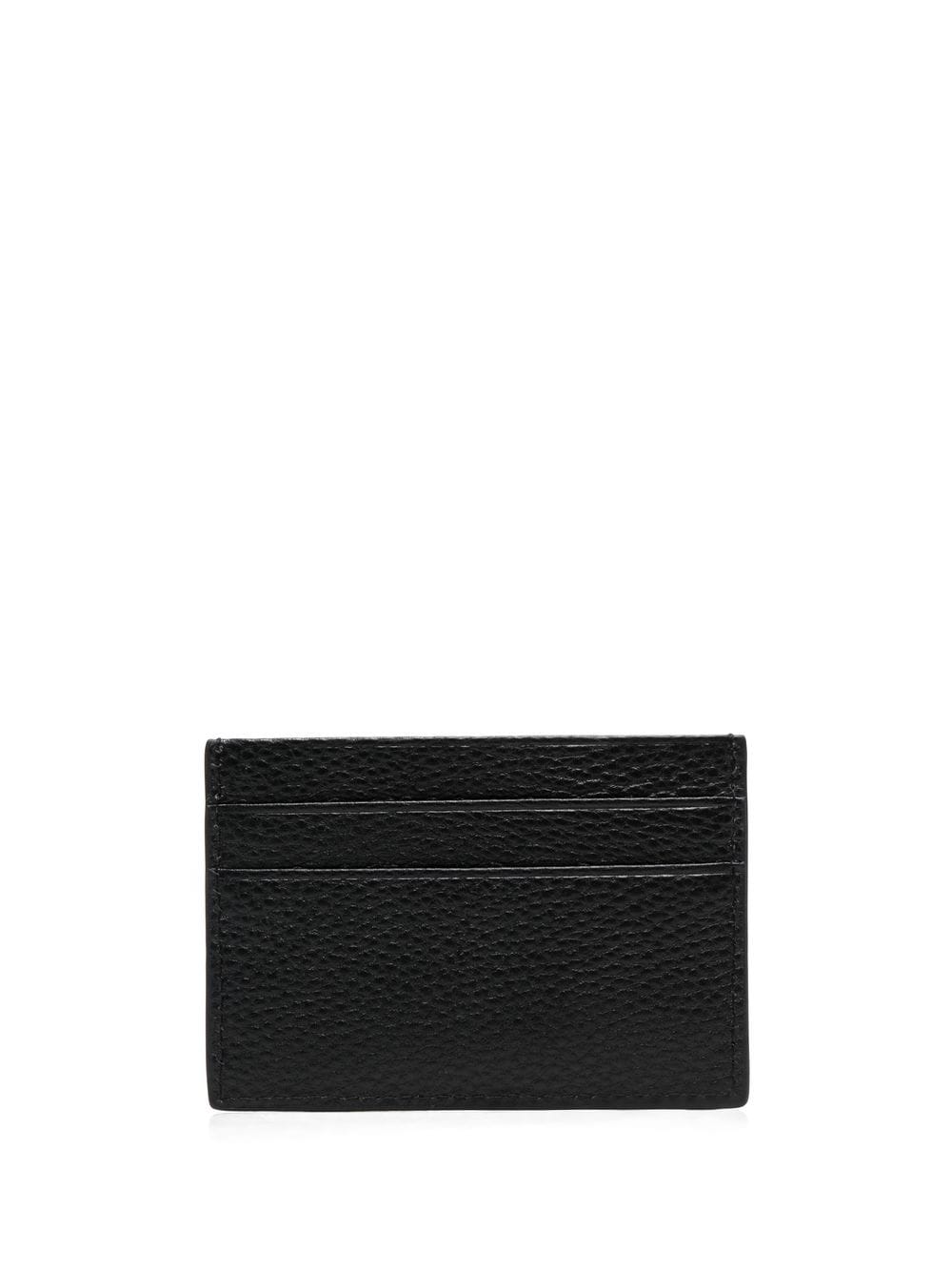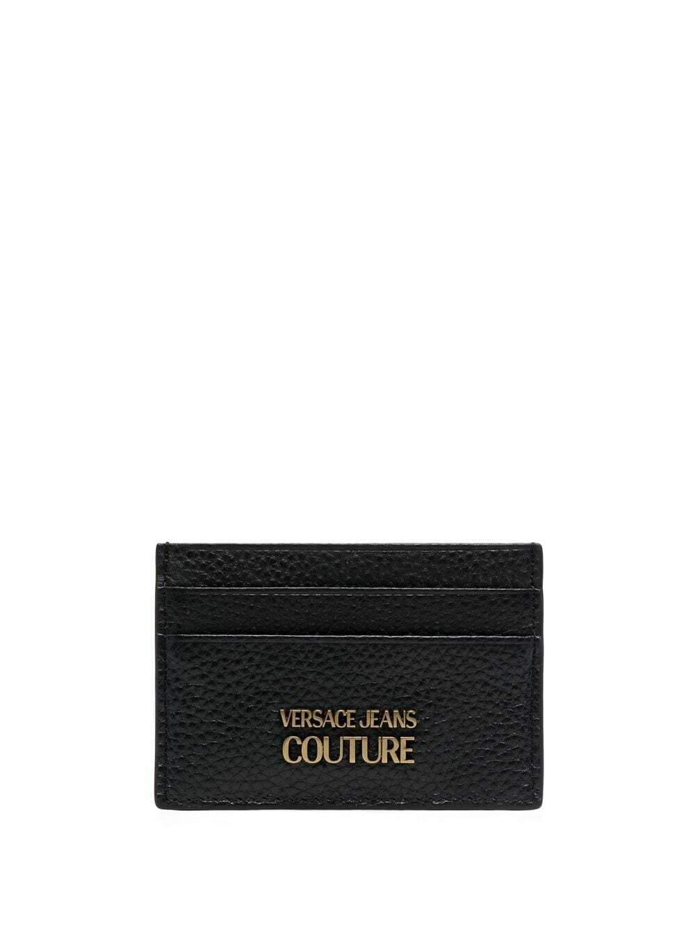 logo-plaque leather wallet from VERSACE JEANS COUTURE featuring black, calf leather, grained texture, gold-tone logo plaque, card slots, rear card slots and note compartment.