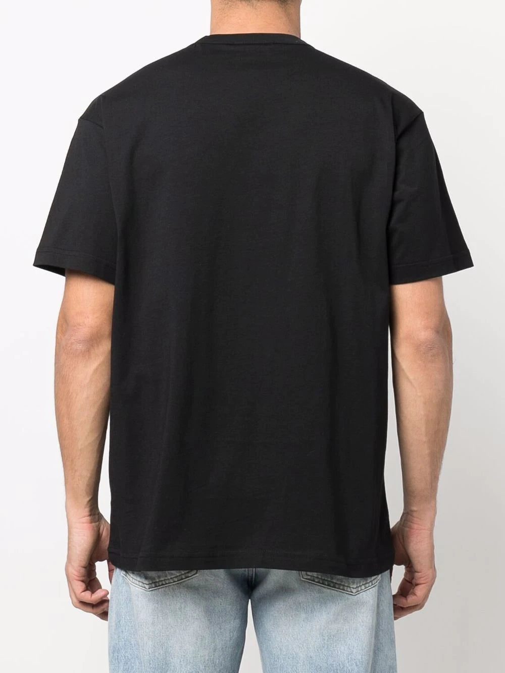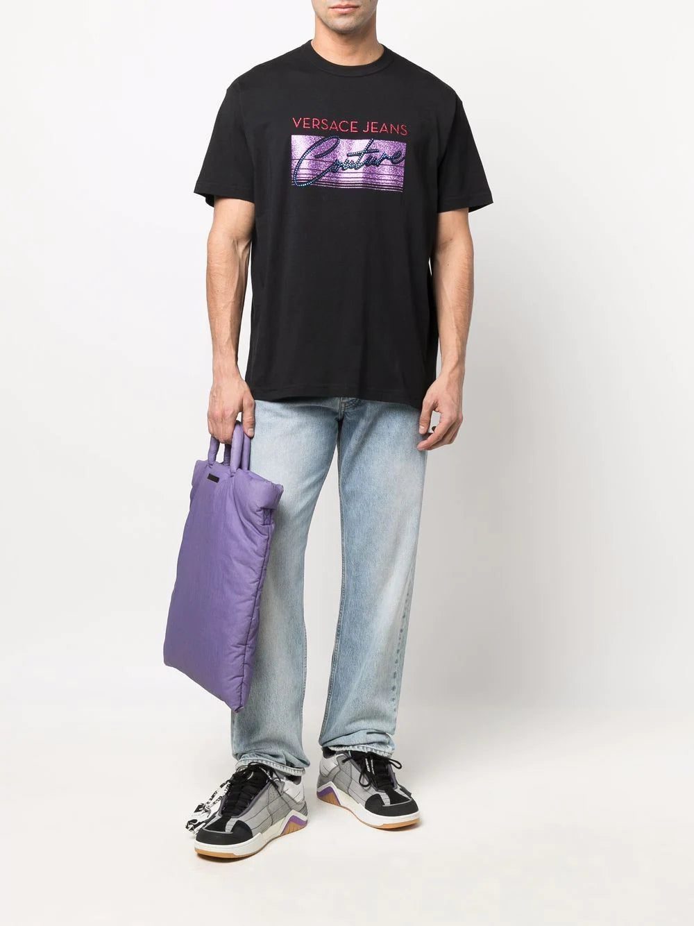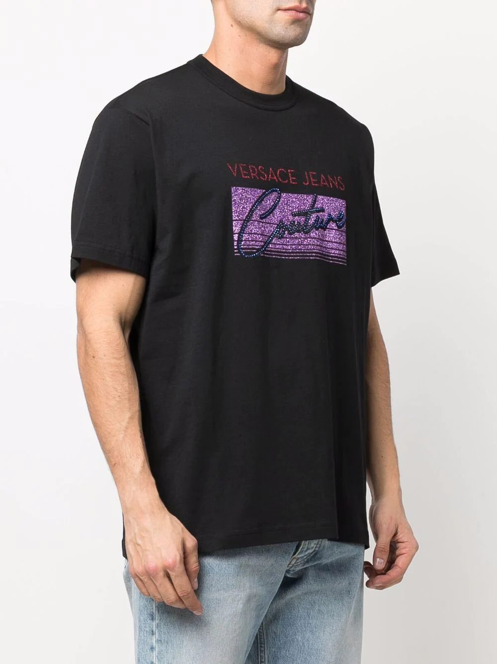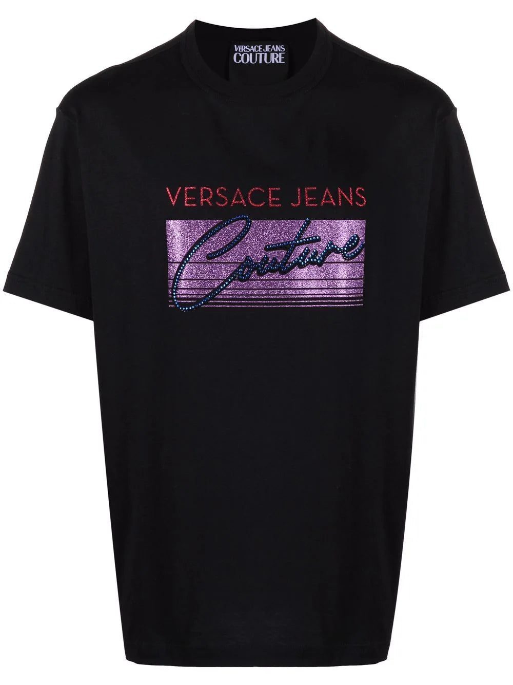 Resembling an 80's aesthetic, the Versace Jeans Couture logo appears on multicoloured glitter and studs, contrasting the black background. Made of 100% cotton, with a round neck and short sleeves.