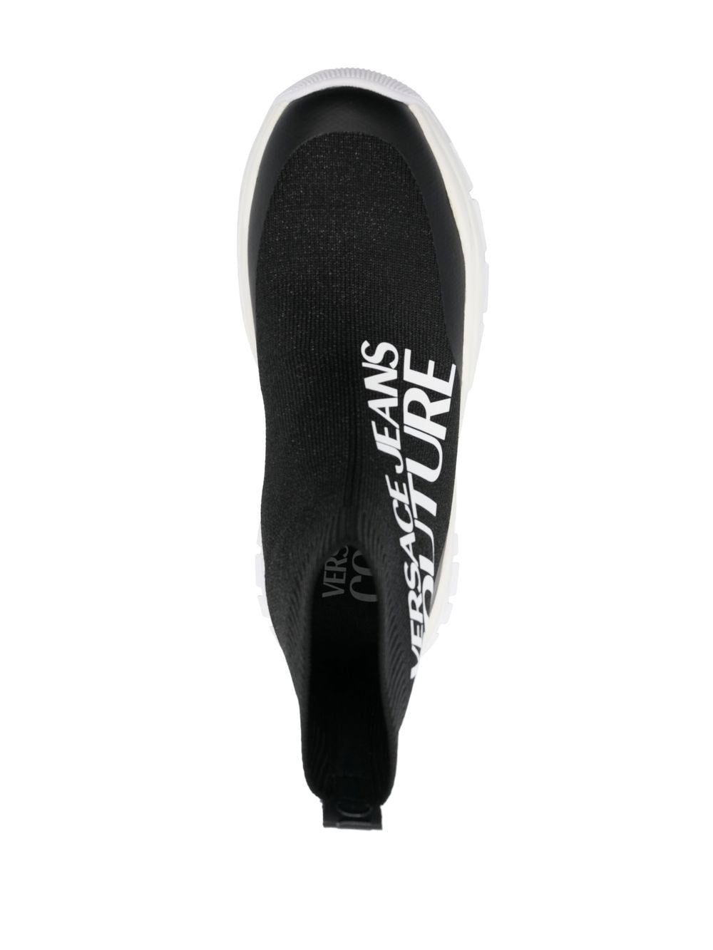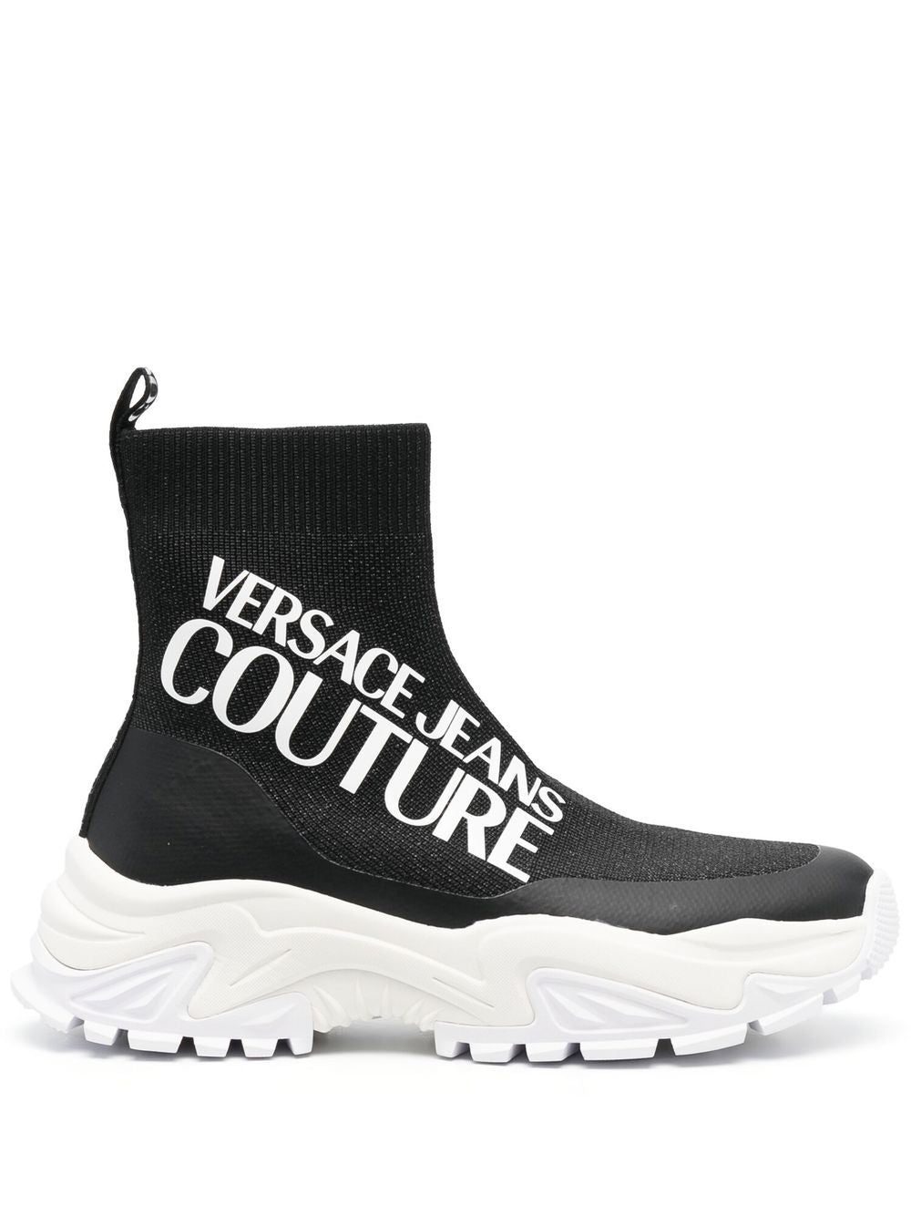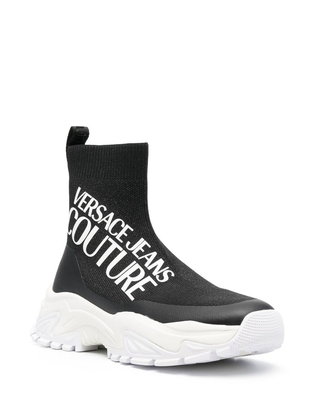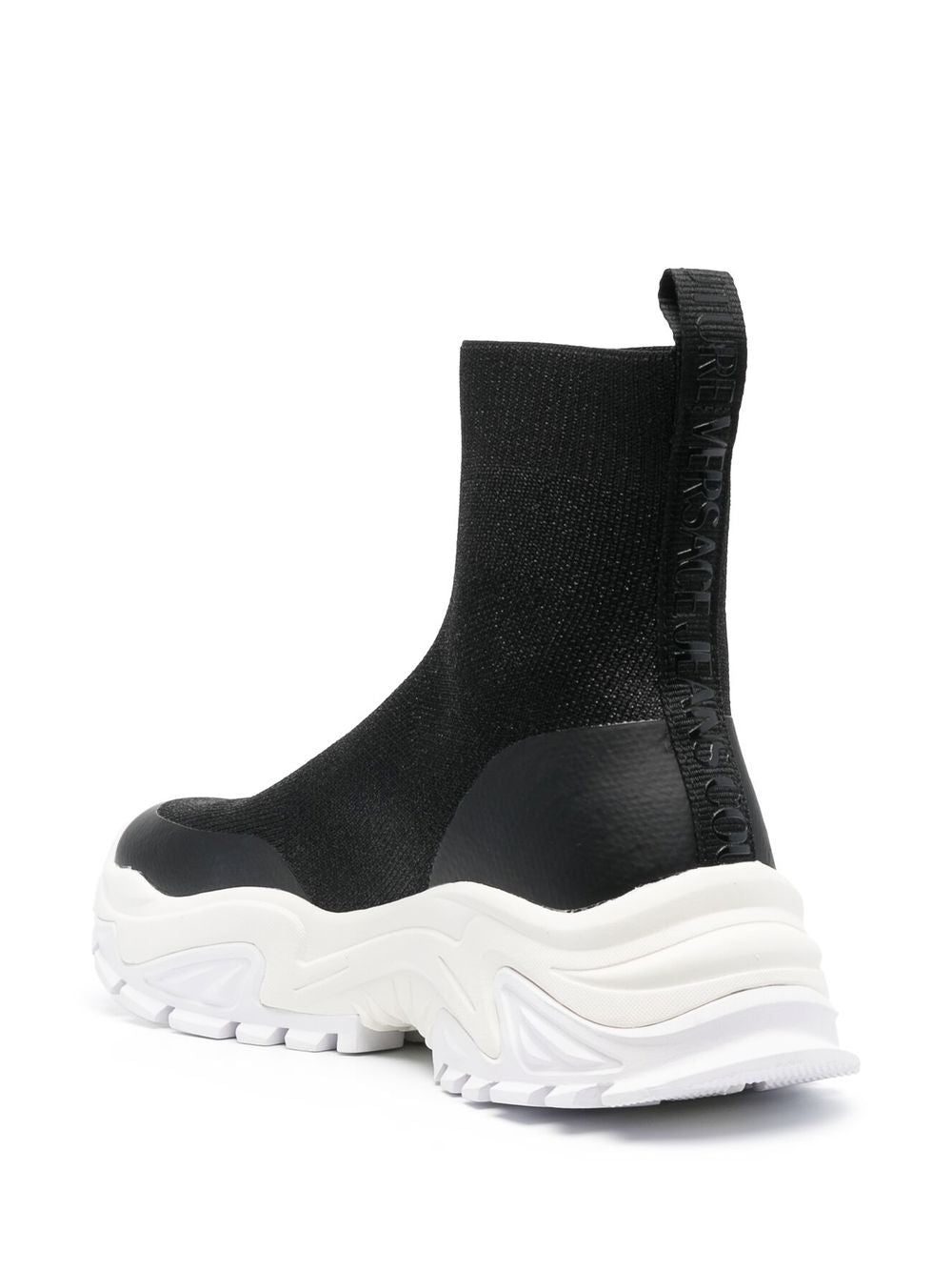 black/white knitted upper sock-style ankle logo print to the side metallic sheen ribbed cuffs pull-tab at the heel branded footbed round toe chunky rubber sole ankle-length