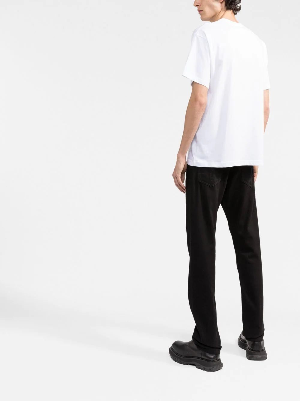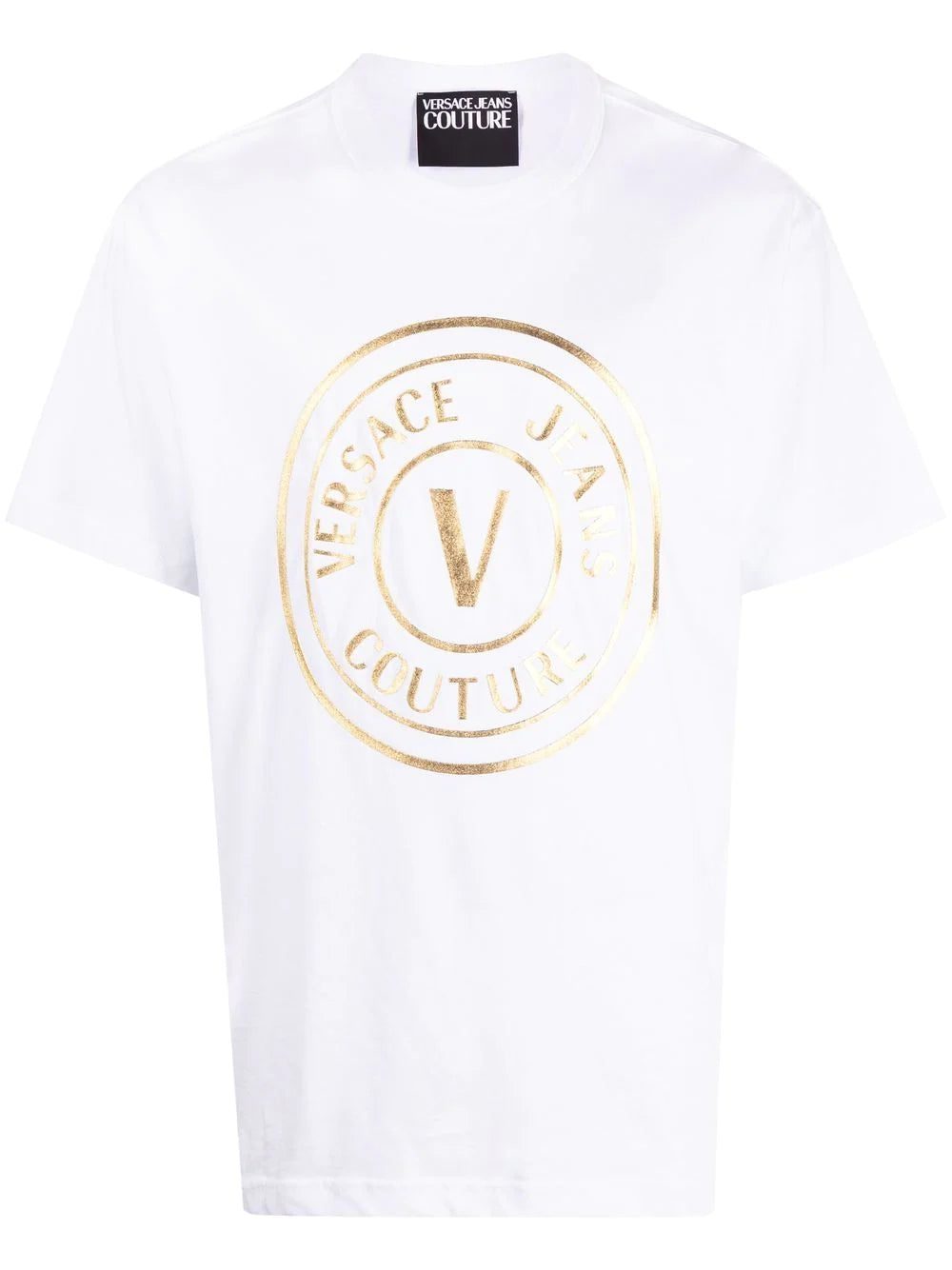 Versace Jeans Couture brands this white T-shirt with its logo across the front in a gold-tone style that speaks to the brand's decadent style vision.