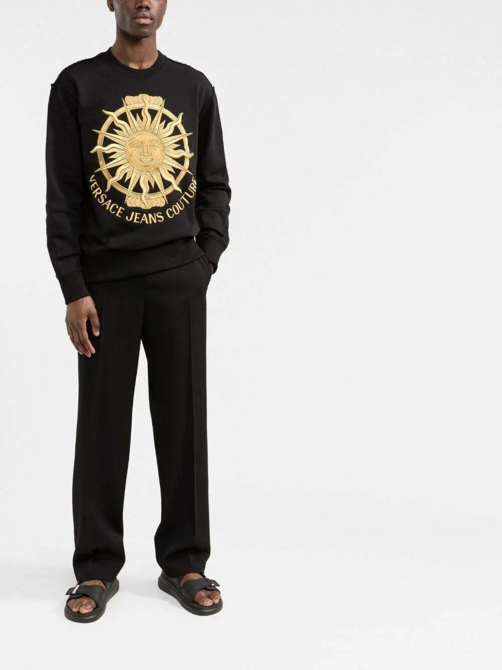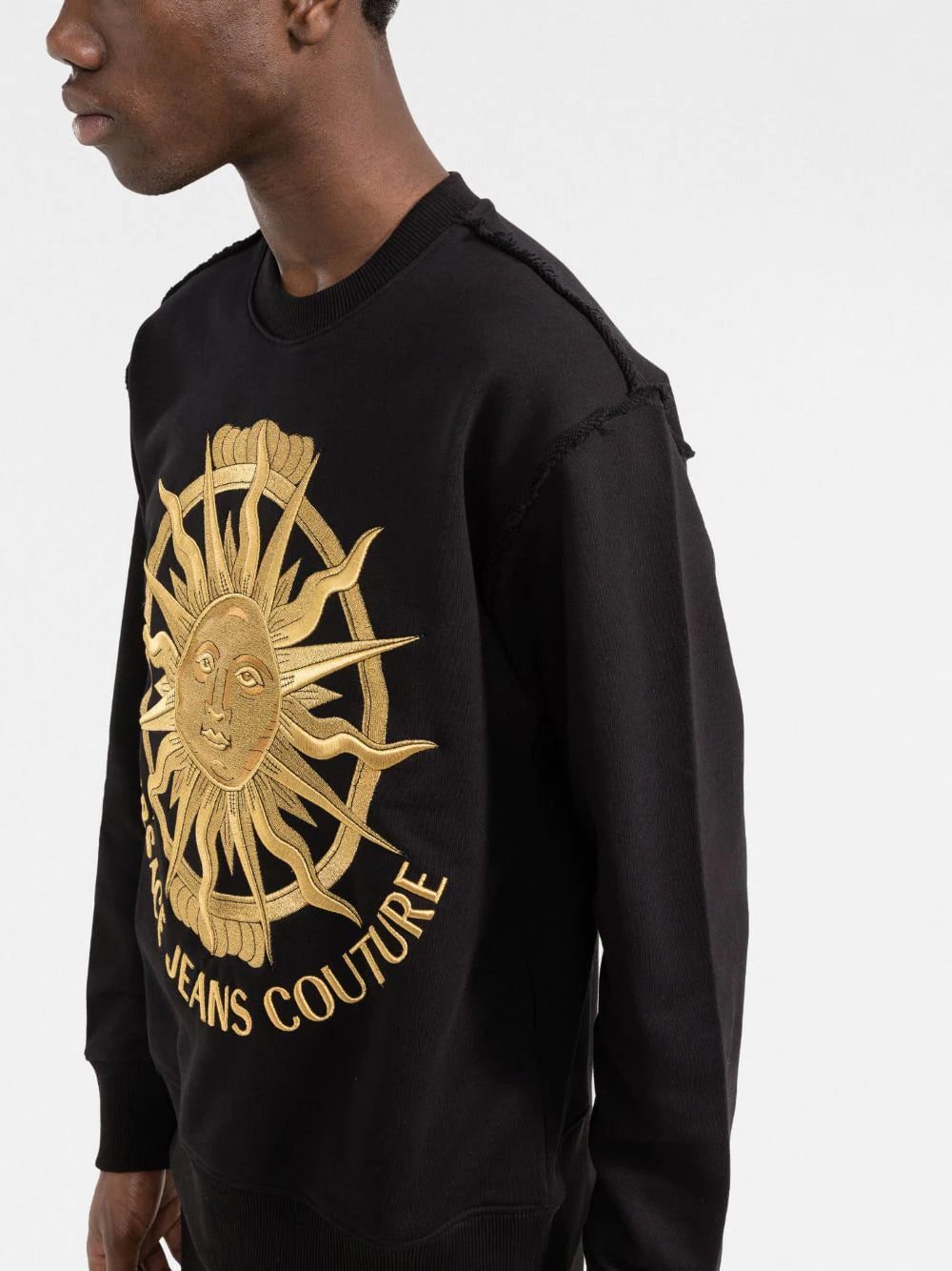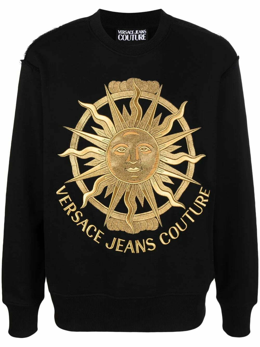 Presented with a black soft cotton construction, this crew-neck sweatshirt from Versace Jeans Couture is adorned with the signature Medusa head and logo print embroidered to the front in a gold tone.