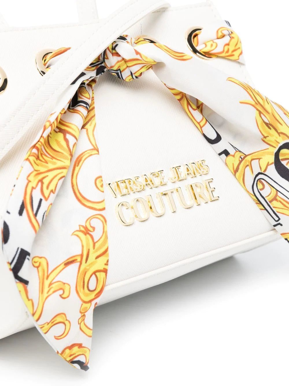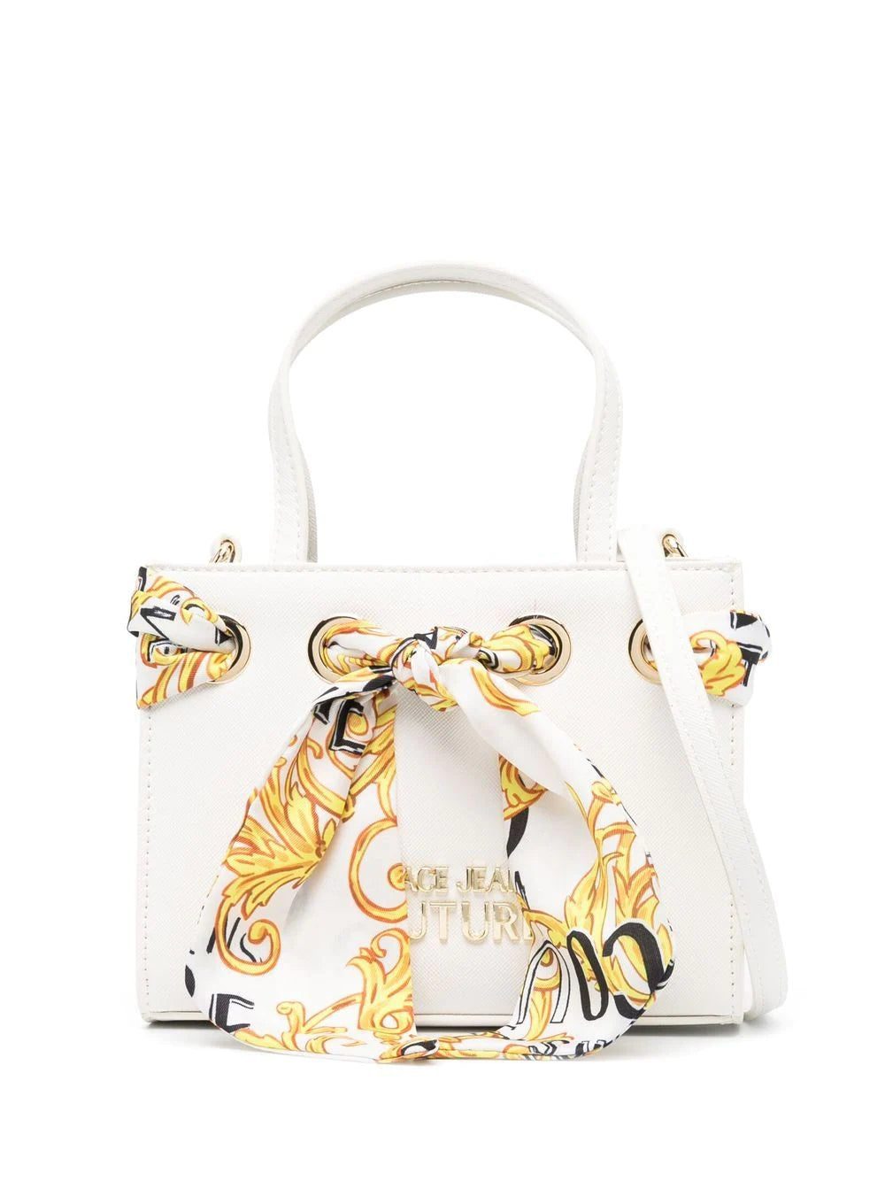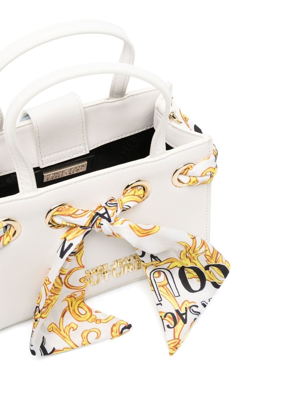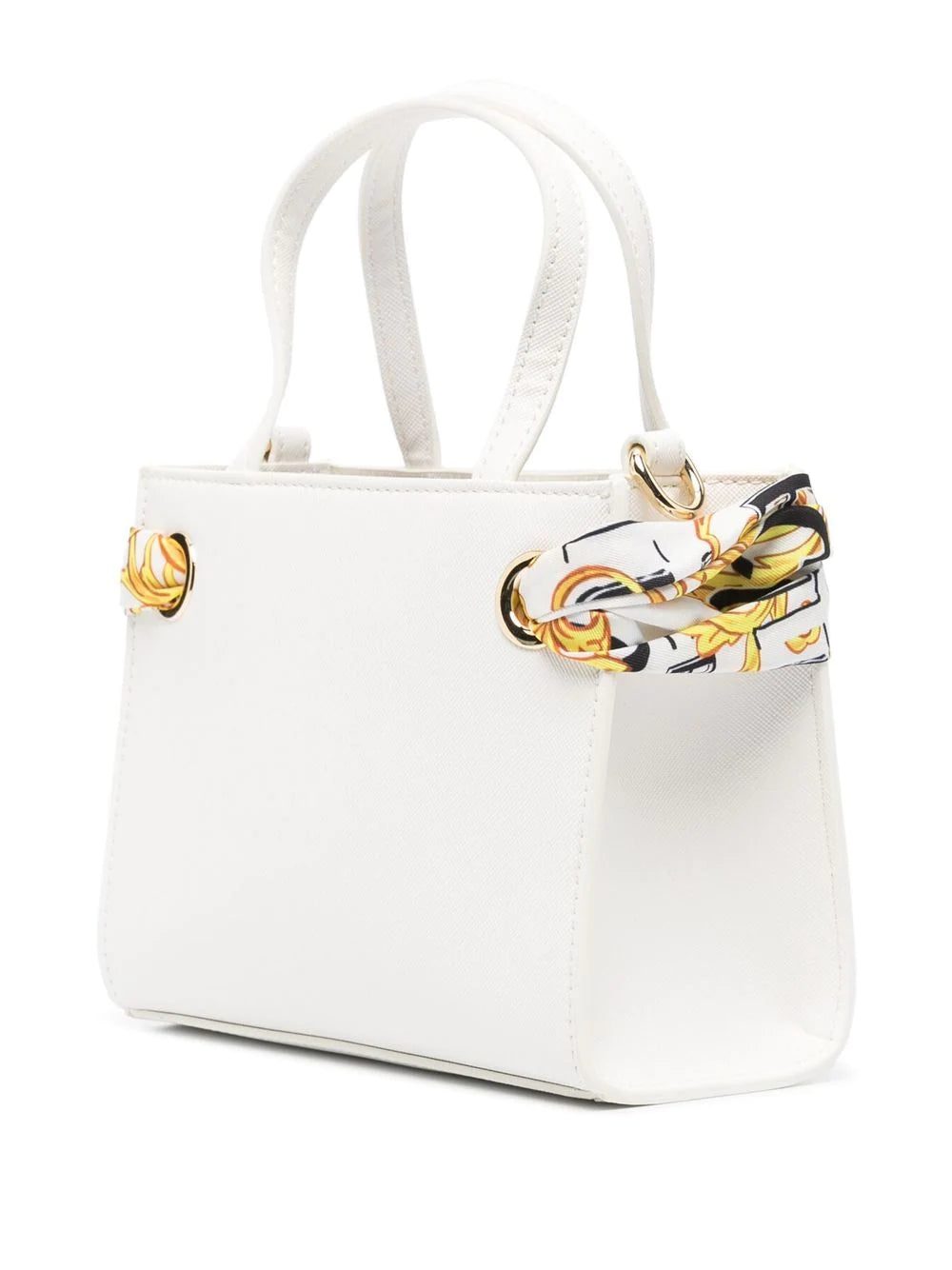 Defined by its structured main compartment, this small white tote by VERSACE JEANS COUTURE is infused with the house's heritage and penchant for bold motifs as shown by a Barocco printed scarf detail.