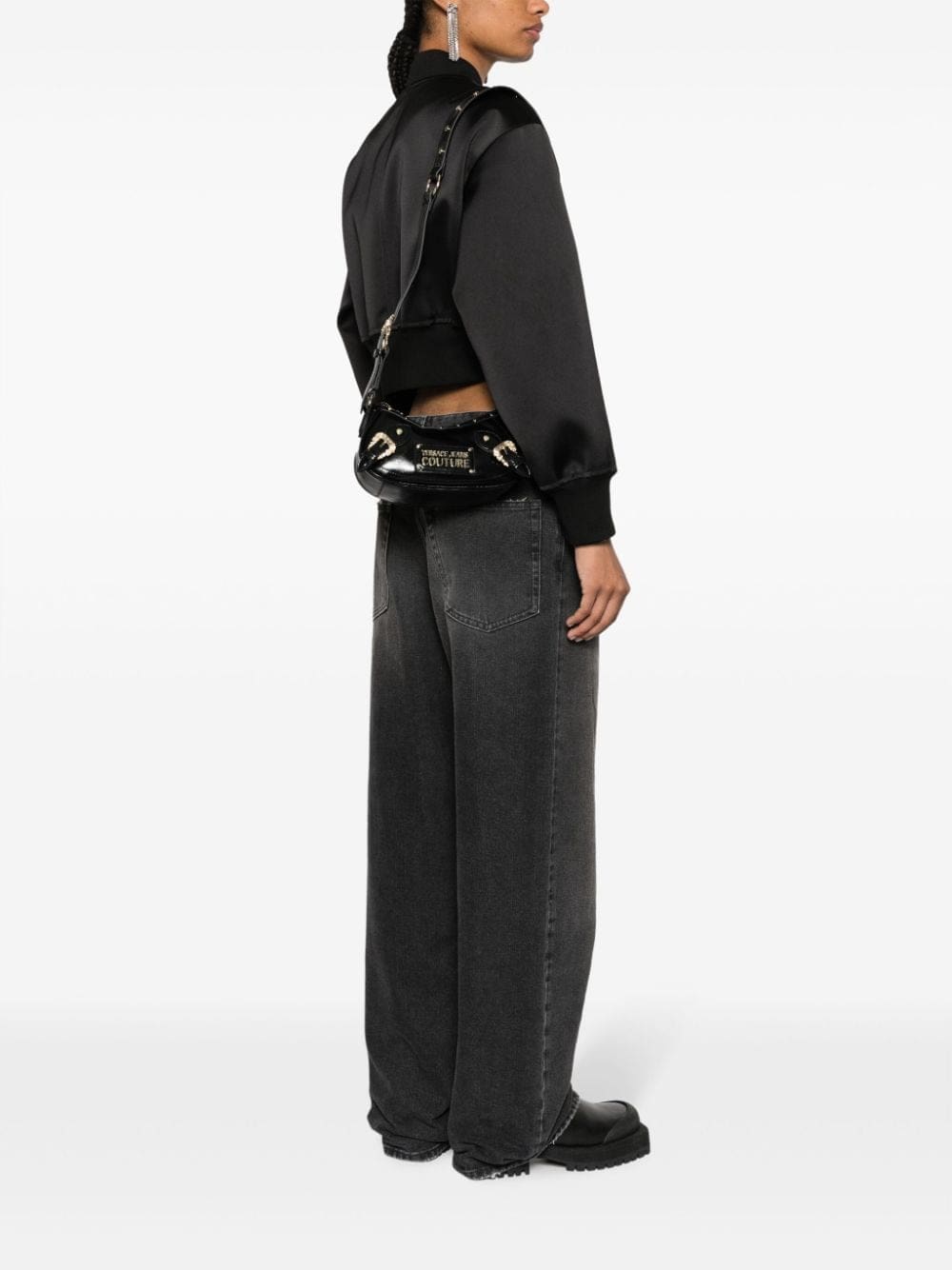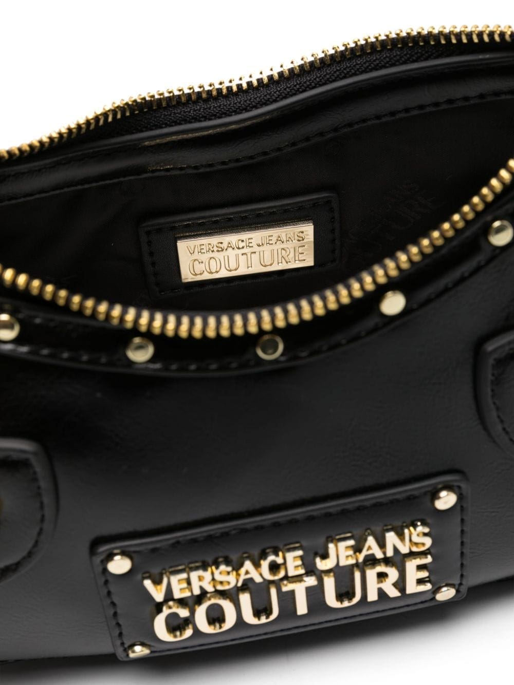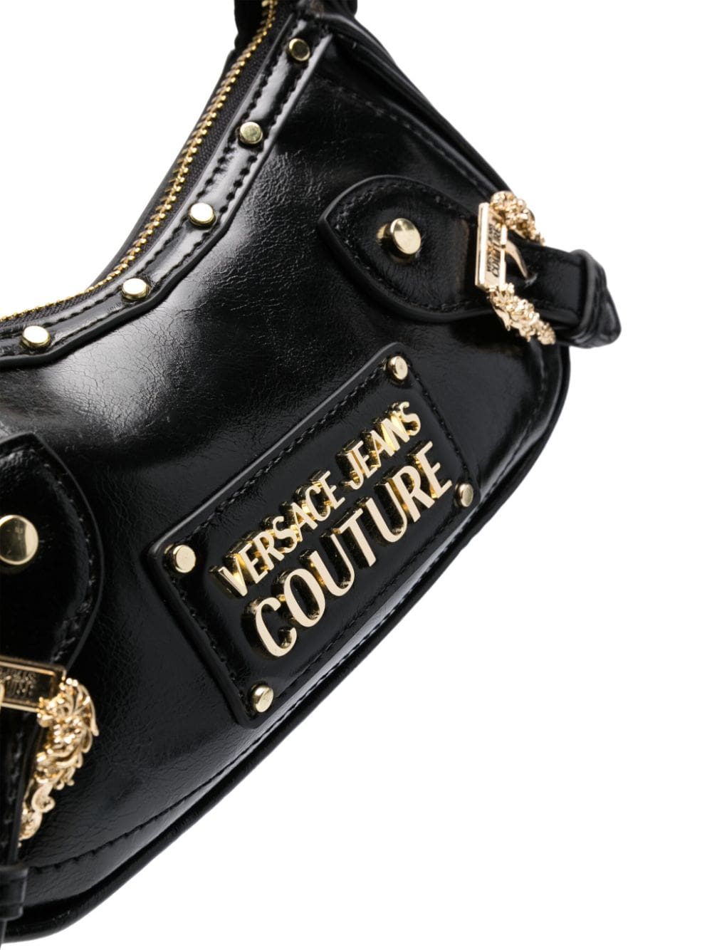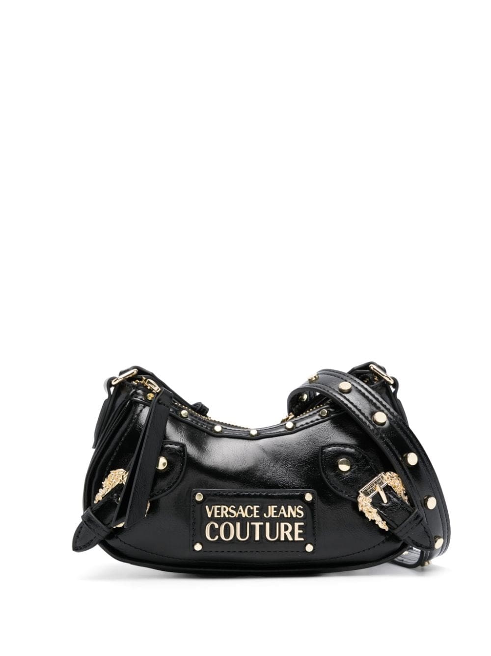 Adorned with metallic accents, this black Versace Jeans Couture bag fuses functionality with a rebellious edge. Cut to a curved silhouette held by an adjustable, detachable shoulder strap, it boasts a faux-leather construction punctuated by hard-edged gold-tone studs, logo lettering and Baroque buckles.