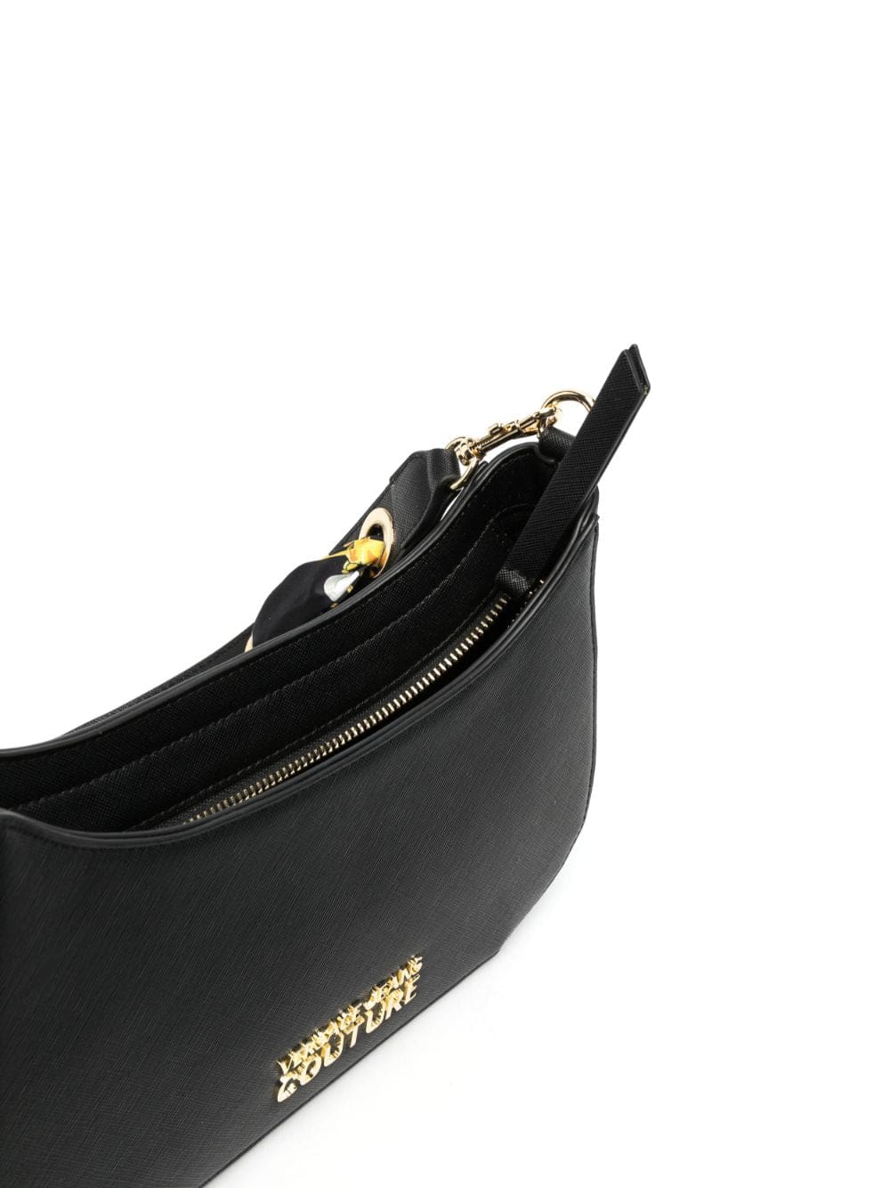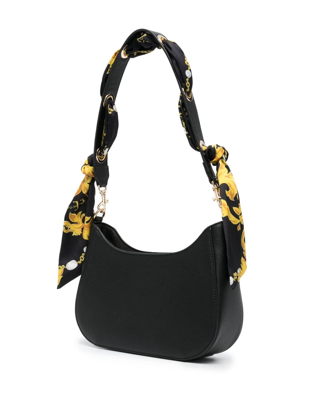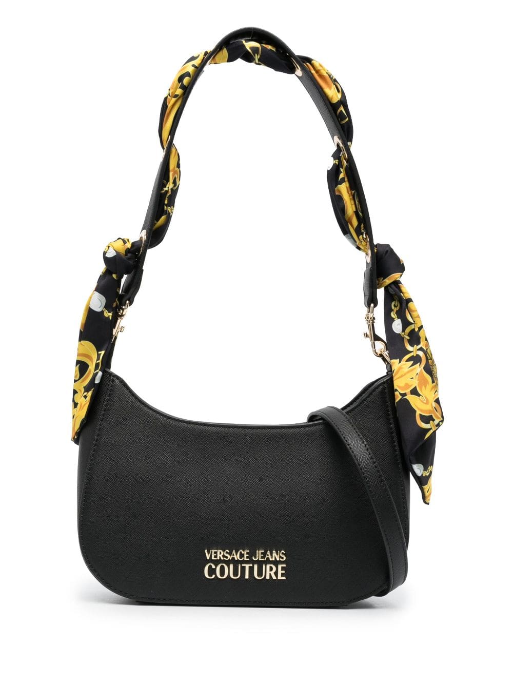 Versace Jeans Couture spotlights its house codes with this Thelma shoulder bag. The black faux-leather construction is adorned with gold-tone logo lettering and the strap is interlaced with a Chain Couture-print scarf in a coordinating palette.