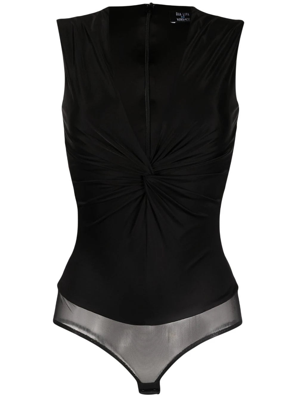 A departure from its hallmark bold prints, Versace showcases its demure side with this black bodysuit. It’s crafted from stretch jersey to a plunging V-neck silhouette that’s enhanced with knotted detailing.