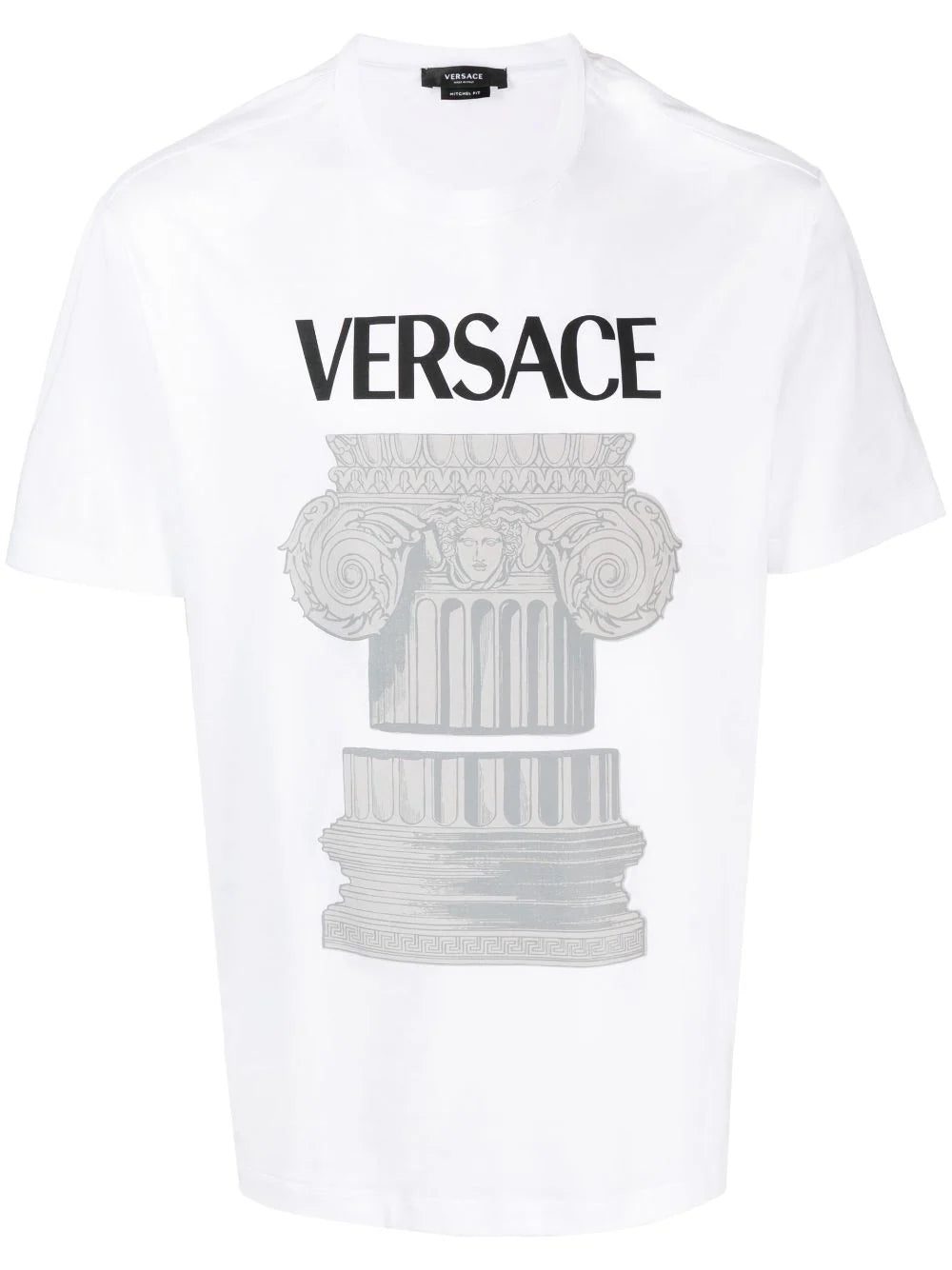 Versace's T-shirt is emblazoned with the brand's signature in contrasting black letters as well as a motif depicting ancient ruins. The Italian house's affinity for archaeological remains can be seen as early as founder Gianni Versace selecting the Medusa head logo after seeing it in archaic sites he and his siblings played in growing up.