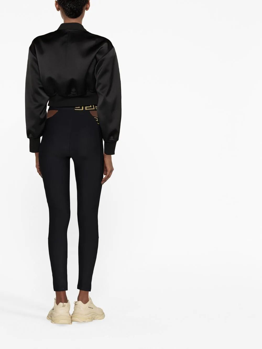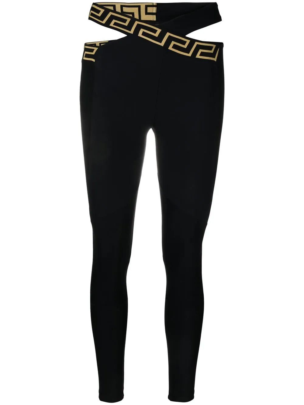 Crafted with a stretch design, these black leggings from Versace are detailed with a crossover waistband adorned with a gold-tone Greca motif.
