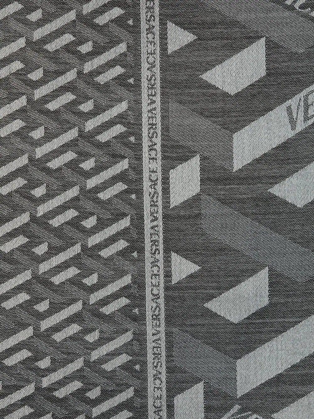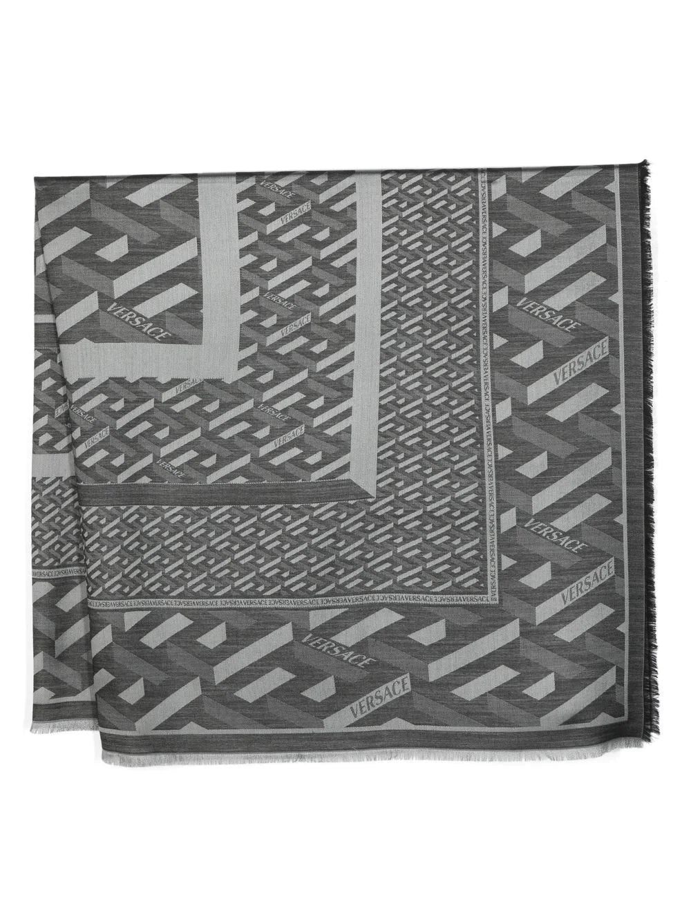 La Greca geometric-pattern scarf from Versace featuring black/grey, wool-silk blend, signature La Greca print, geometric embroidery and fringed edge.