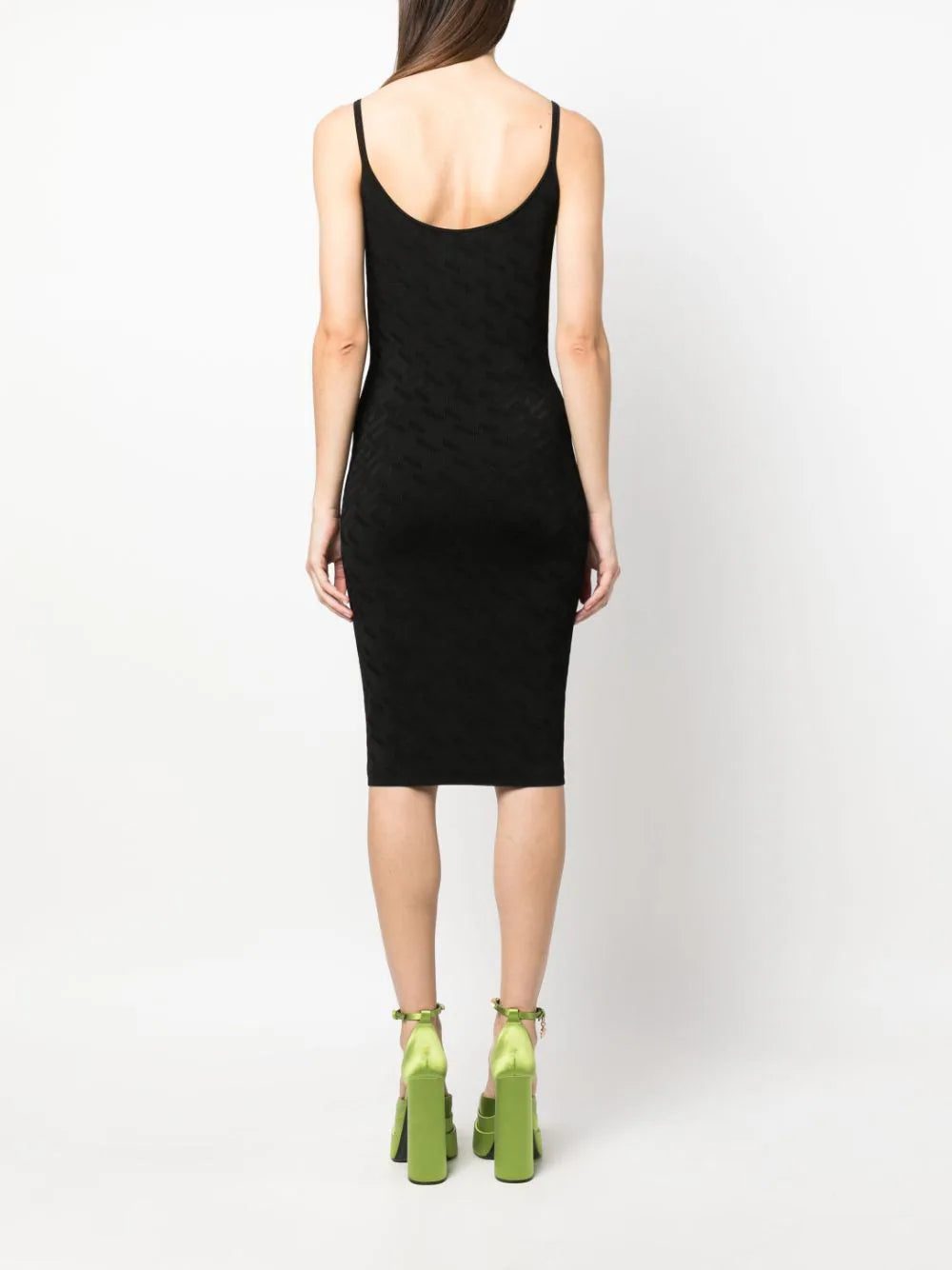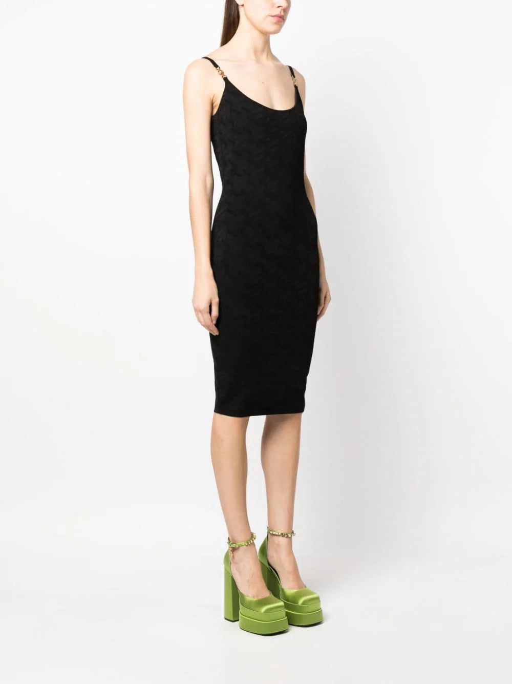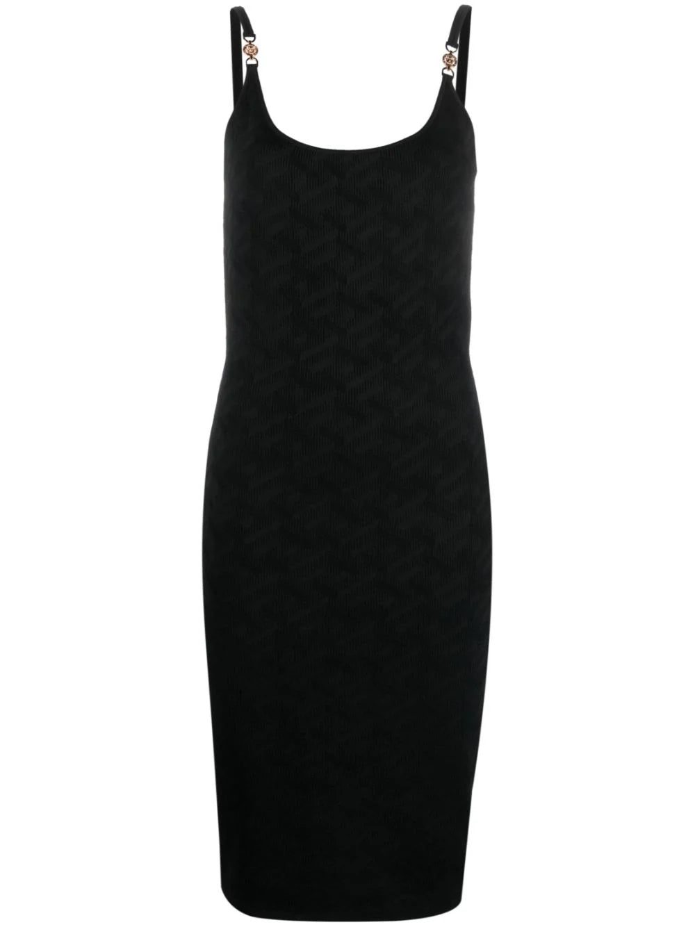Versace showcases its propensity for inventive knitwear with this dress. Spun with an intarsia La Greca pattern, it’s suspended by slender straps secured with gold-tone Medusa Head plaques.