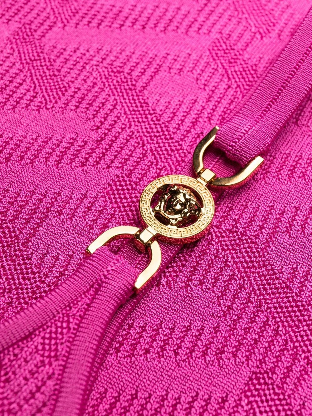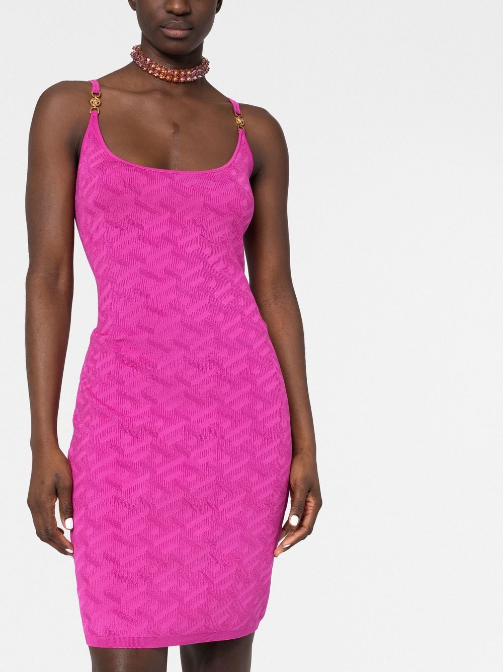 Inspired by a classic Greek Key, Versace's La Greca pattern was first introduced in 1988 to mean 'infinity and unity'. It makes a subtle appearance on this dress, blending into its knitted pattern, as two Medusa Head plaques appear on the straps for an added covetable motif.