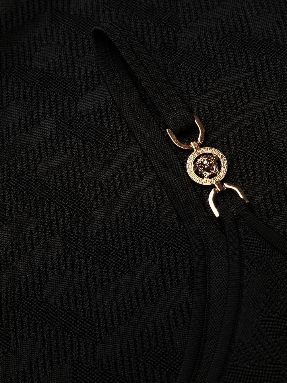 Inspired by a classic Greek Key, Versace's La Greca pattern was first introduced in 1988 to mean 'infinity and unity'. It makes a subtle appearance on this dress, blending into its knitted pattern, as two Medusa Head plaques appear on the straps for an added covetable motif.