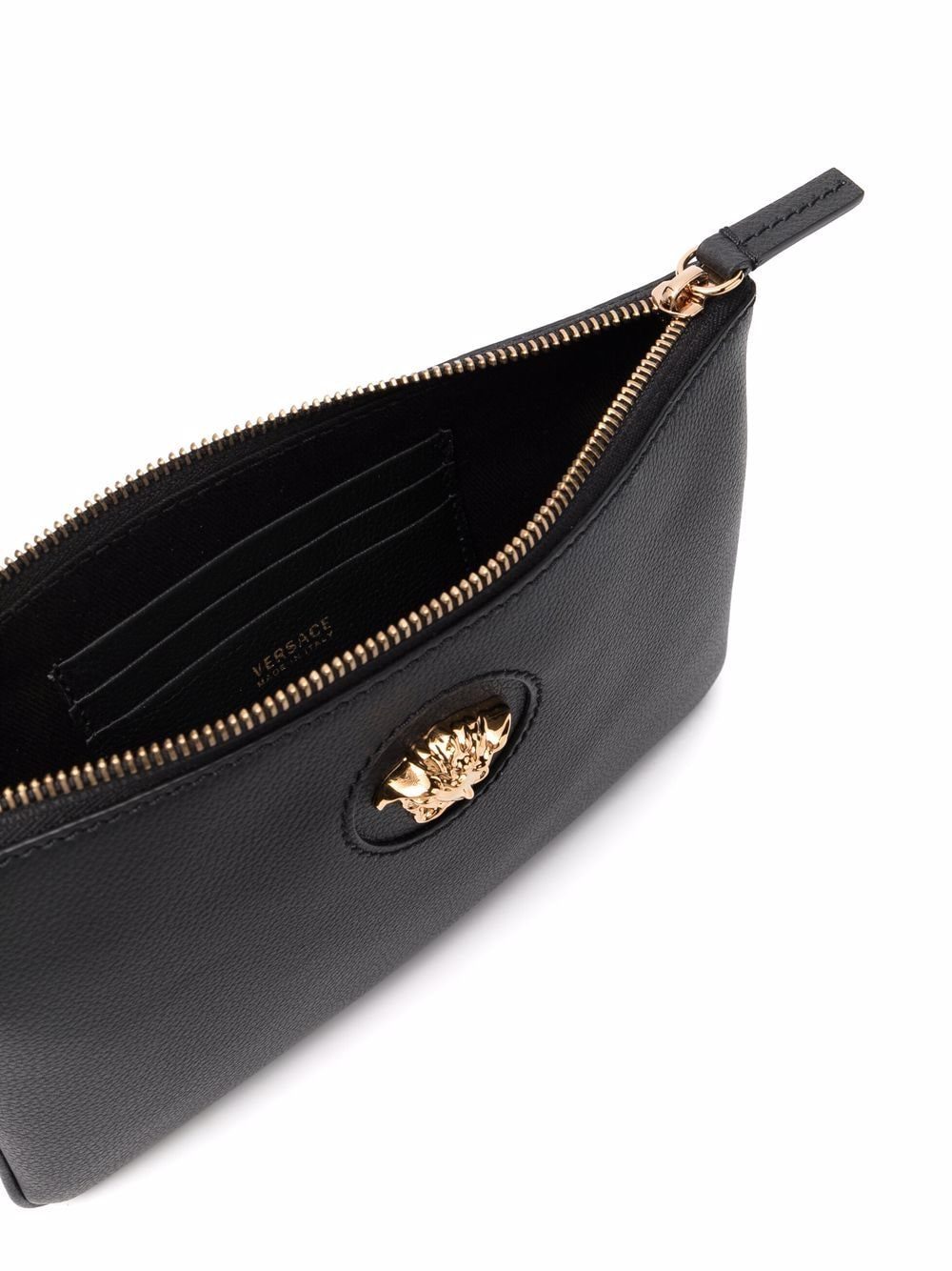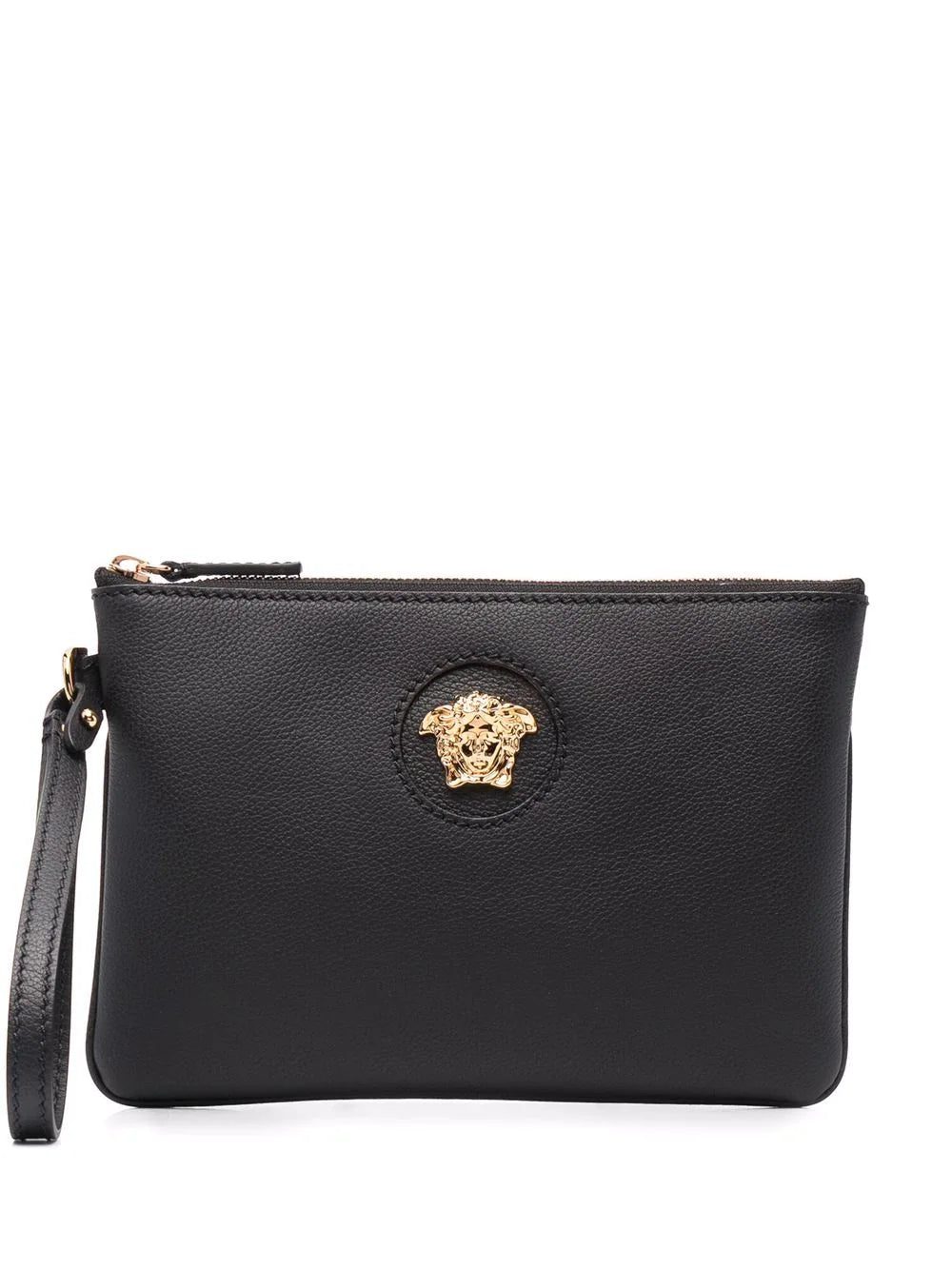 Inspired by the décor of the House's Milanese villa, the Medusa Head consistently reappears in Versace's work. For AW21, it's reworked in a sleek gold-tone metal and placed in all its glory to the front of this grained leather clutch bag for an iconic and refined finish.