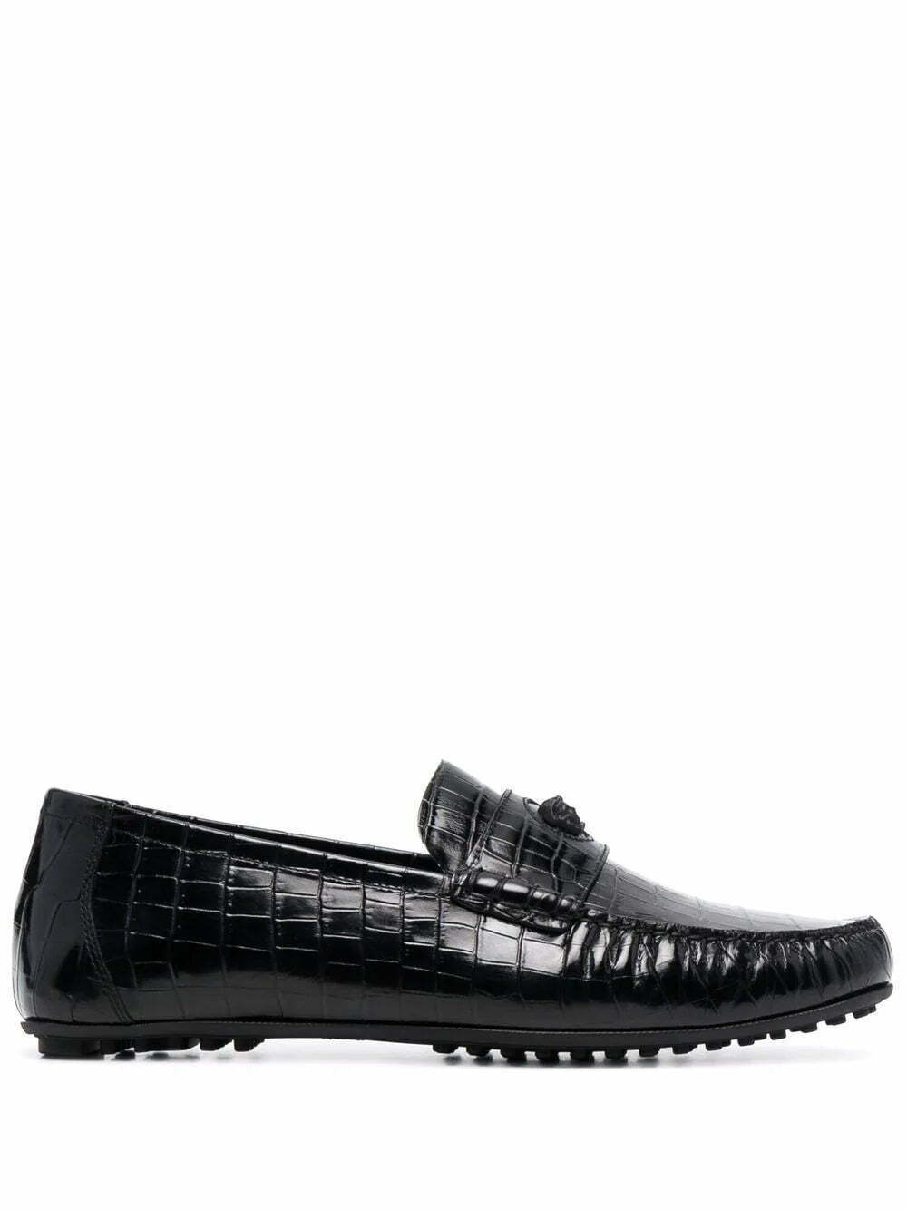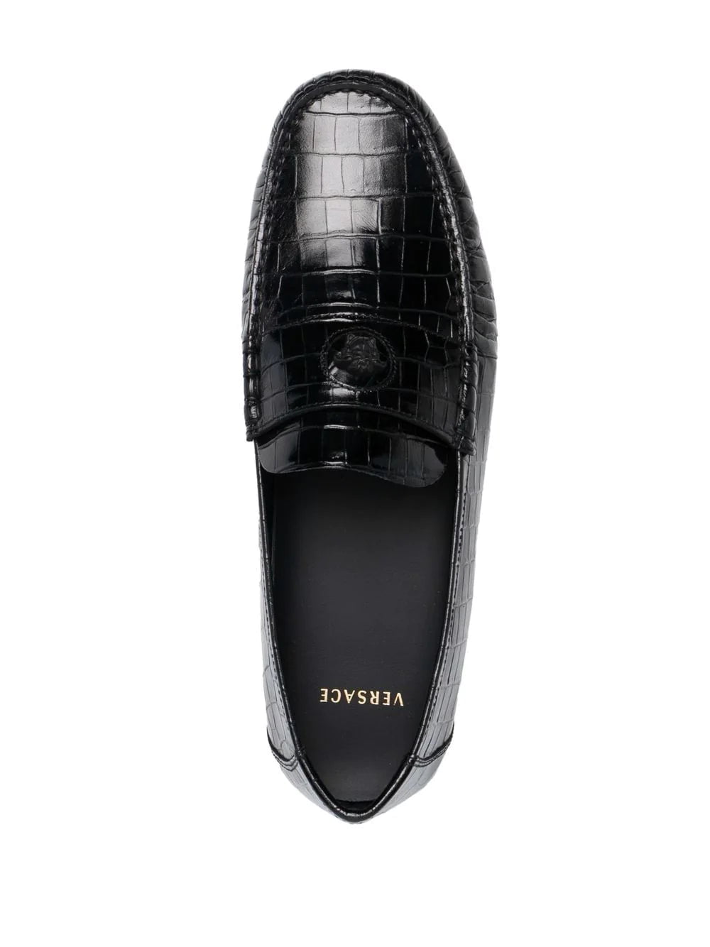 Greek mythology's stone-faced queen, Medusa, has become synonymous with Versace's classically Italian style. Here, she appears in a tonal design adorning the front of these crocodile-effect leather loafers for a subtle yet iconic style statement.