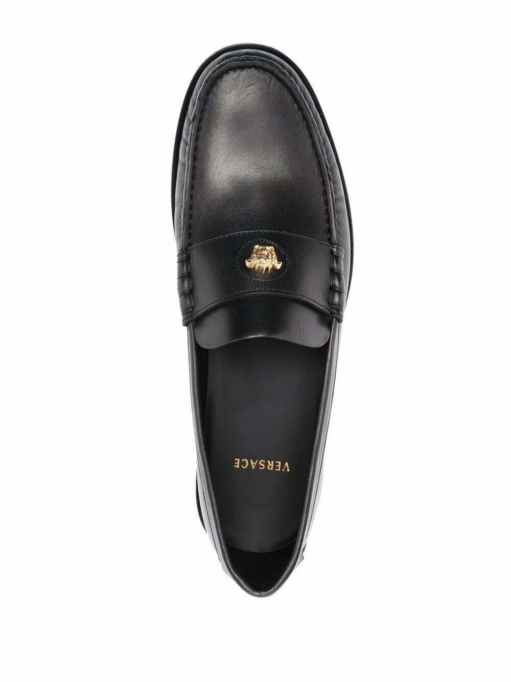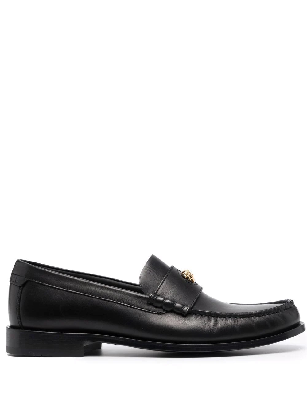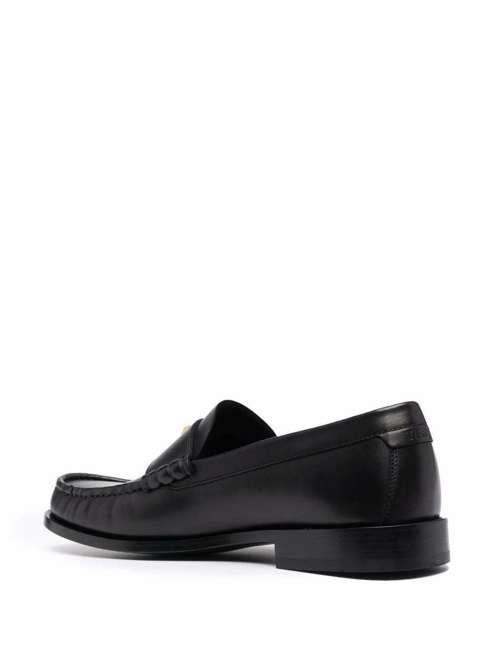 Black/gold-tone leather La Medusa leather loafers from VERSACE featuring Medusa-head motif, round toe, branded leather insole and flat leather sole.