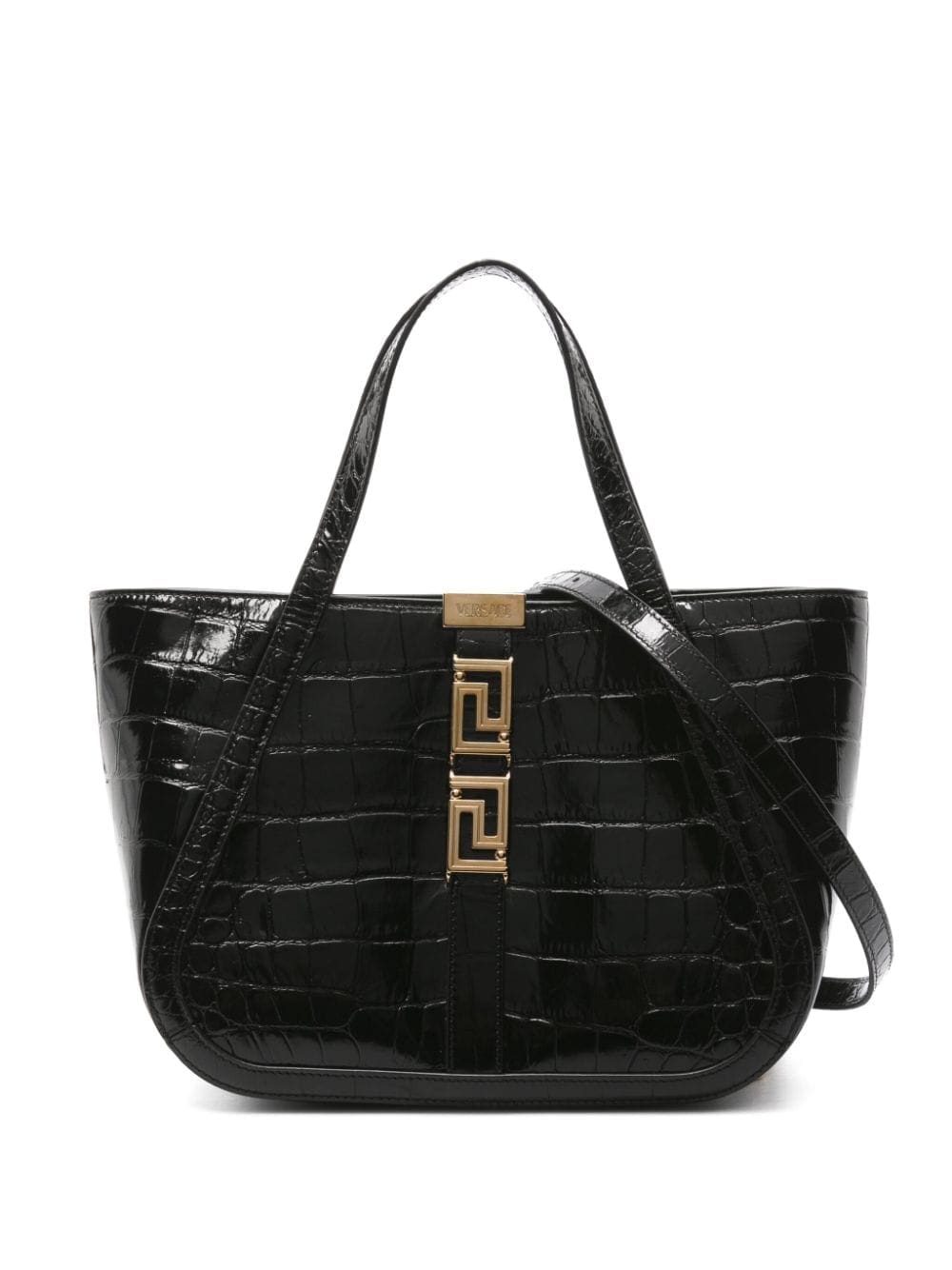 Versace celebrates its enduring house codes in this tote bag. Crafted in Italy from croc-embossed leather, a gold-tone Greca detail adorns its monochromatic construction.