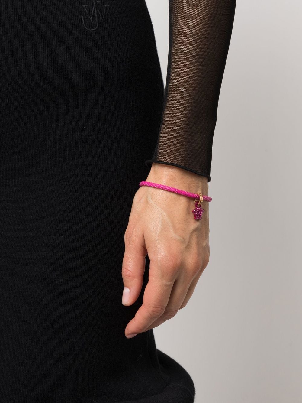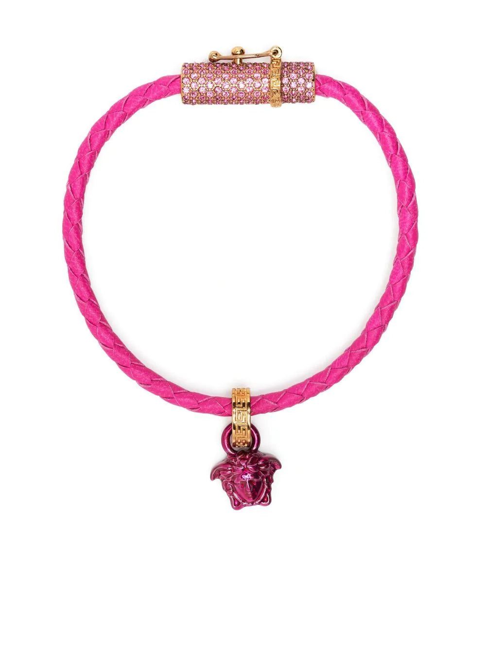 leather crystal-embellished bracelet from Versace featuring hot pink, calf leather, gold-tone hardware, interwoven design, glass crystal embellishment, logo pendant and wraparound bracelet.