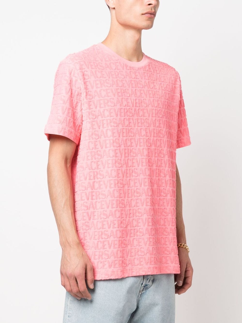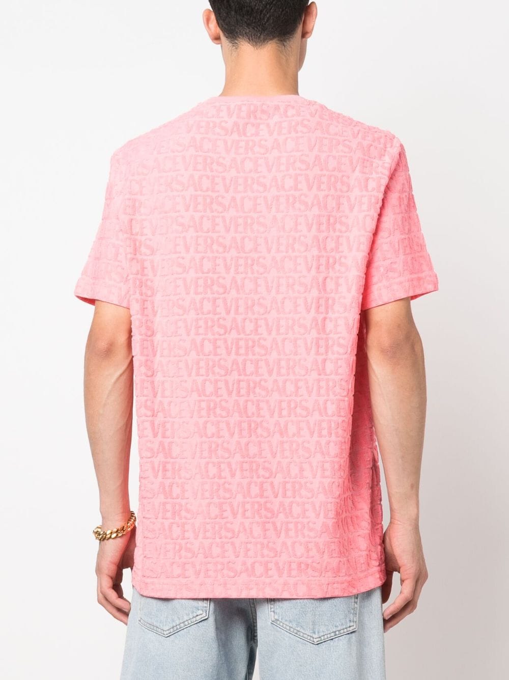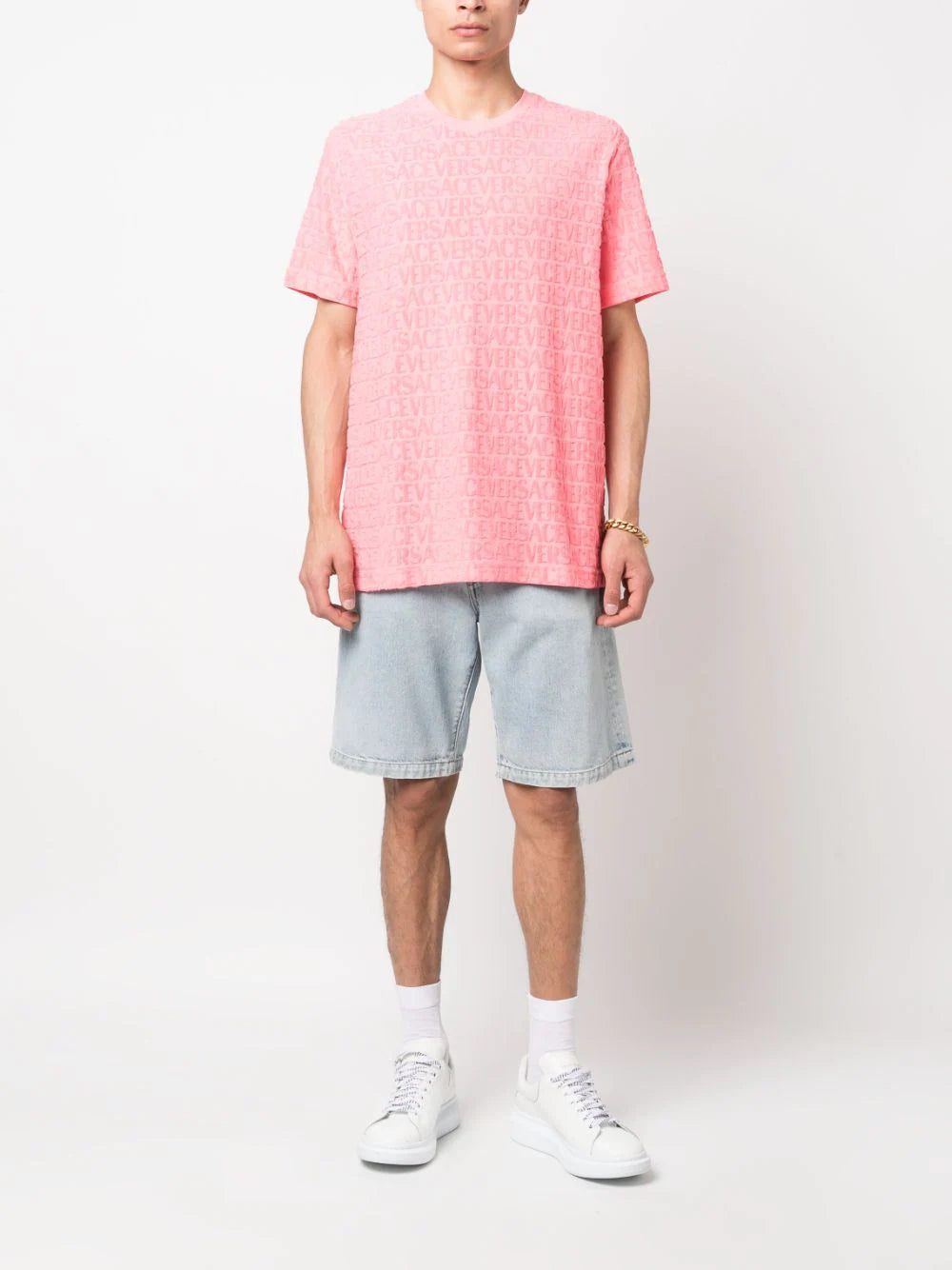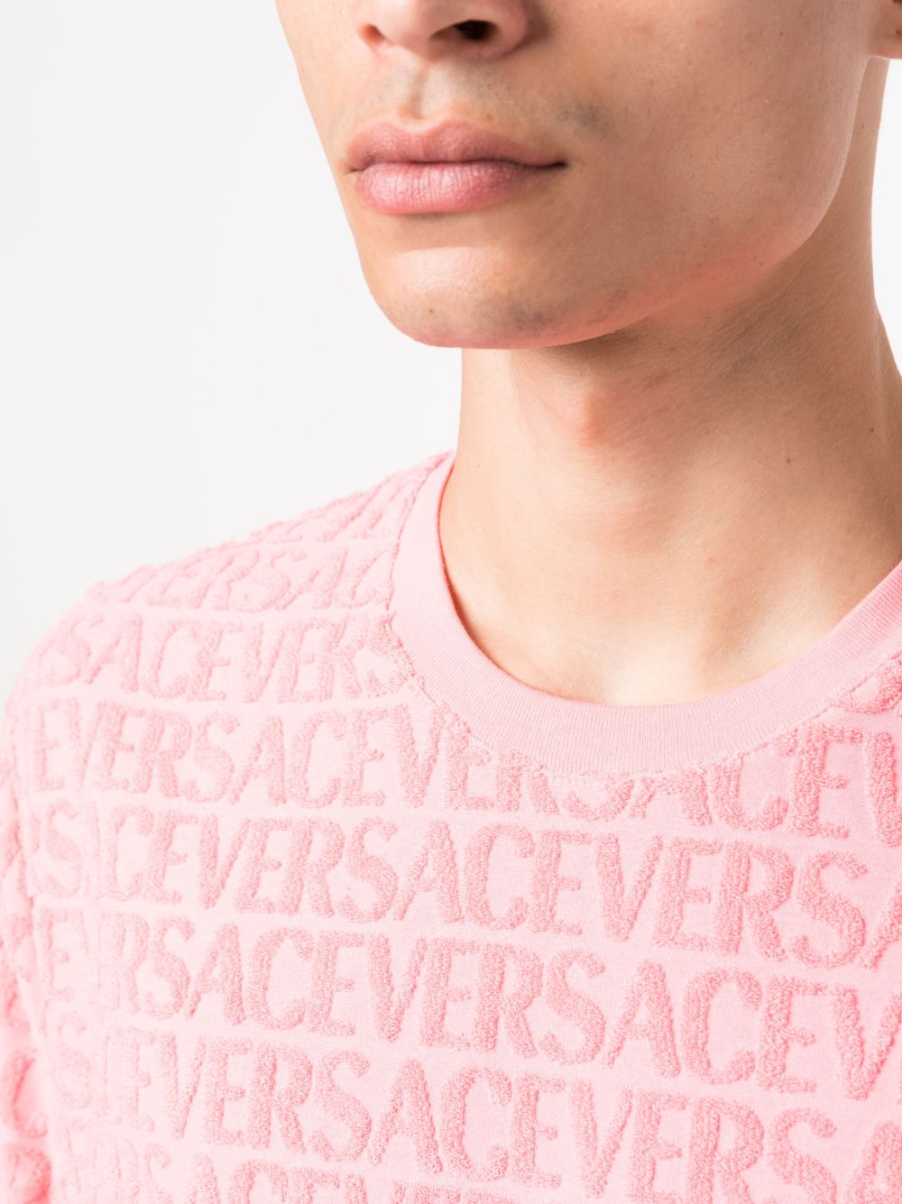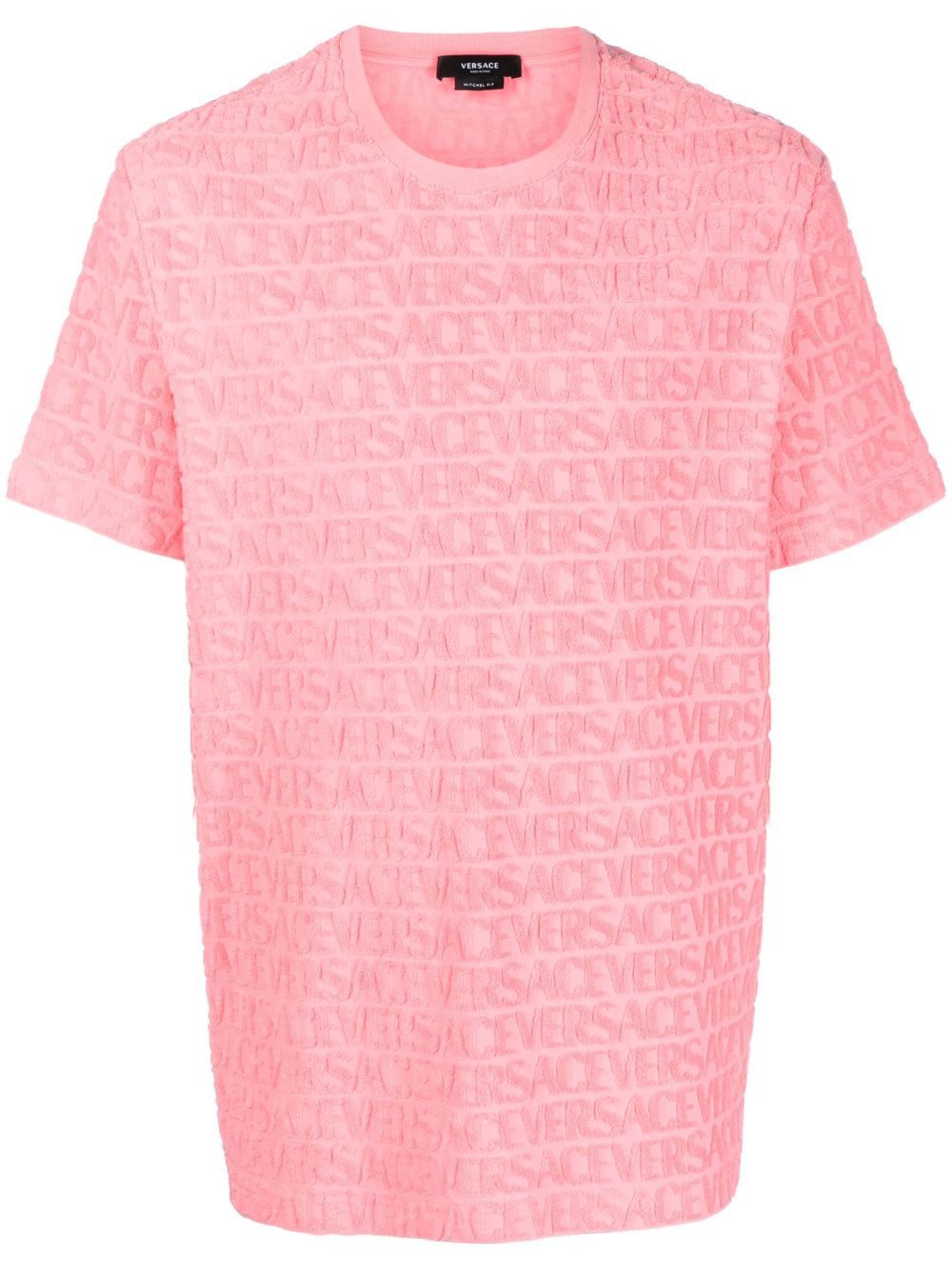 Versace updates the classic T-shirt with all-over embossed logo detailing in soft terry towelling fabric. Crafted from pure cotton, the contemporary T-shirt is delivered in a pastel-pink hue and embodies a summer spirit.