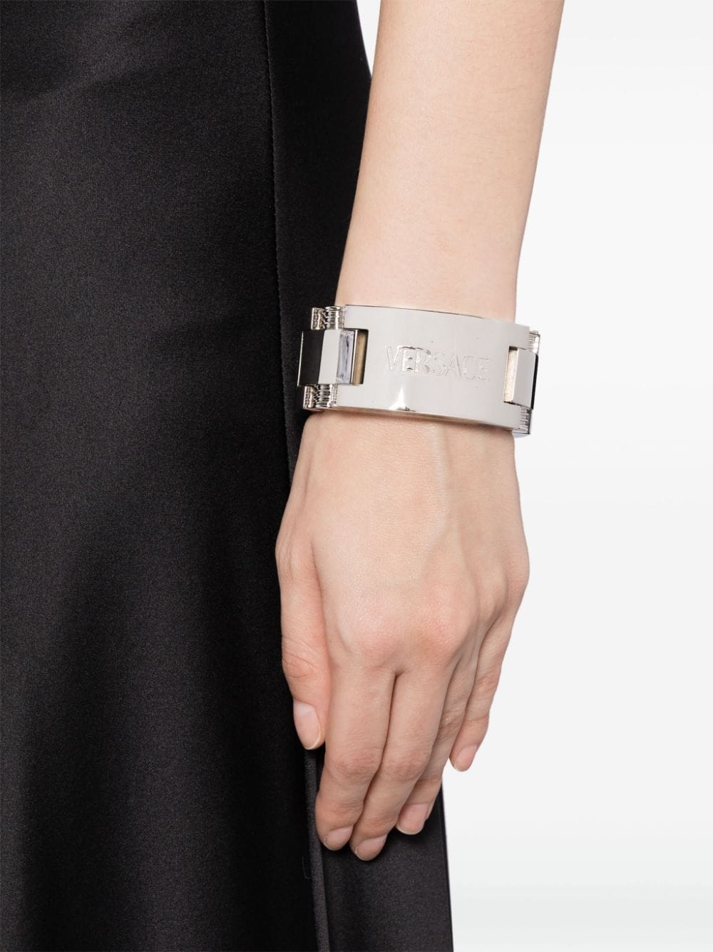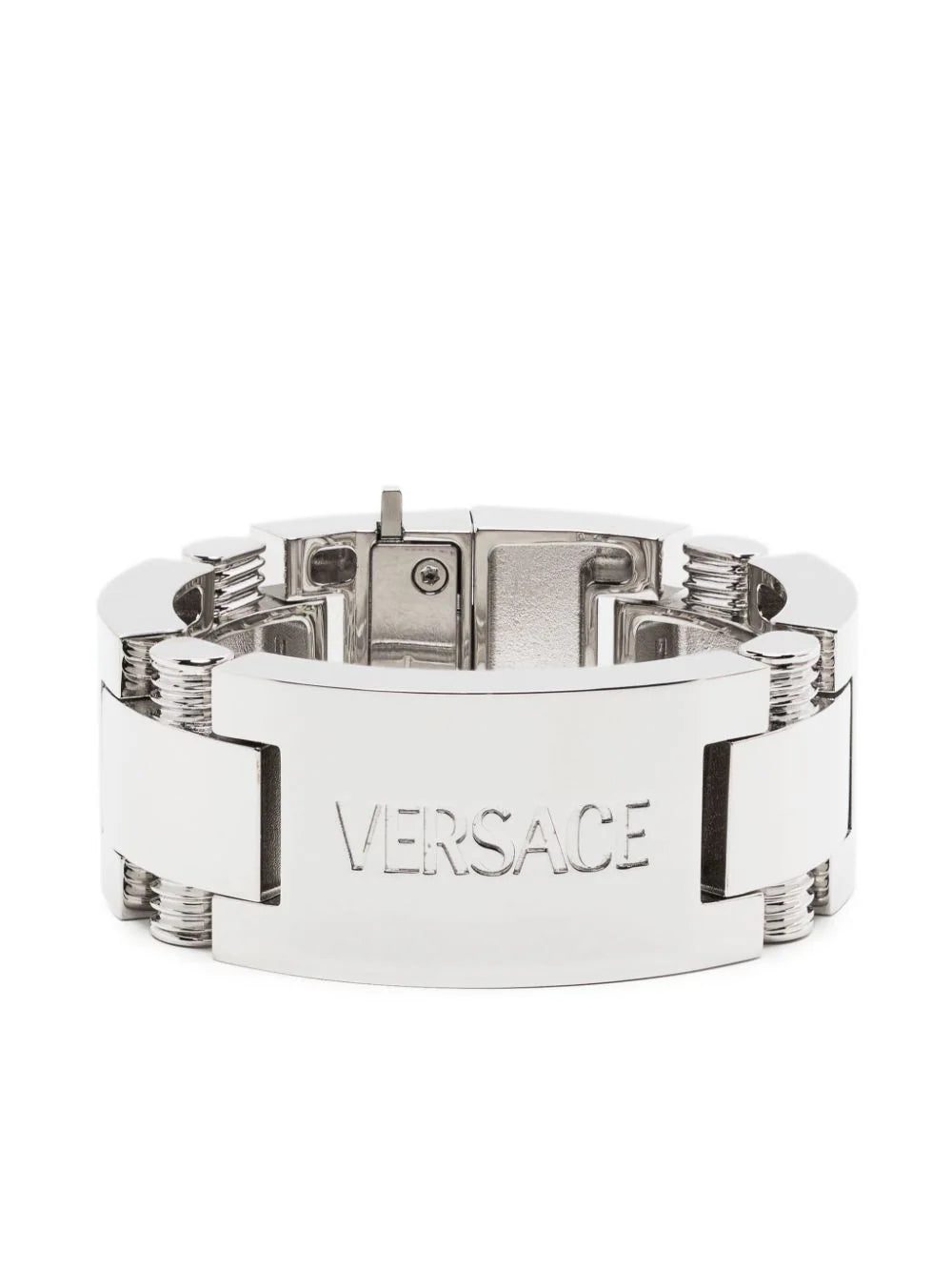 The standout feature of this bracelet from Vercace's AW23 collection is the striking logo. Crafted from sterling silver plated brass, the signature detail is expertly engraved on top, while the iconic Greca detail can be found at the closure.