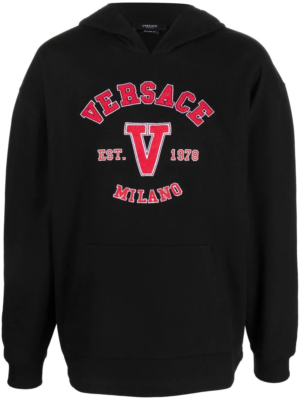 logo-patch cotton hoodie from Versace featuring black, cotton, jersey fleece, logo patch to the front, classic hood, drop shoulder, long sleeves, fitted-cuff sleeves, front pouch pocket and straight hem.