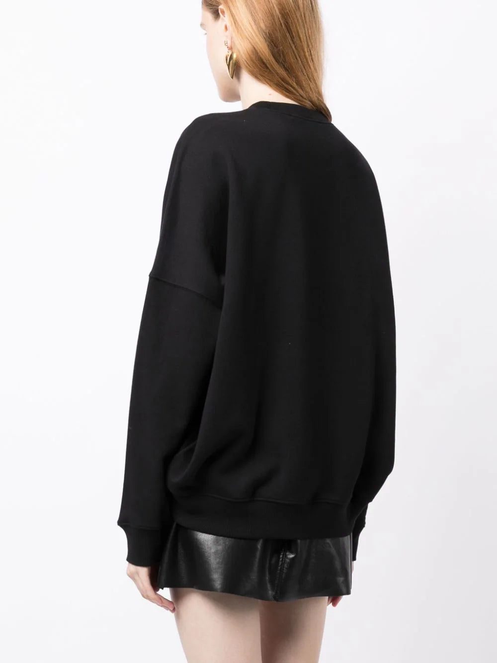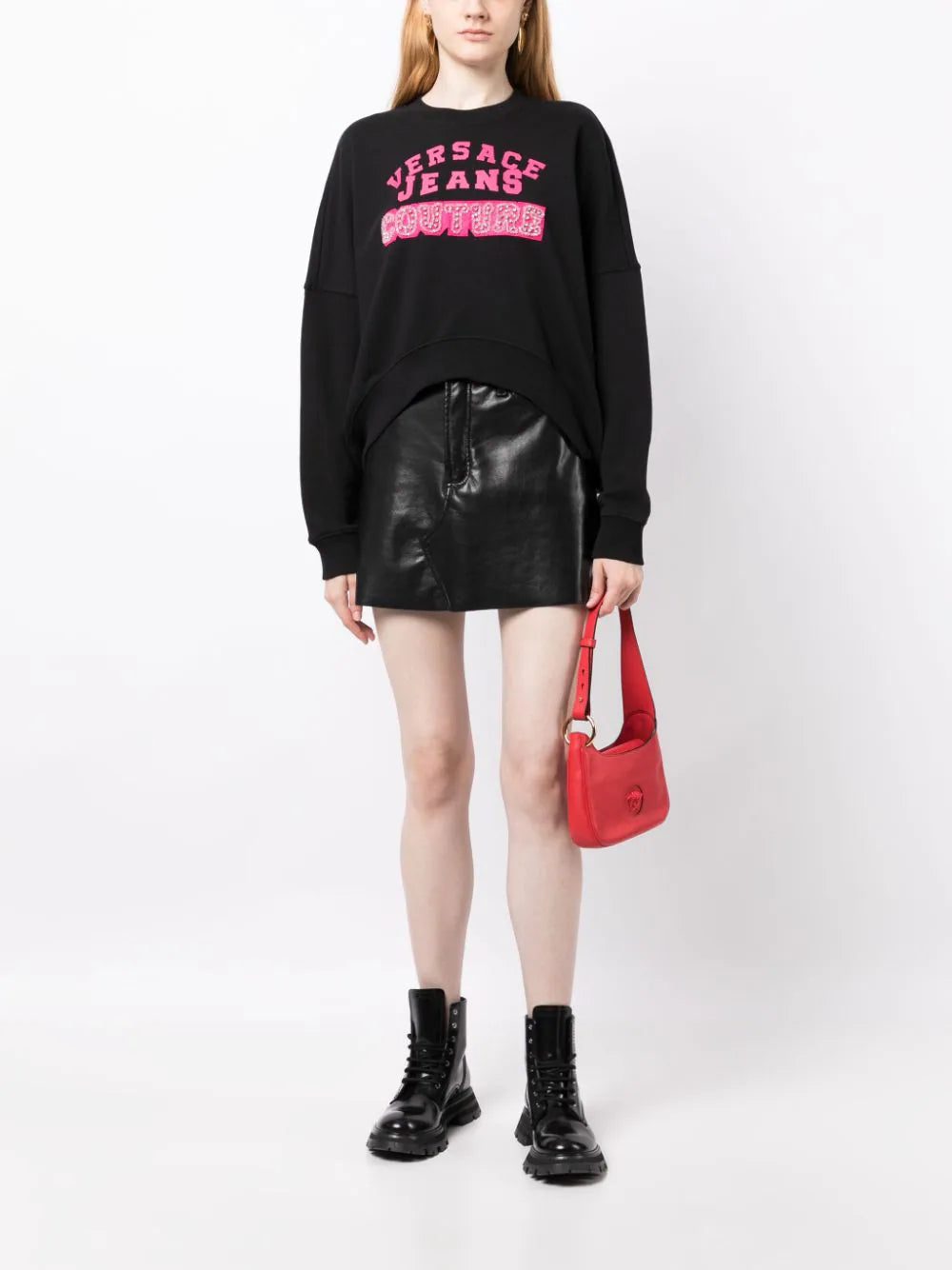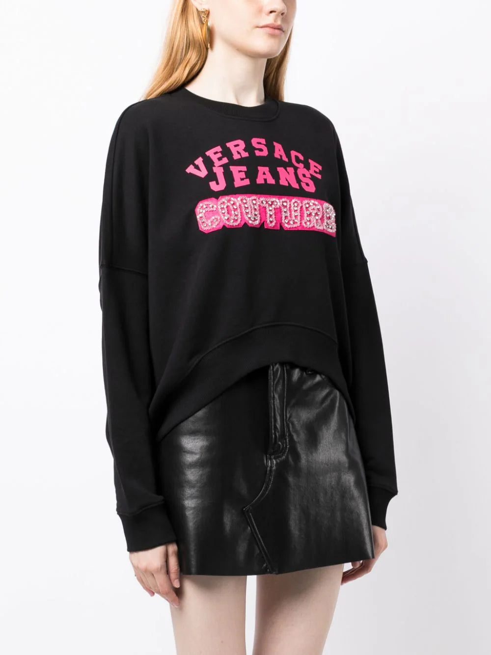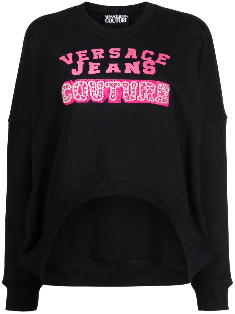 Versace Jeans Couture’s maximalist aesthetic is demonstrated with this cotton sweatshirt. The hot-pink logo lettering creates graphic contrast against the black backdrop.