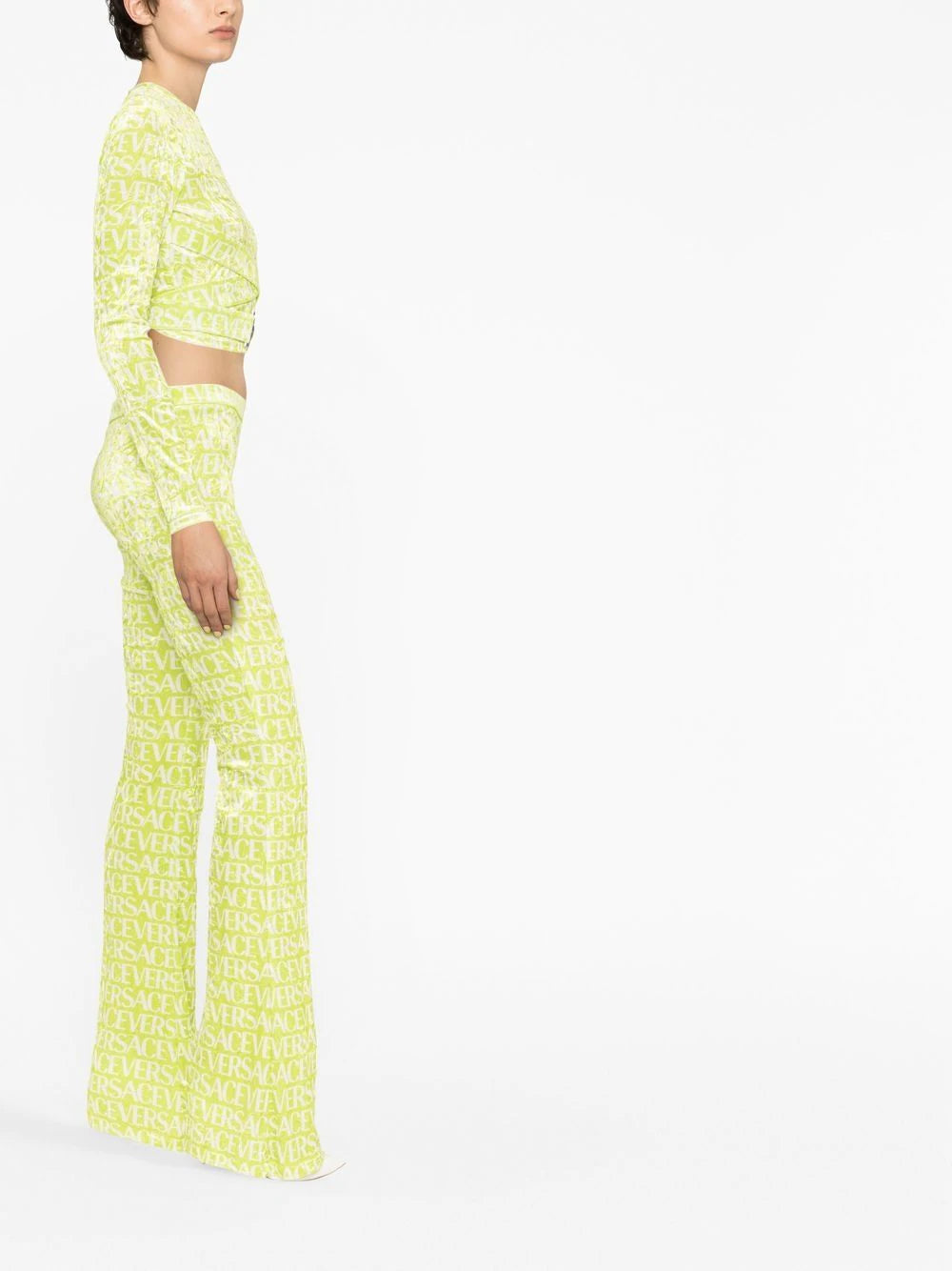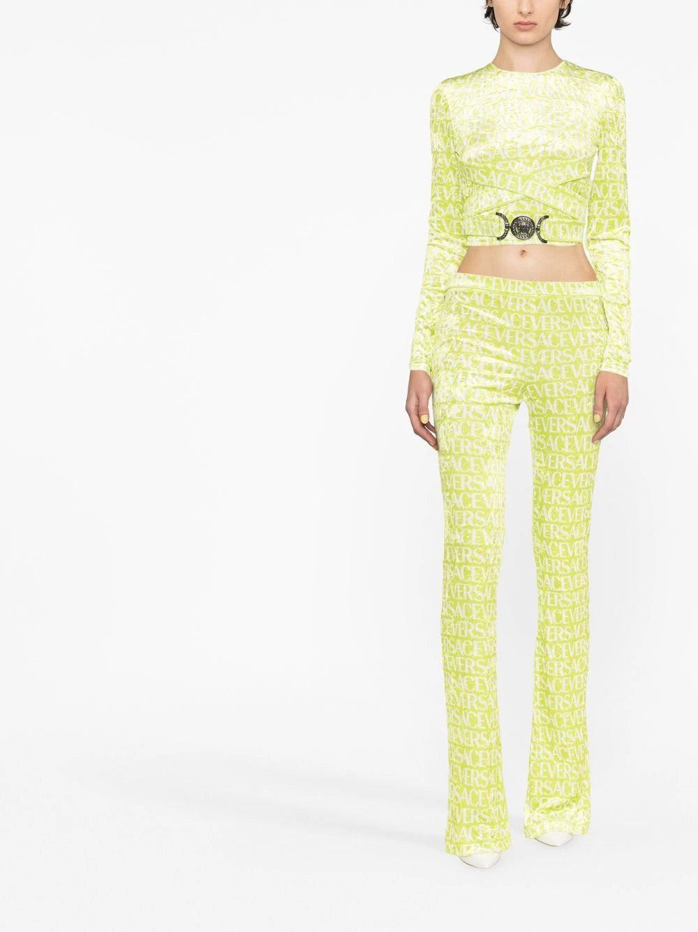 Versace spotlights its maximalist aesthetic in the design of this crop top. Crafted from textured velvet, it’s saturated with an all-over logo print and punctuated by cut-out detailing and Medusa Biggie hardware at the waist.