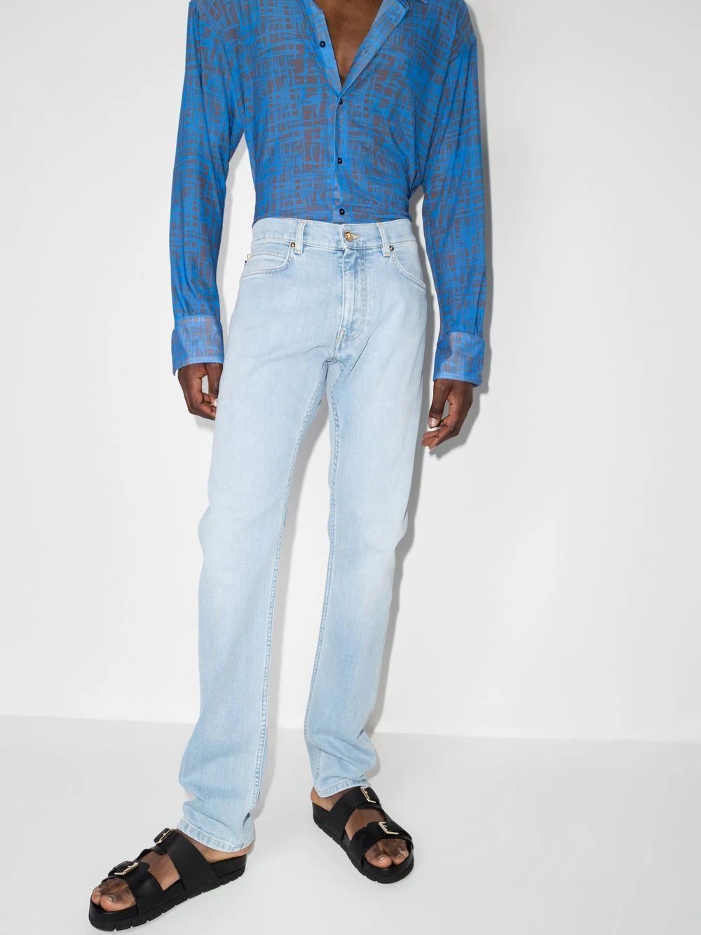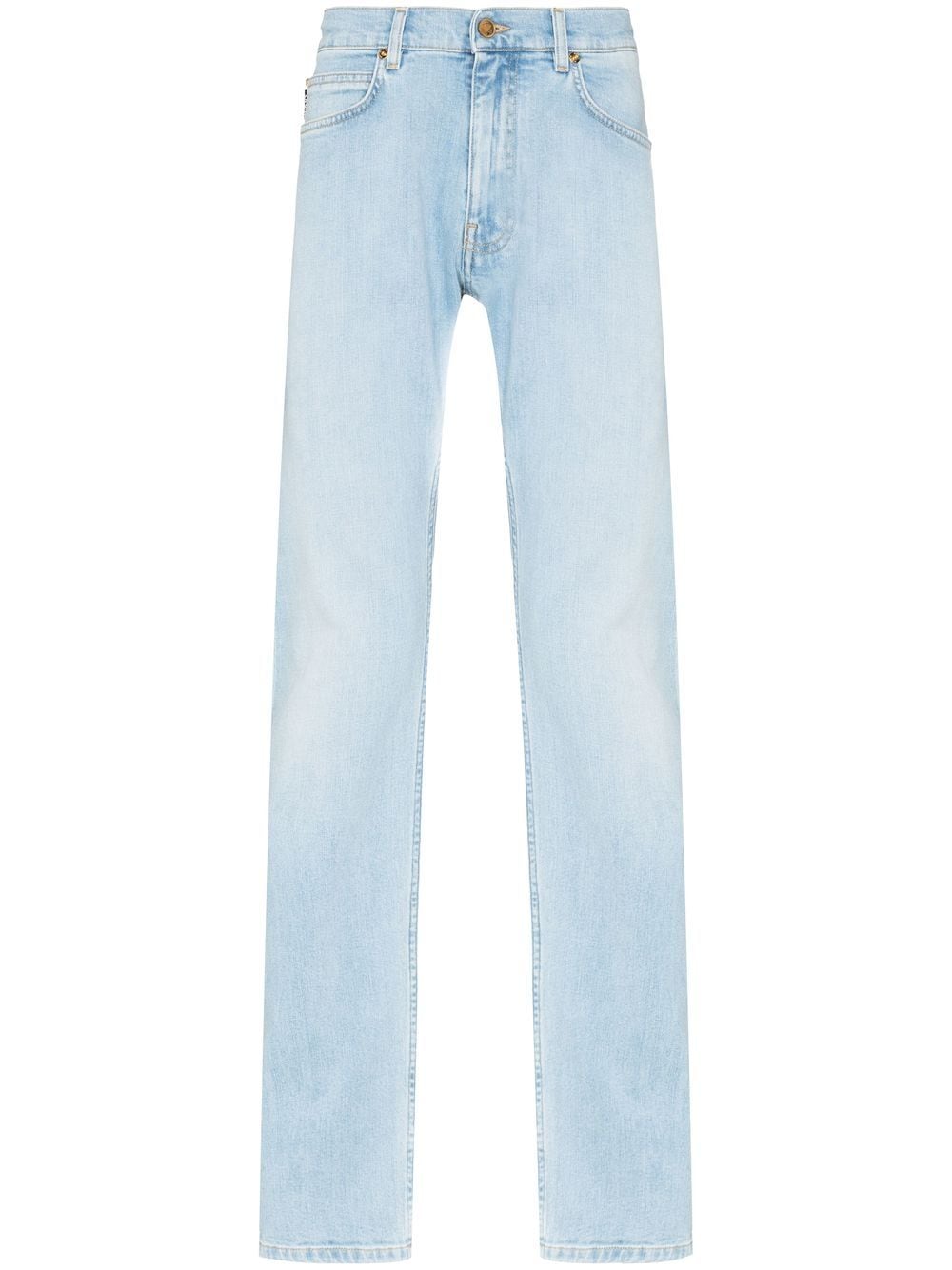 Crafted from stretch cotton, these Versace jeans are cut to a straight silhouette and finished in a soft blue hue. This creates a classic finish for the light-wash pair.