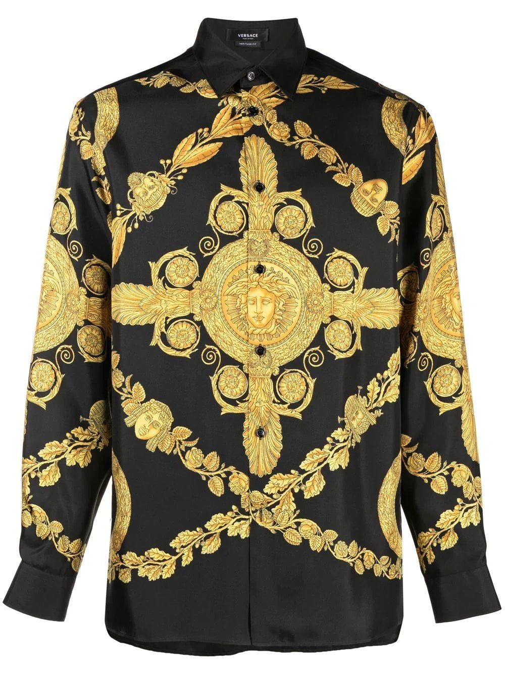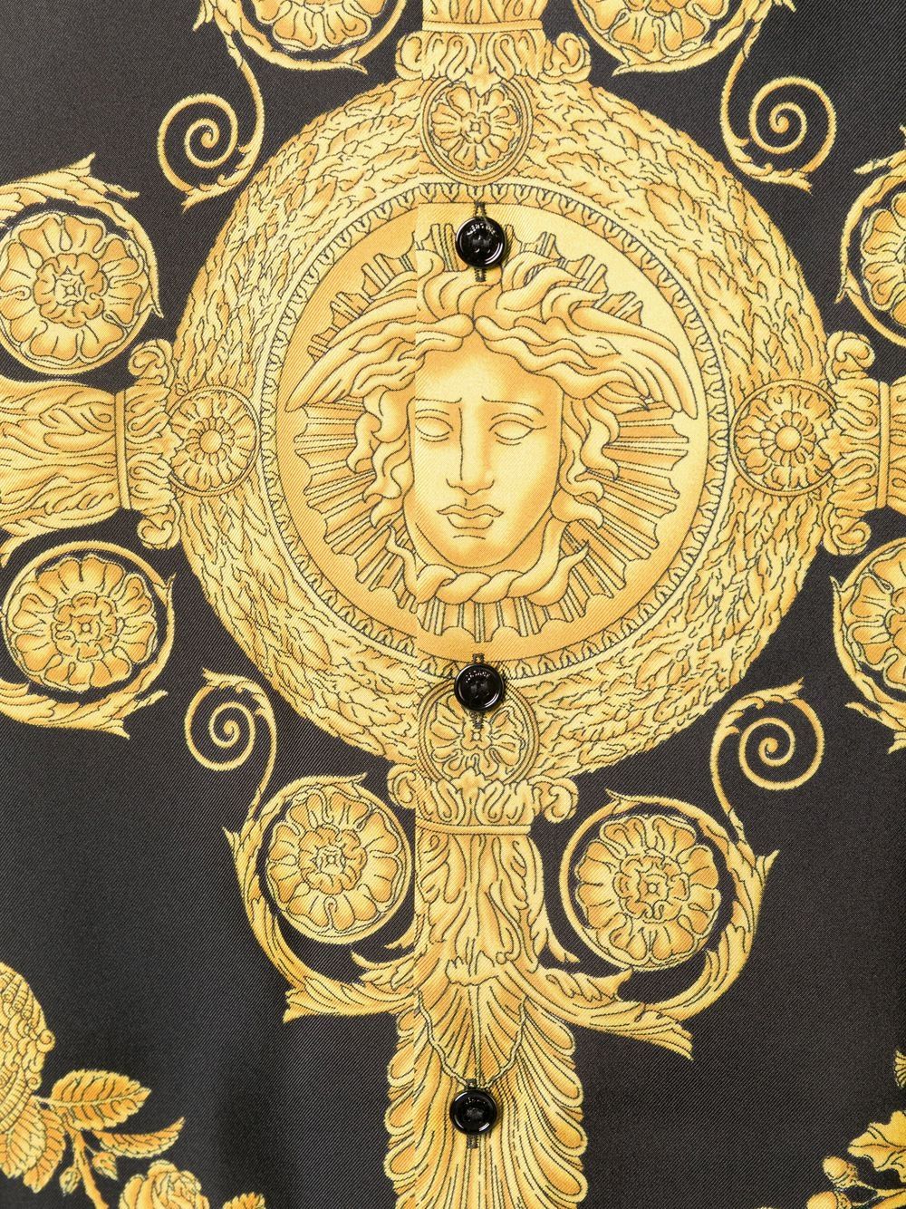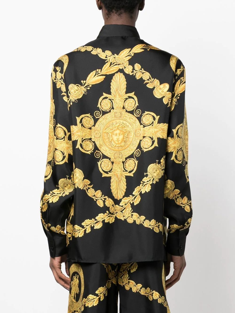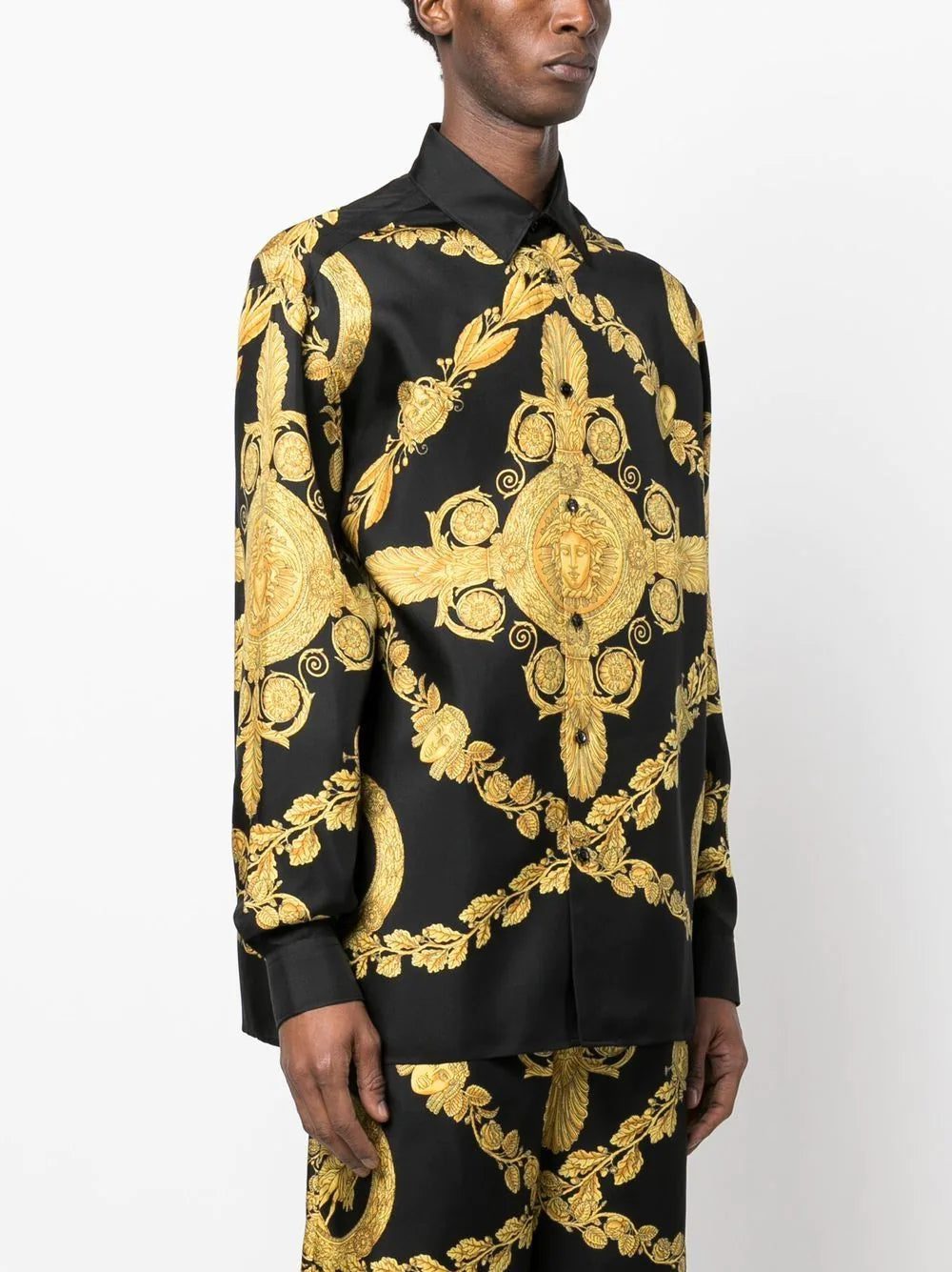 Versace's Maschera Barocco motif adorns this black silk shirt, made in Italy from delicate silk and evocative of the house's penchant for heritage and mythology-inspired designs.