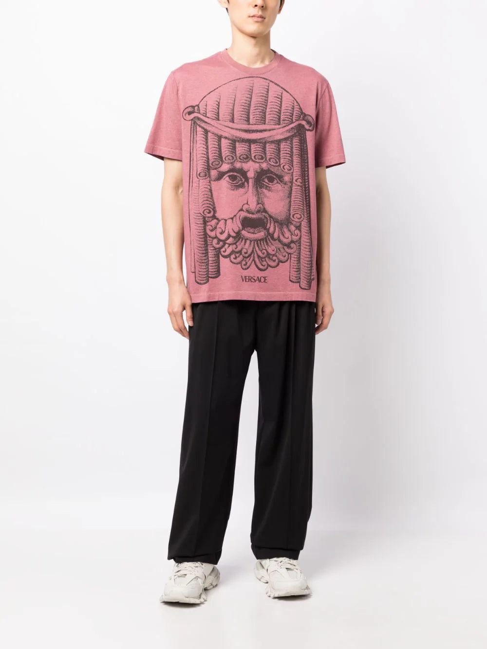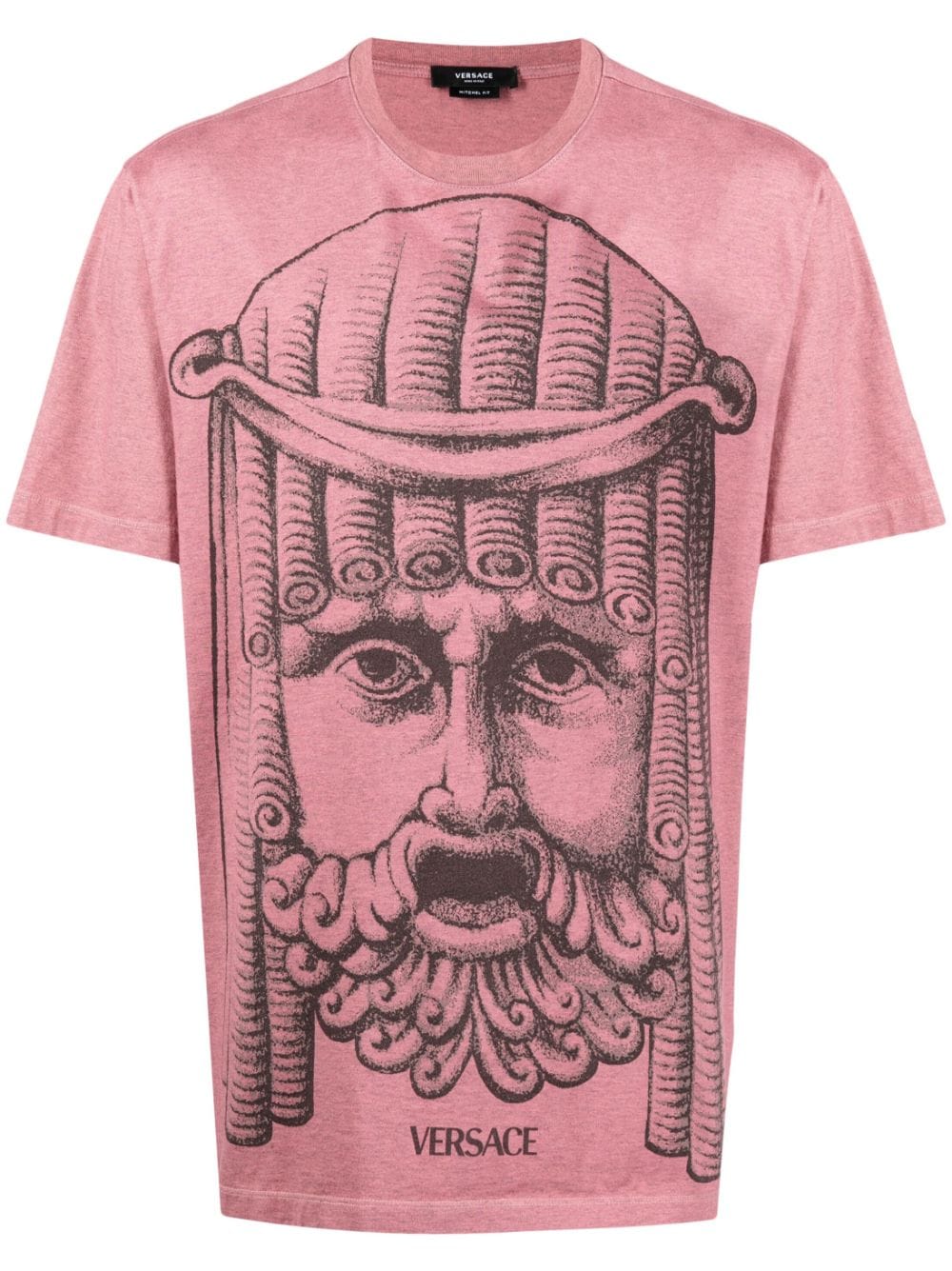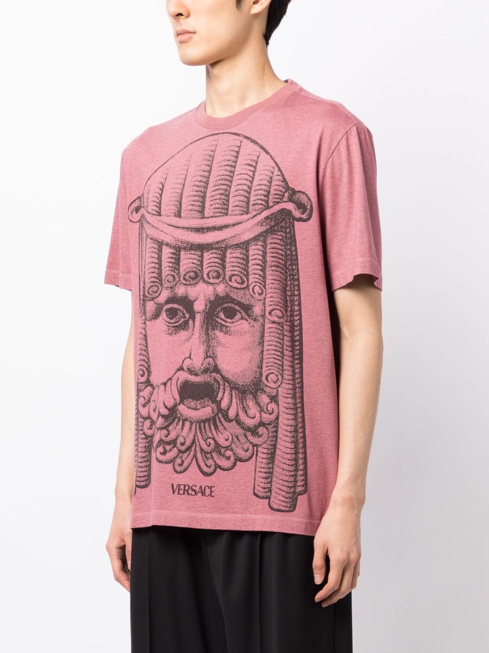 A graphic mask print takes over the front of this Versace shirt, lending the top an eye-catching look. The cotton jersey top boasts an overdyed treatment that lends it its rose pink hue.