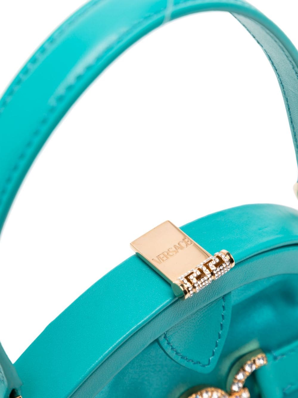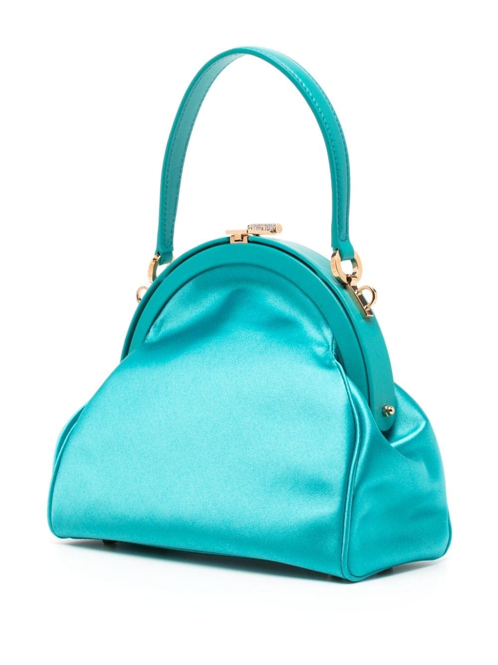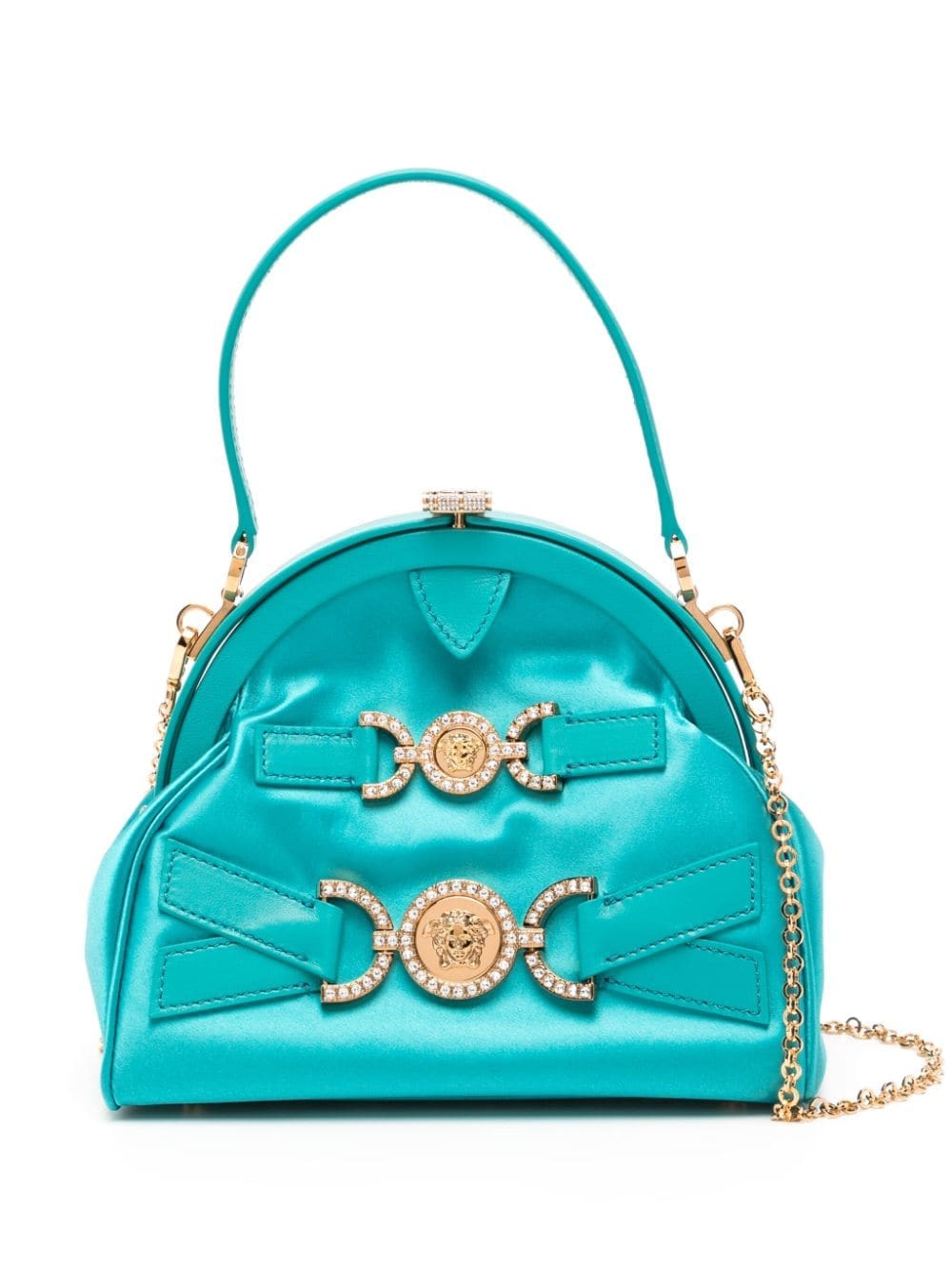This turquoise satin Versace bag is imbued with nostalgic charm – from the vintage-inspired framed silhouette to the crystal-embellished Medusa ’95 hardware anchored across the front with leather straps.