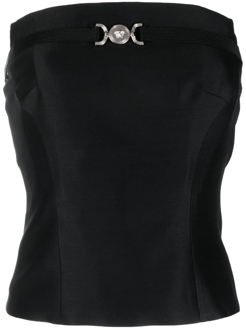 Versace's black Medusa '95 top is a showcase of the Italian house's bold motifs and rich design heritage. It's tailored from a wool blend and dotted with a silver-tone Medusa plaque secured by the iconic Nastro Gianni topstitched trim.