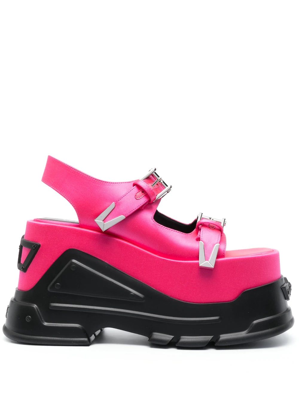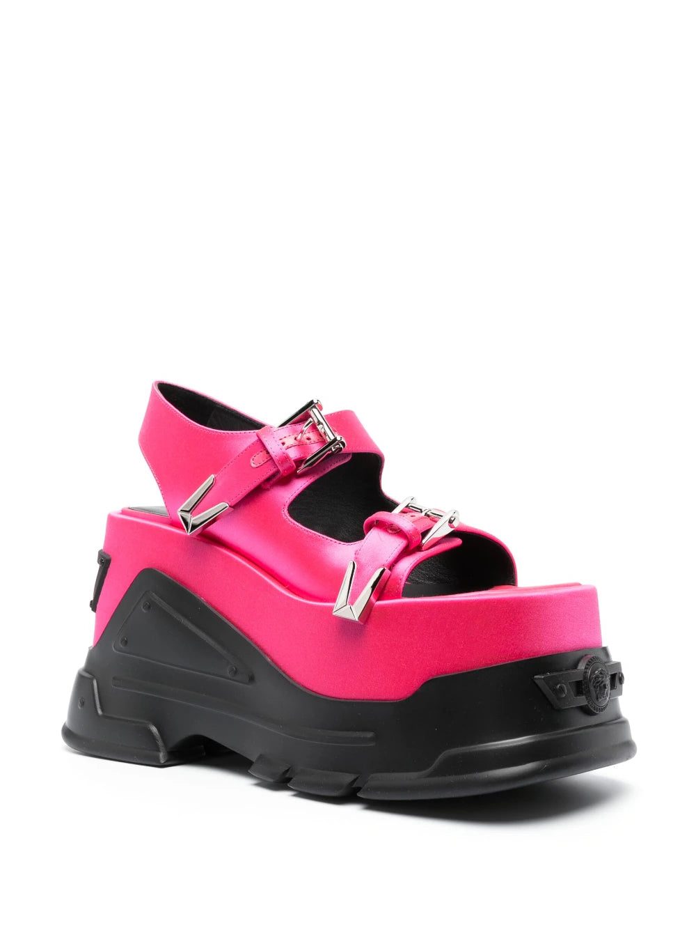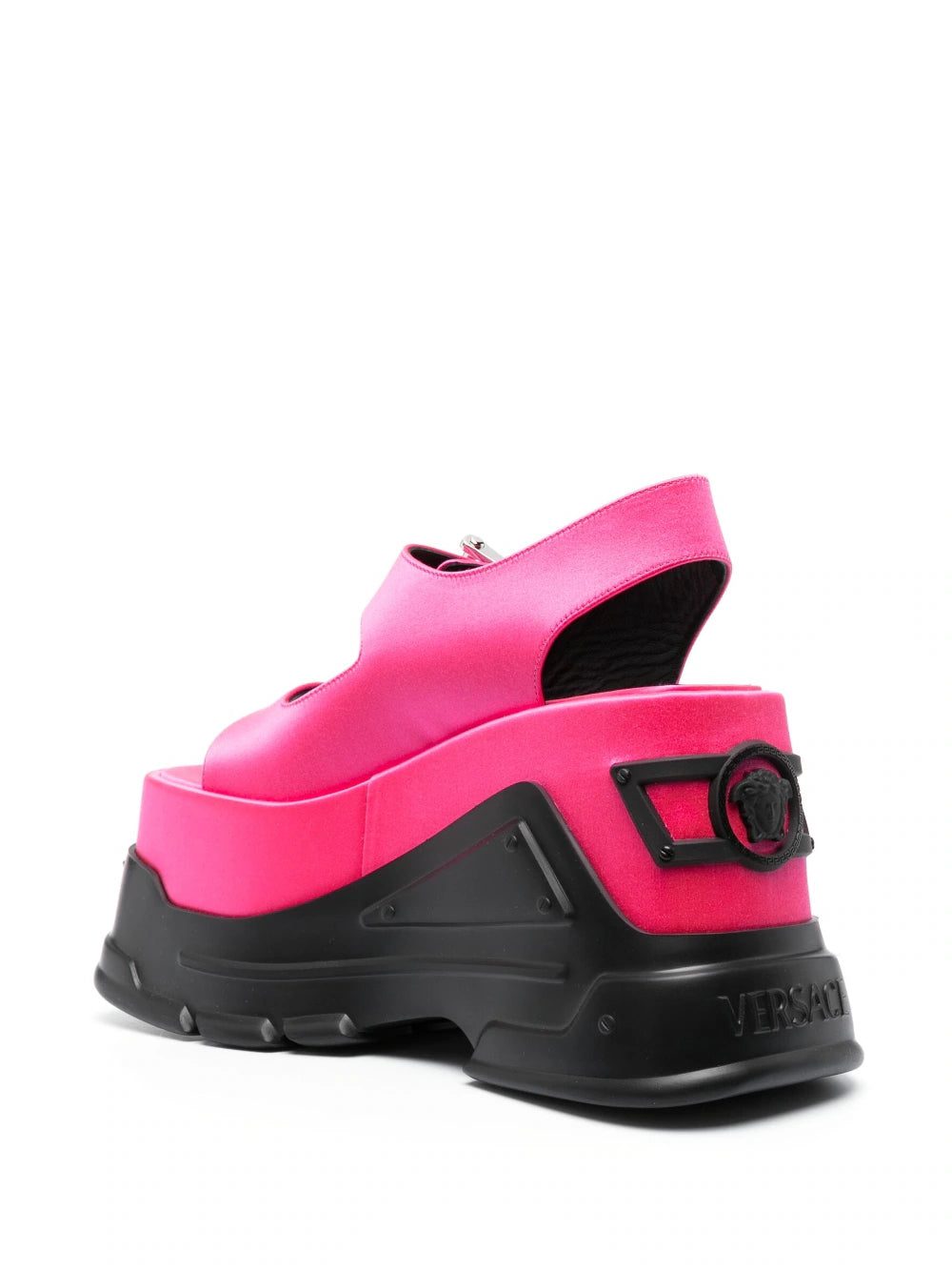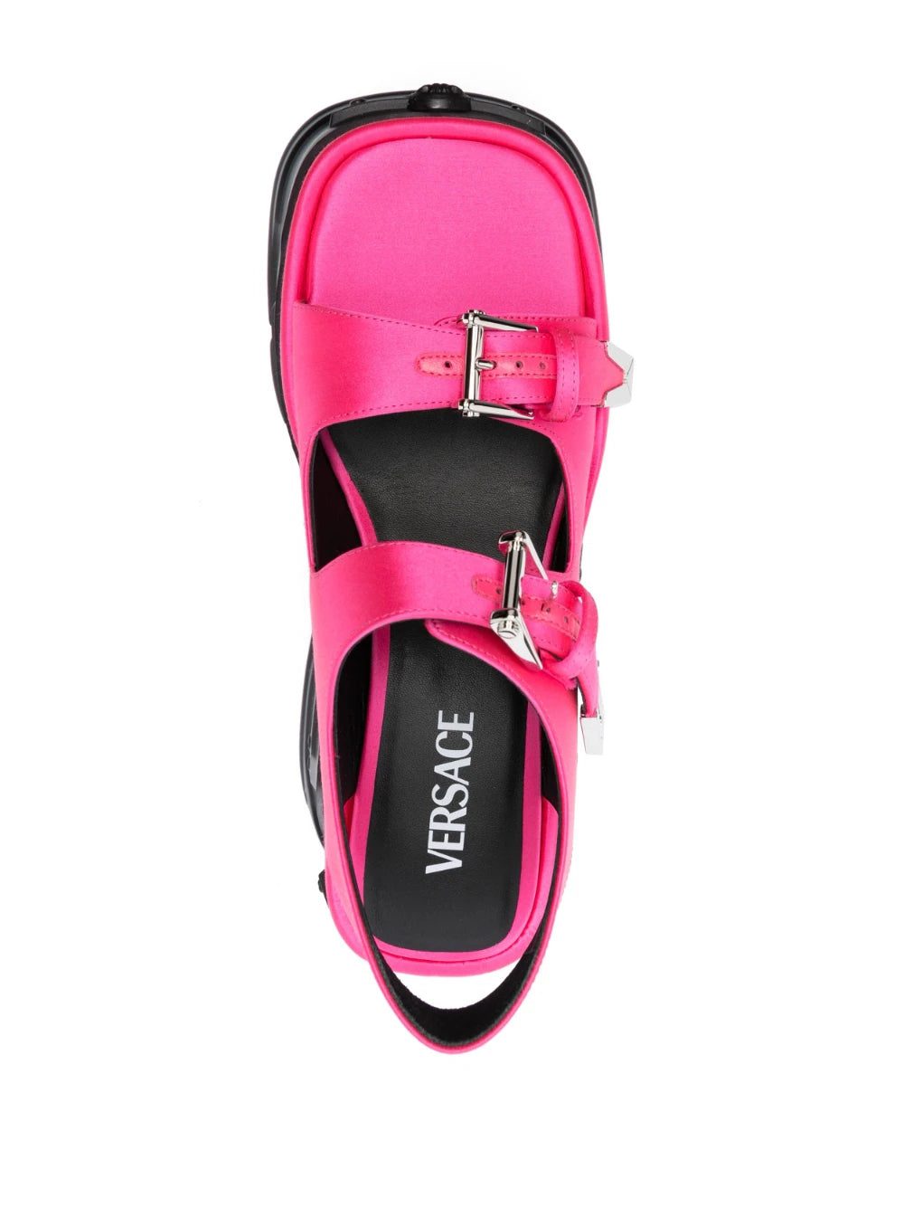 Versace's Medusa Anthem shoes clash a Mary Jane-inspired silhouette with an extra-large moulded platform rubber sole. Imagined in pink satin, this pair feature tonal Medusa rubber injections on the outsoles whilst silver-tone V-shaped hardware adorns the double straps.