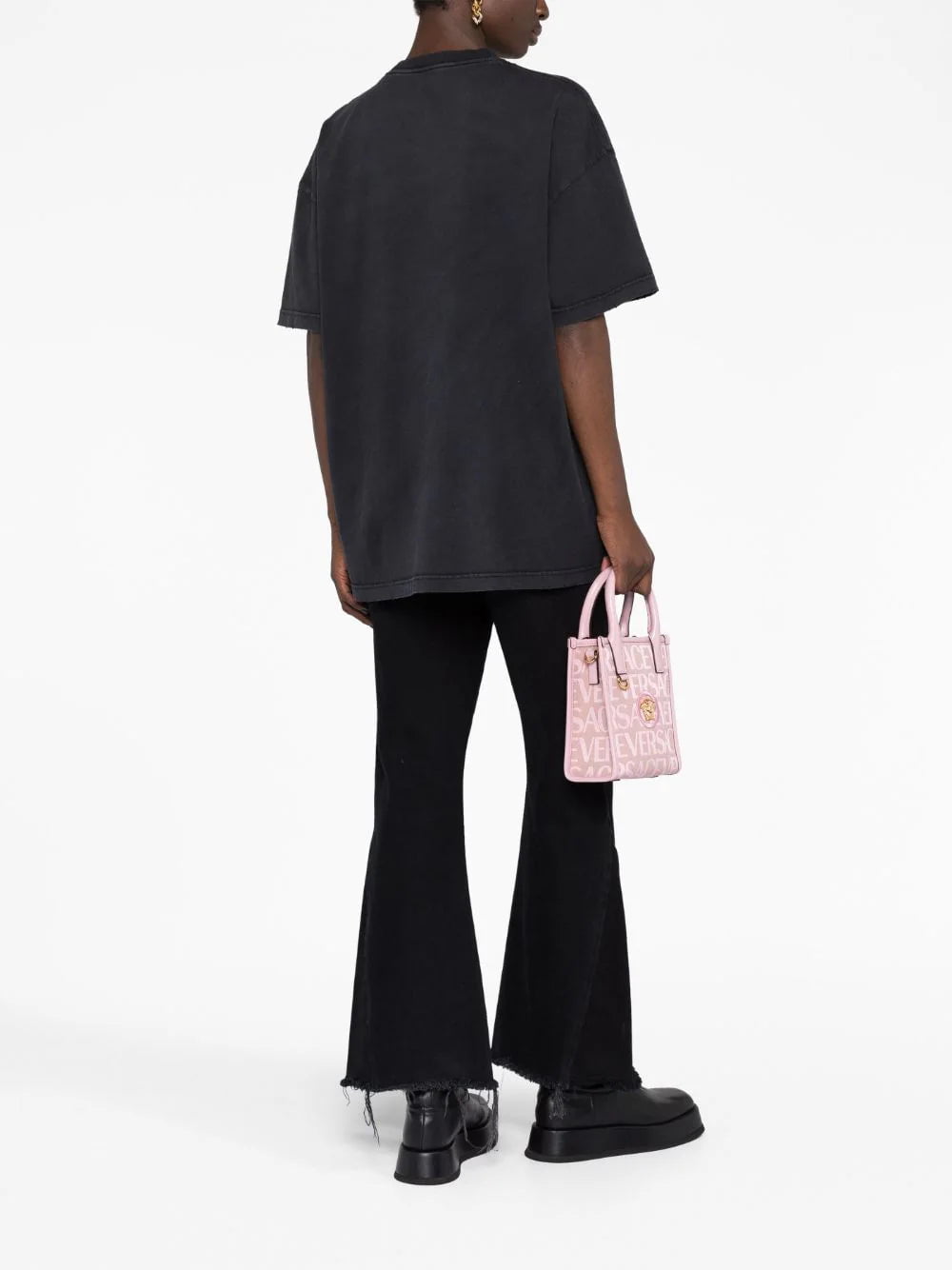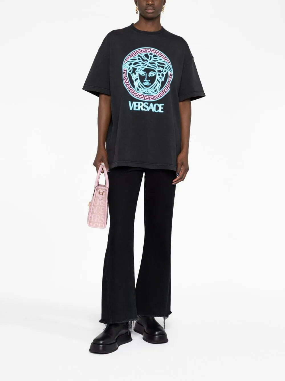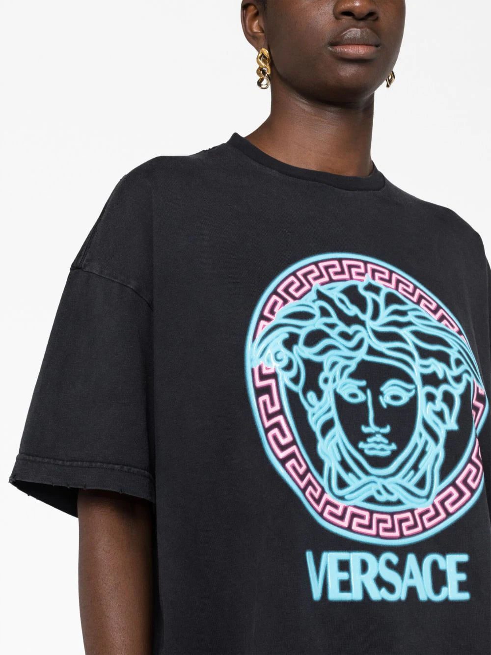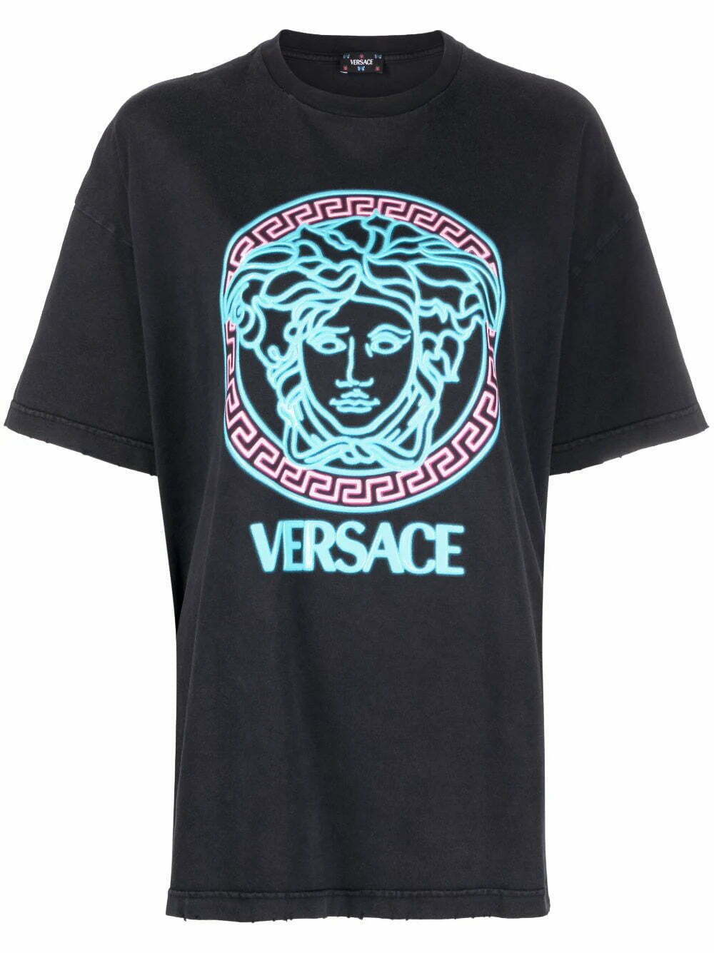 The Medusa Head motif remains one of Versace’s iconic emblems. A rubberised version is appliquéd across the front of this oversized cotton T-shirt in neon hues that pop against the black distressed base.