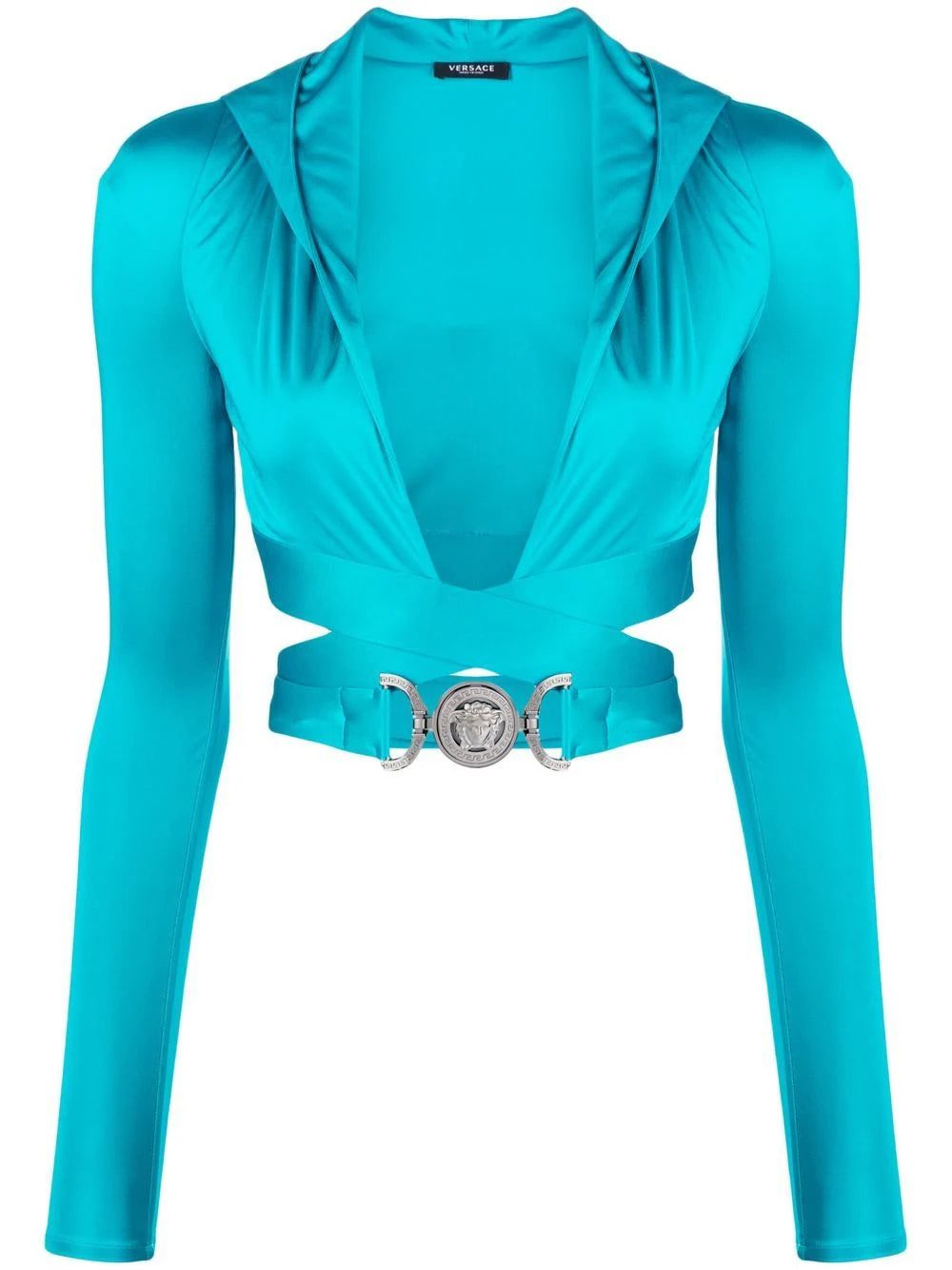 Versace’s extravagant style is hinted at with this hooded top. Presented in a lively turquoise blue colourway, this piece is defined by its cropped body that develops into a crisscross belt detail that culminates in a gold-tone Medusa head plaque for a distinct branded finish.