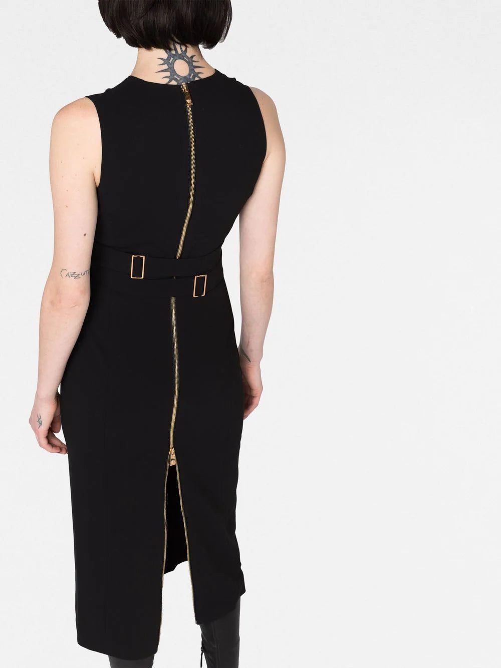 Versace combines bold motifs with elegant style codes, as presented on this midi dress from its SS23 collection. In a classic black hue, the adjustable crisscross belt is adorned with the signature Medusa Biggie in polished gold-tone hardware for a recognisable look.