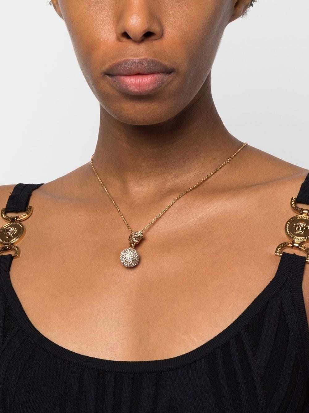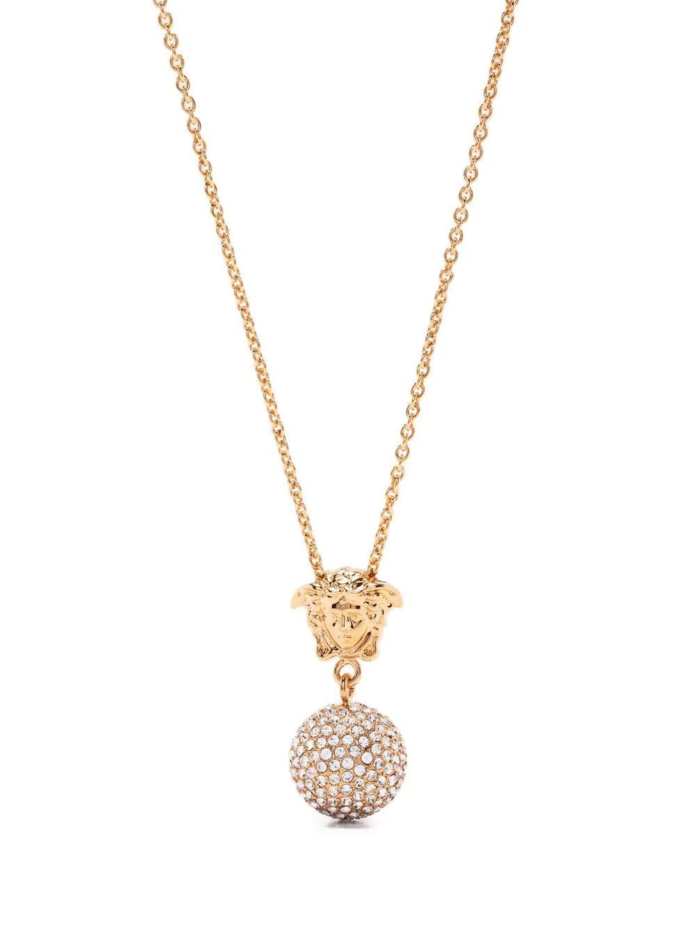 Medusa crystal-embellished necklace from Versace featuring gold-tone, brass, Medusa plaque detail, crystal embellishment, statement pendant, cable-link chain, lobster claw fastening and adjustable fit.