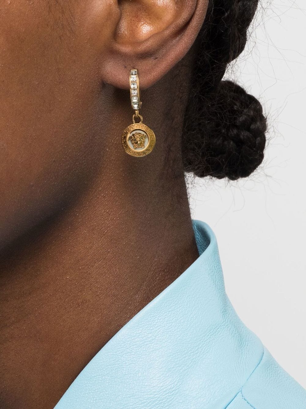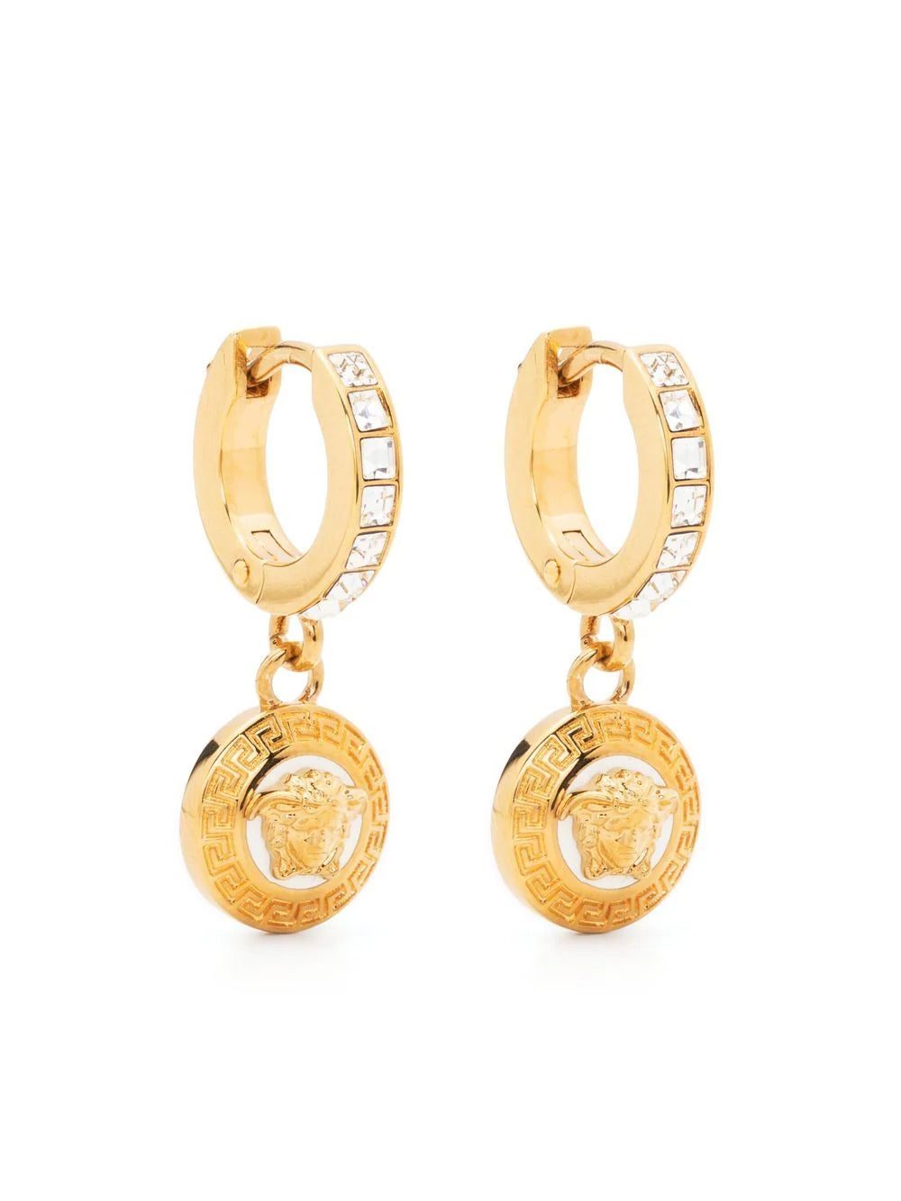 Medusa-embellished hoop earrings from VERSACE featuring gold-tone, metal, Medusa plaque detail, crystal embellishment and huggie hoop design. These earrings come as a pair..