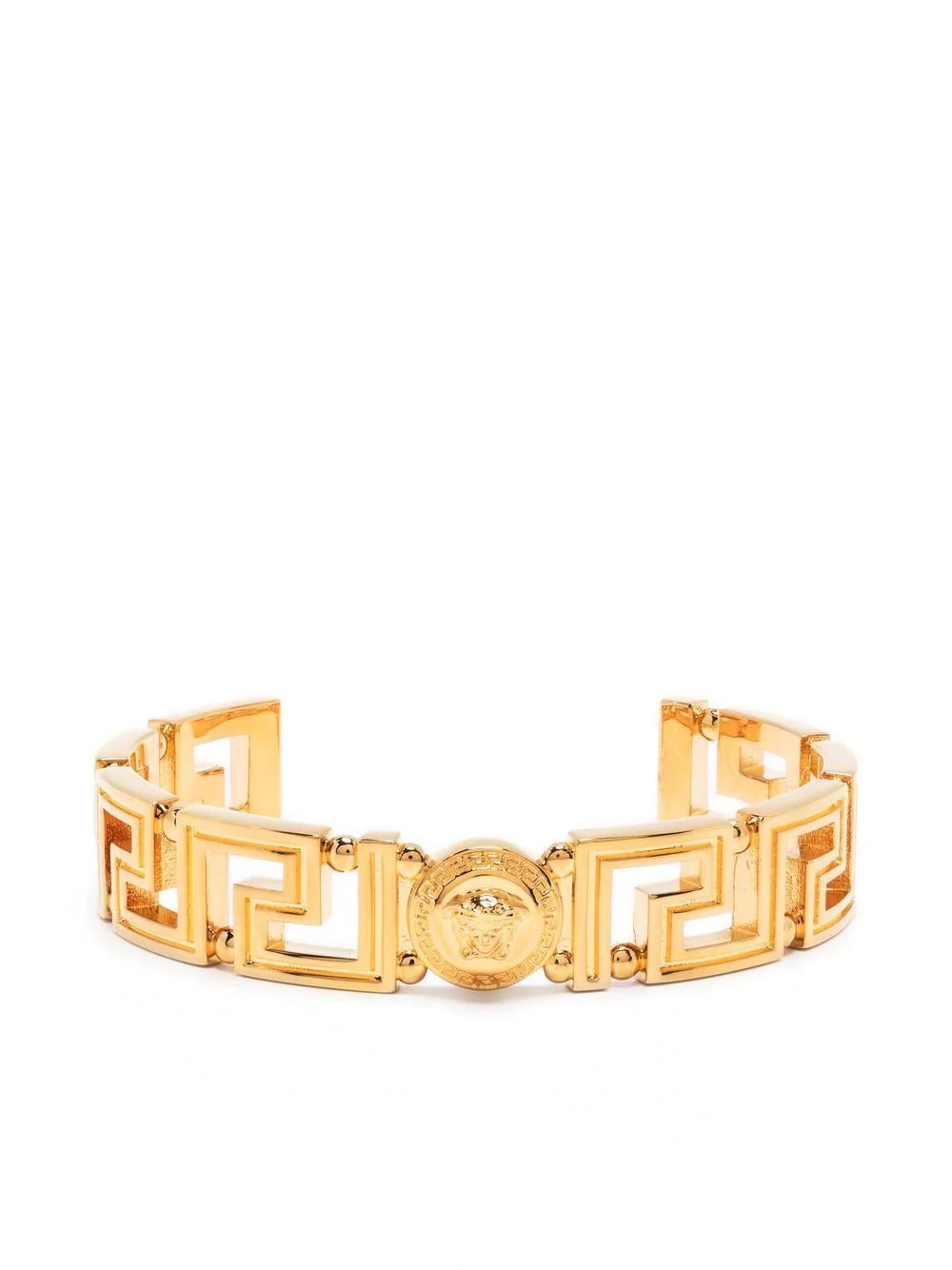 Medusa Head motif bracelet from VERSACE featuring gold-tone hardware, polished finish, engraved detail, Medusa Head motif, versace gold and brass.
