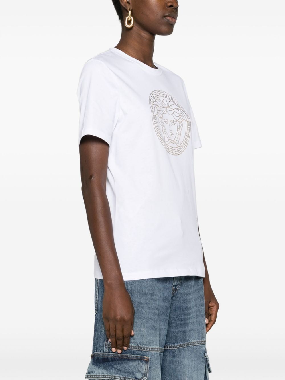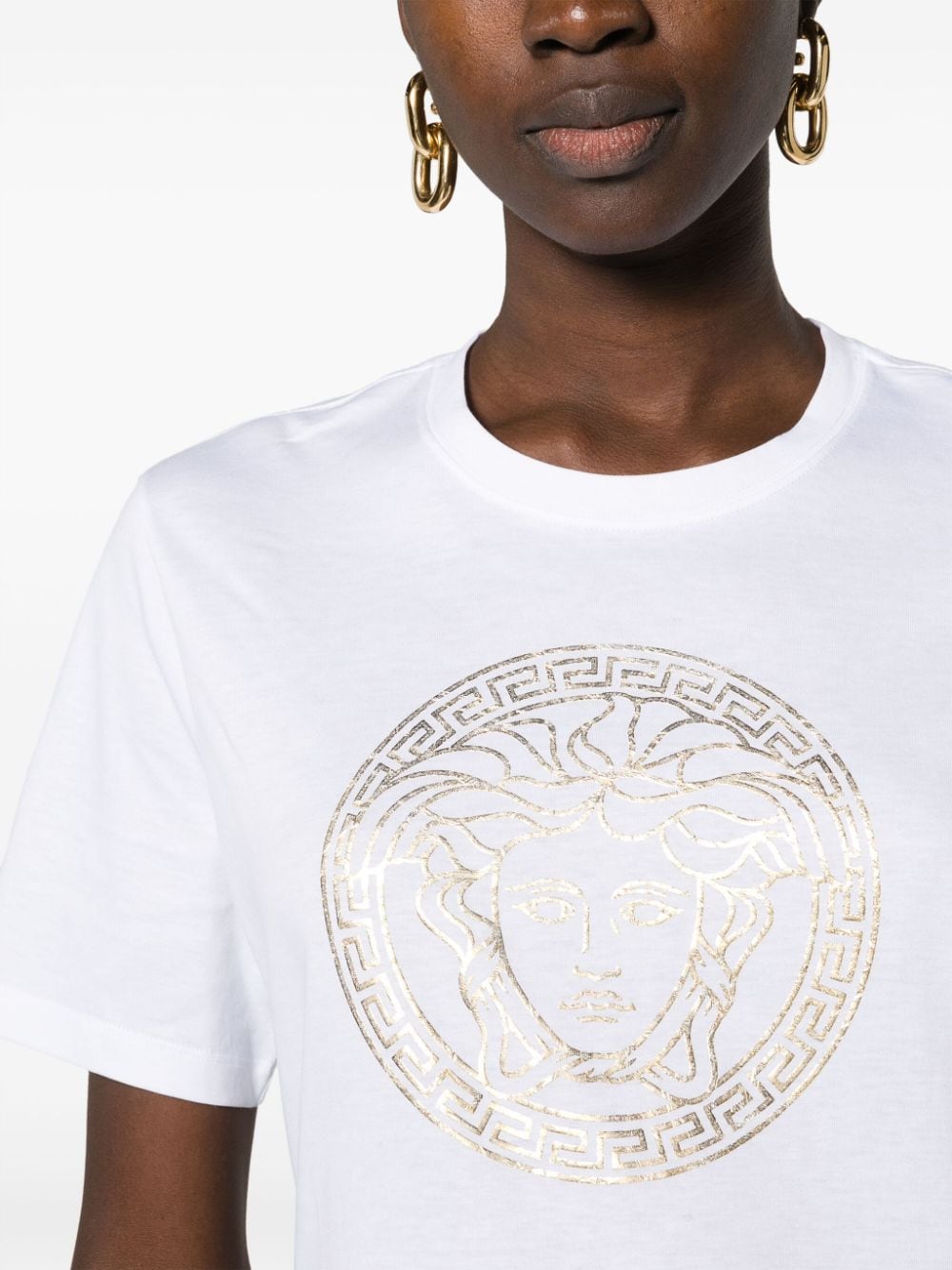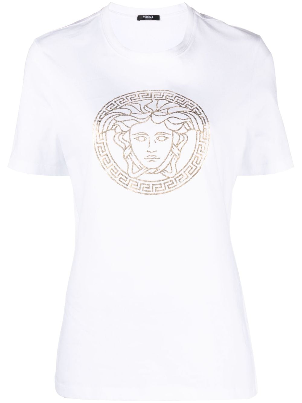 Versace's Medusa Head motif is a recurring emblem that references the brand’s affinity for mythology. It’s reimagined as a gold-tone print atop this white cotton T-shirt.