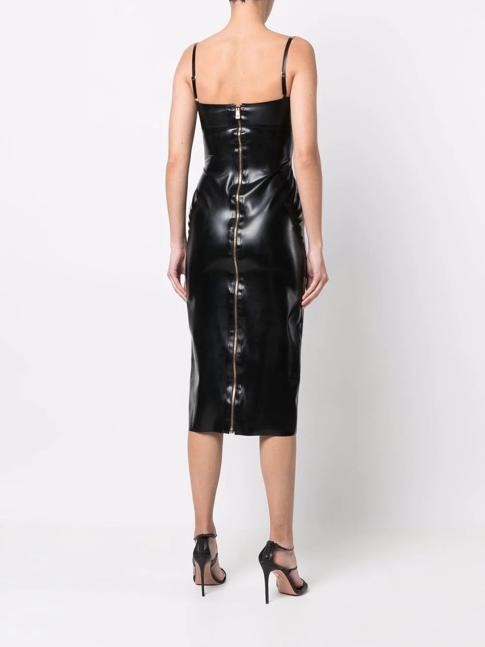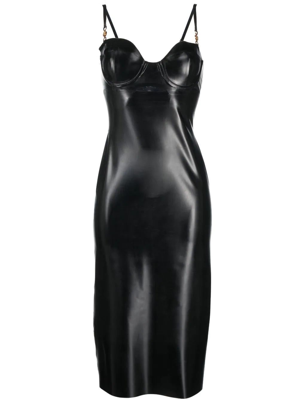Versace's rock'n'roll heritage is evidenced by this midi dress. Crafted from shiny black latex for a bold look, it is punctuated by gold-tone Medusa hardware at the shoulder straps.