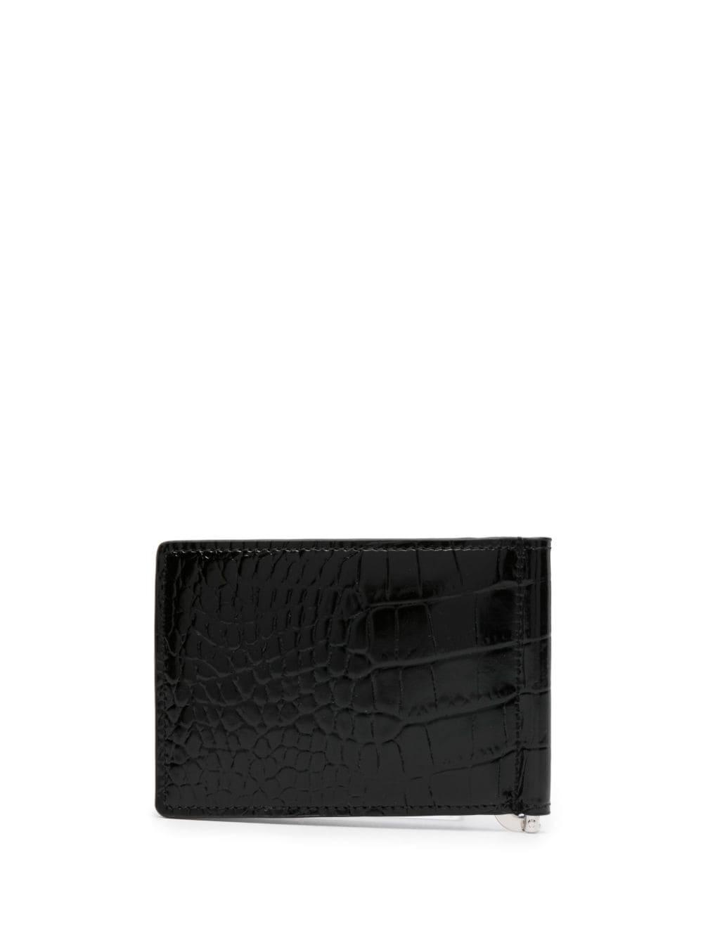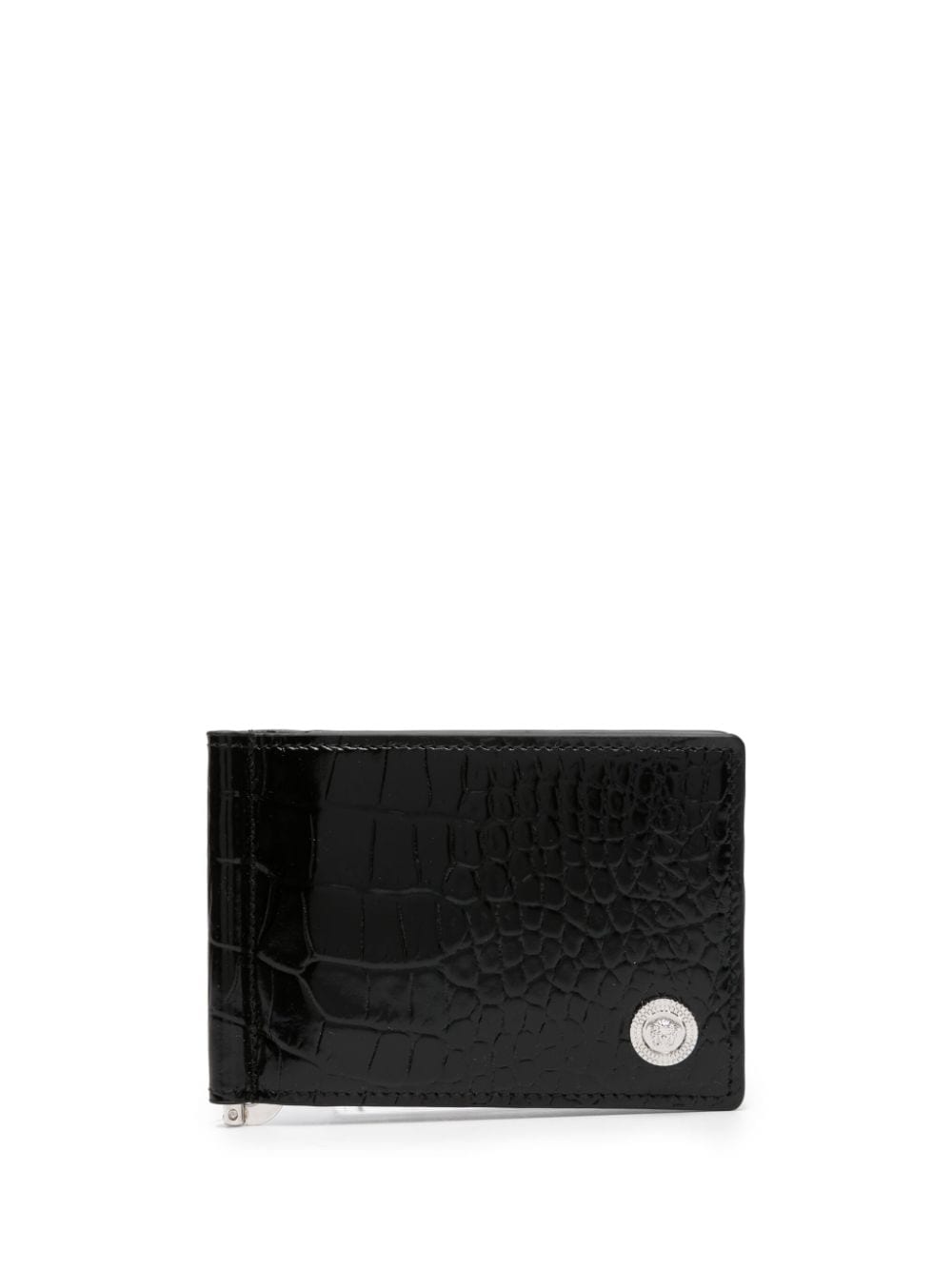 Embossed with a crocodile effect for a more tactile finish, this black bi-fold wallet is adorned with an iconic silver-tone Medusa plaque at the front for an instantly recognisable look. It is crafted from calf leather in Italy and benefits from six internal card slots.