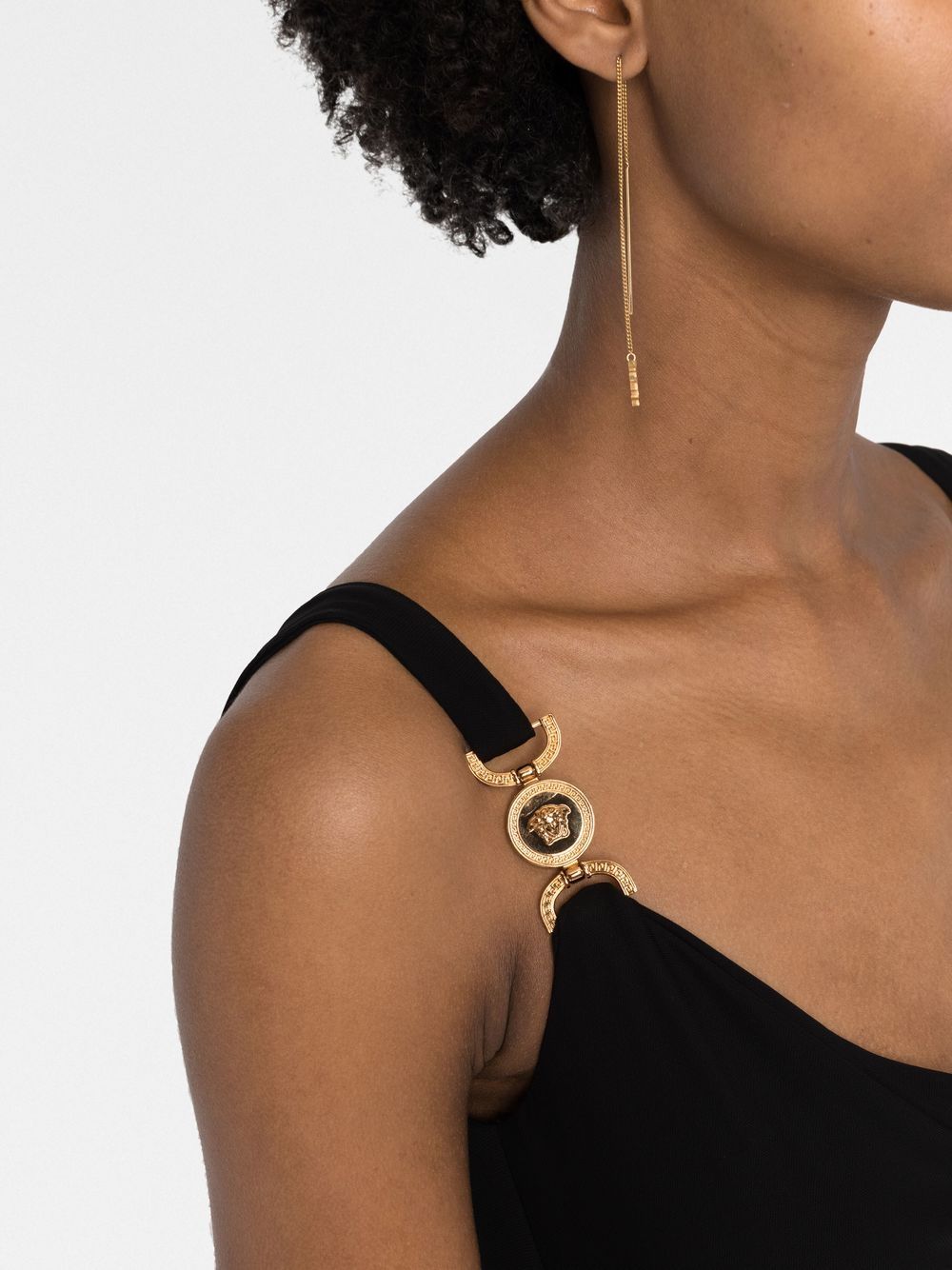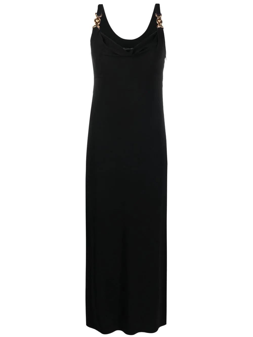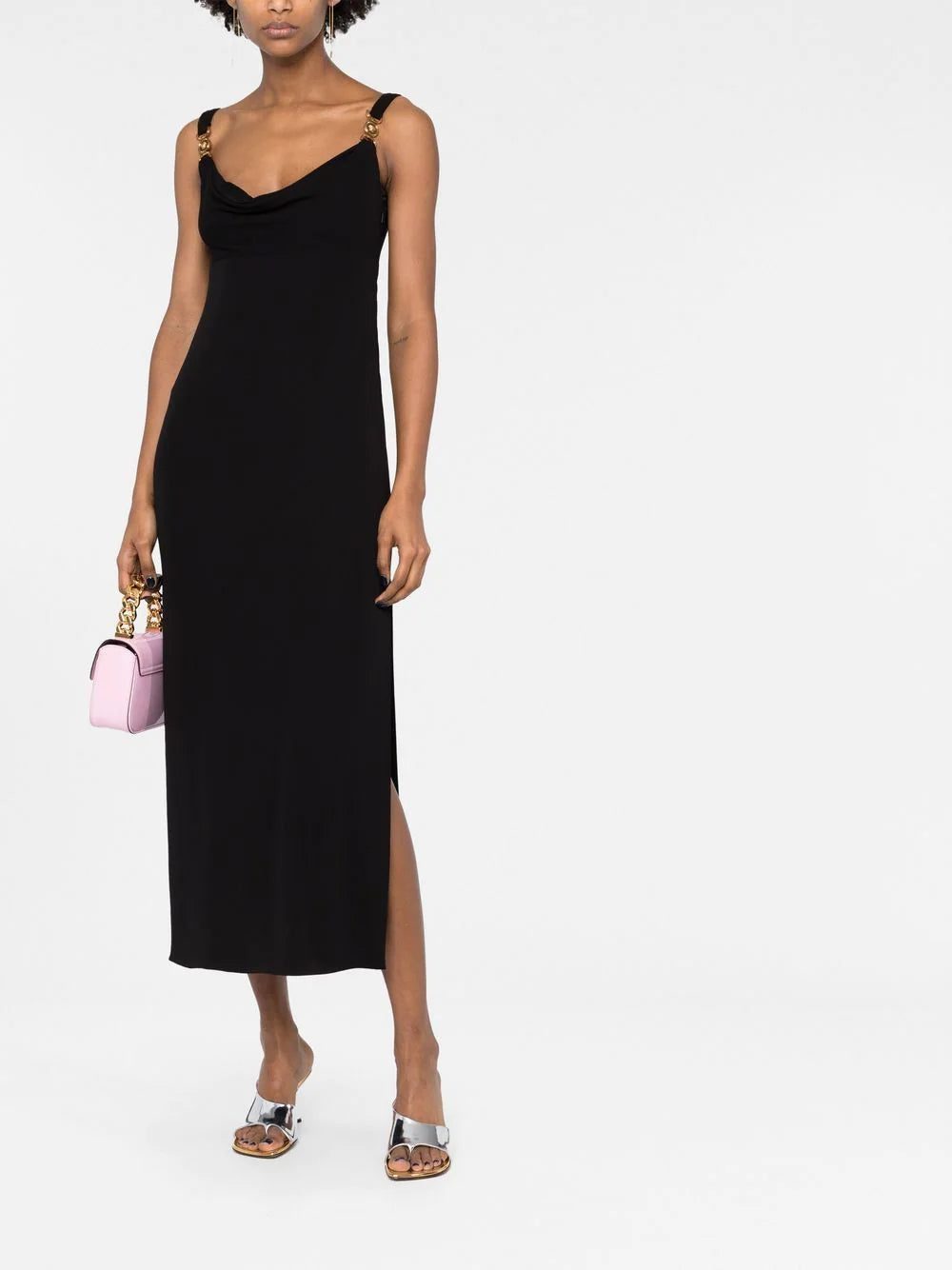 Versace’s extravagant style is hinted at with this midi dress. Presented in a tasteful black colourway, this piece boasts a timeless cowl neck silhouette and features gold-tone Medusa head plaques at the shoulder straps for a distinct branded finish.