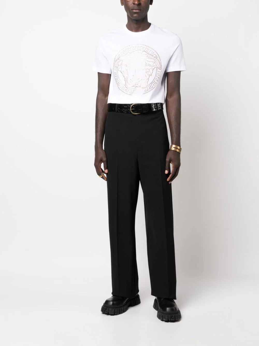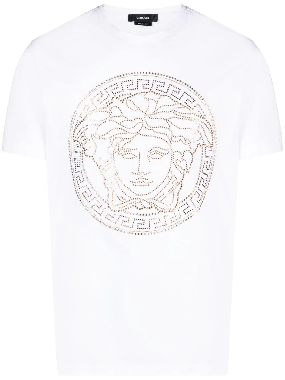 This Versace T-shirt boasts a Medusa Head design made of gold-tone rhinestones that contrast against the white crisp background.