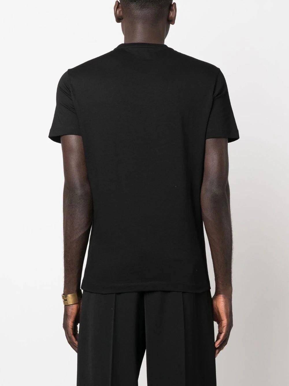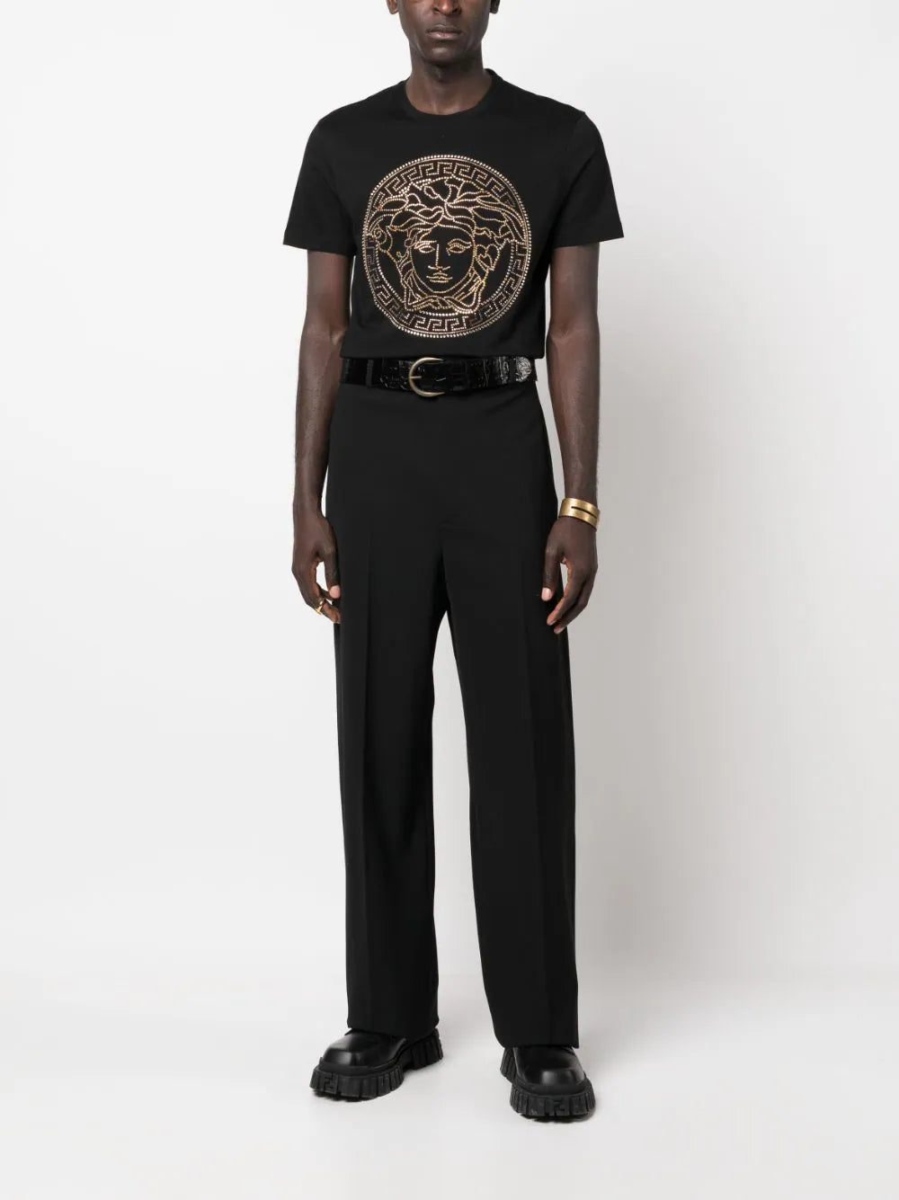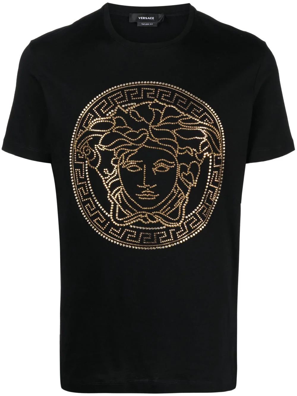 This Versace T-shirt boasts a Medusa Head design made of gold-tone rhinestones that contrast against the black background.