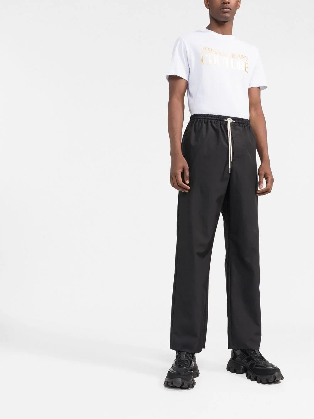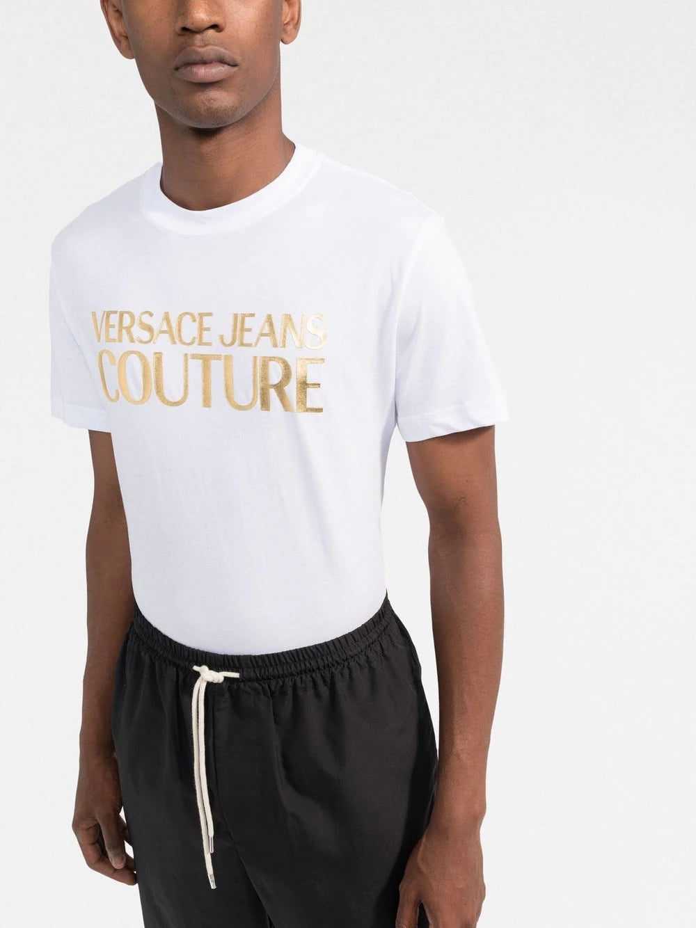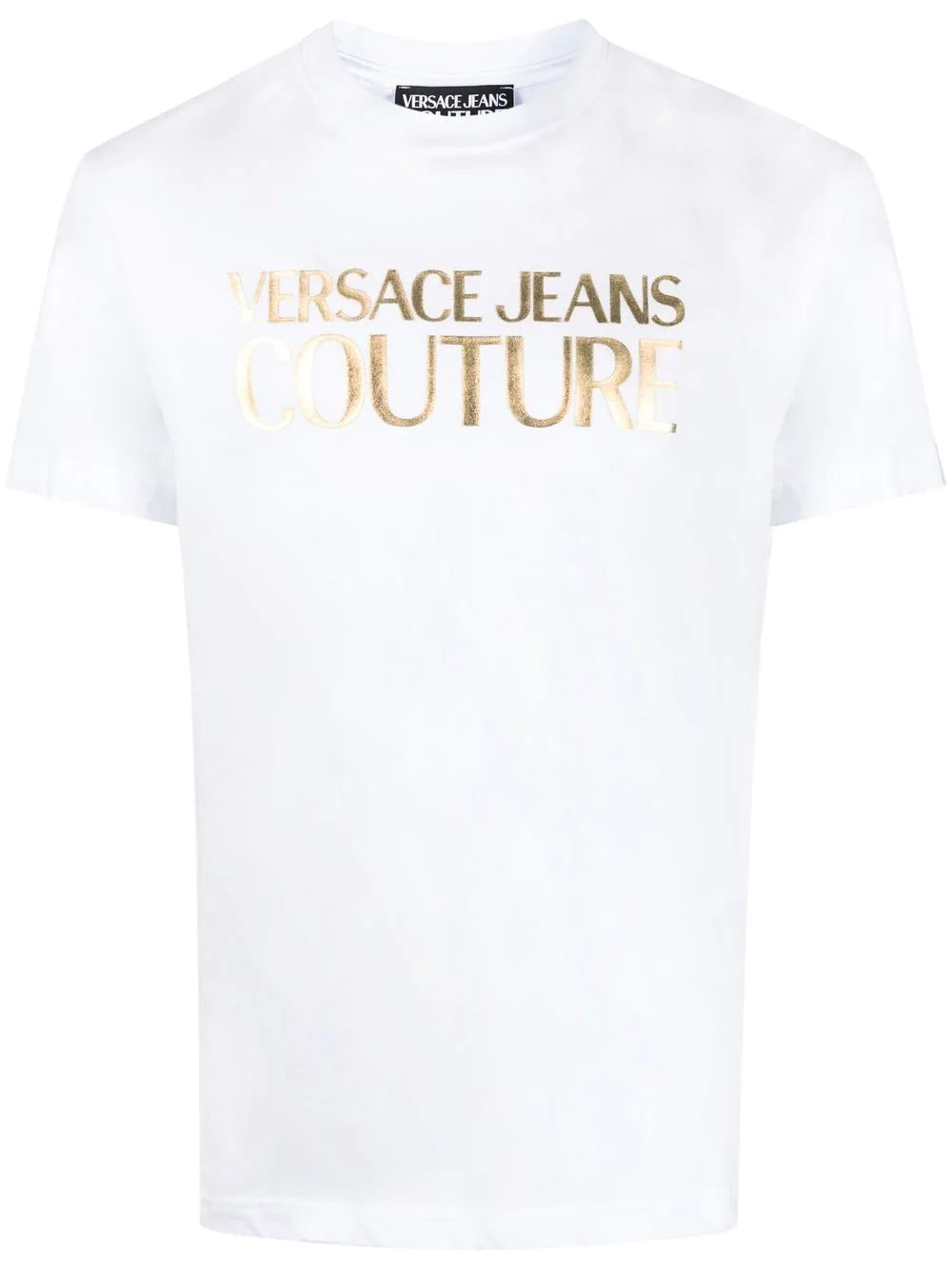 metallic logo-print T-shirt from VERSACE JEANS COUTURE featuring gold-tone, white, cotton, logo print at the chest, crew neck, straight hem and short sleeves.