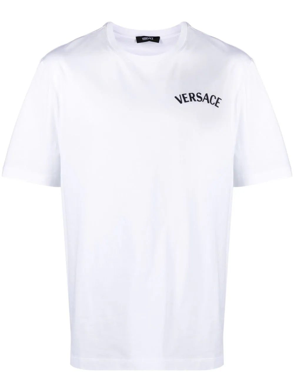 Versace’s T-shirt is a graphic take on classic crew-neck styles. It’s cut from white cotton jersey and detailed with an arched logo in contrasting black threads at the back.