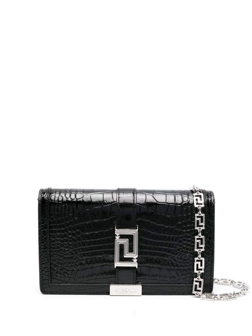 Crafted in Italy from embossed crocodile-effect leather, this Greca Goddess crossbody bag harnesses Versace's reverence for myth and symbolism. It's characterised by labyrinth-inspired Greca hardware and can be worn on the shoulder or crossbody using its detachable chain strap.