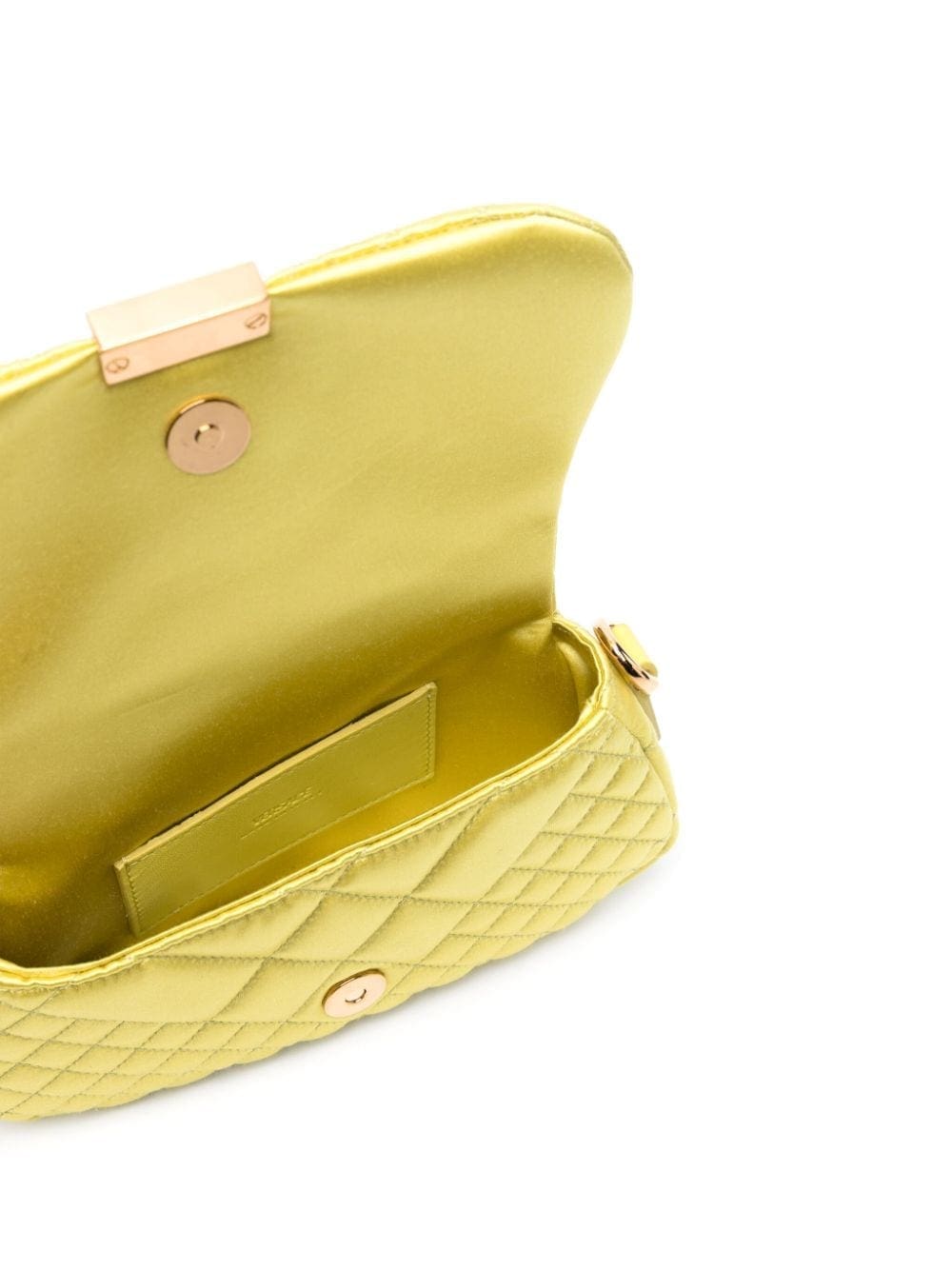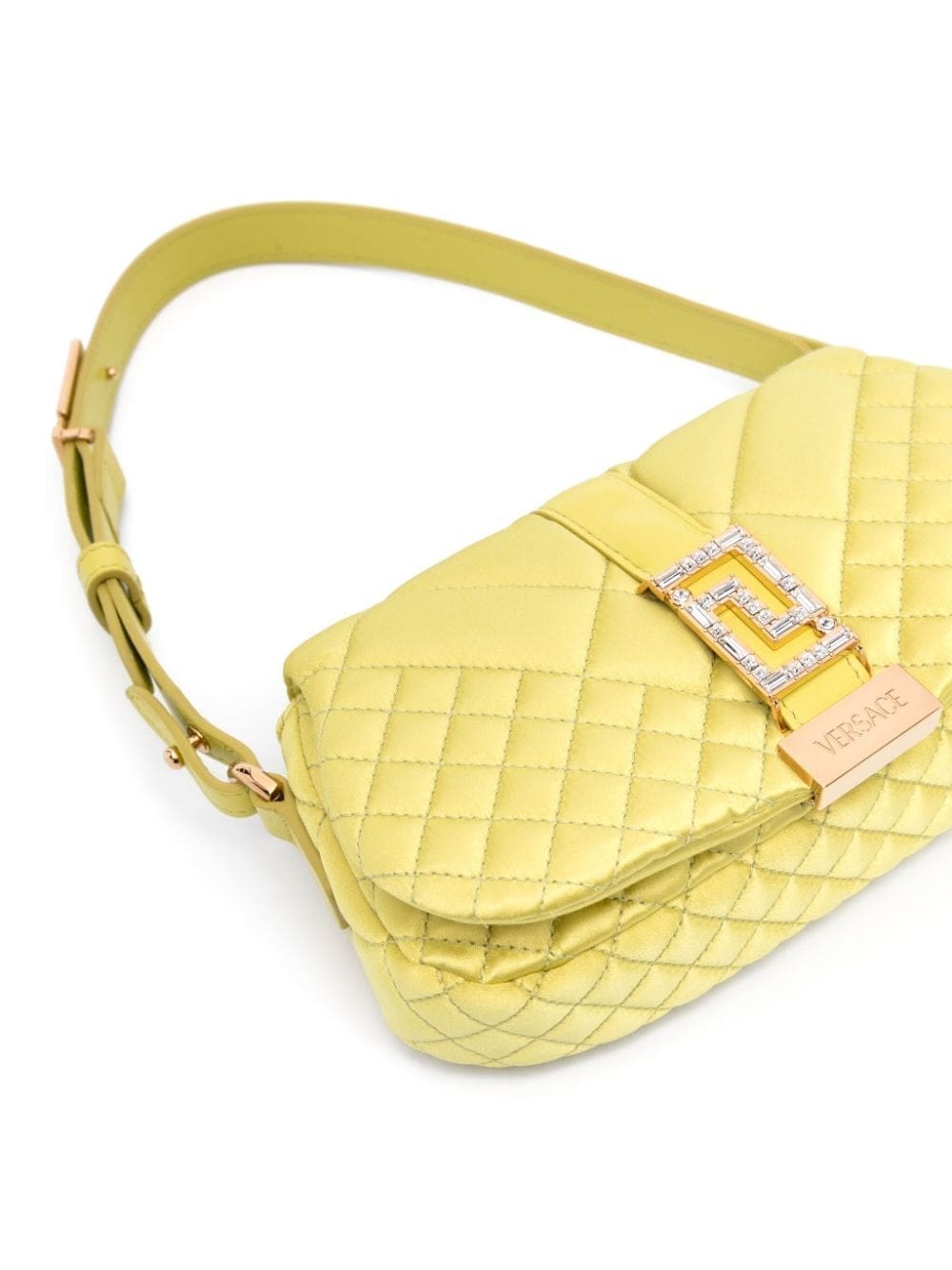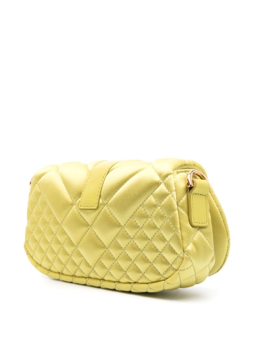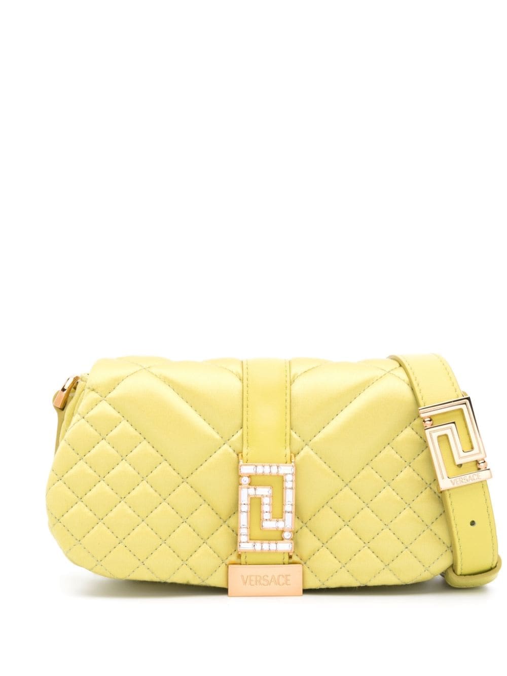 Signature branding underpins Versace's designs, as evidenced by the Greca Goddess mini bag. It's crafted from quilted lime green leather and accented with gold-tone Greca hardware at the front flap and shoulder strap.