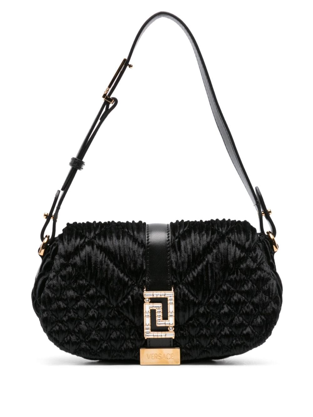 Signature branding underpins Versace's designs, as evidenced by the Greca Goddess shoulder bag. Constructed in Italy from velvet with a quilted effect, this accessory is punctuated with the iconic Greca chain hardware.