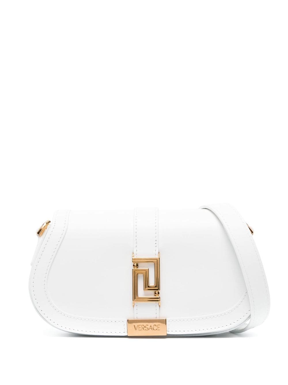 Versace's Greca Goddess handbags are defined by the iconic namesake hardware – the signature motif appears at the front and strap of this shoulder bag in gold-tone metal. This mini iteration is crafted from smooth leather in an optical-white hue.