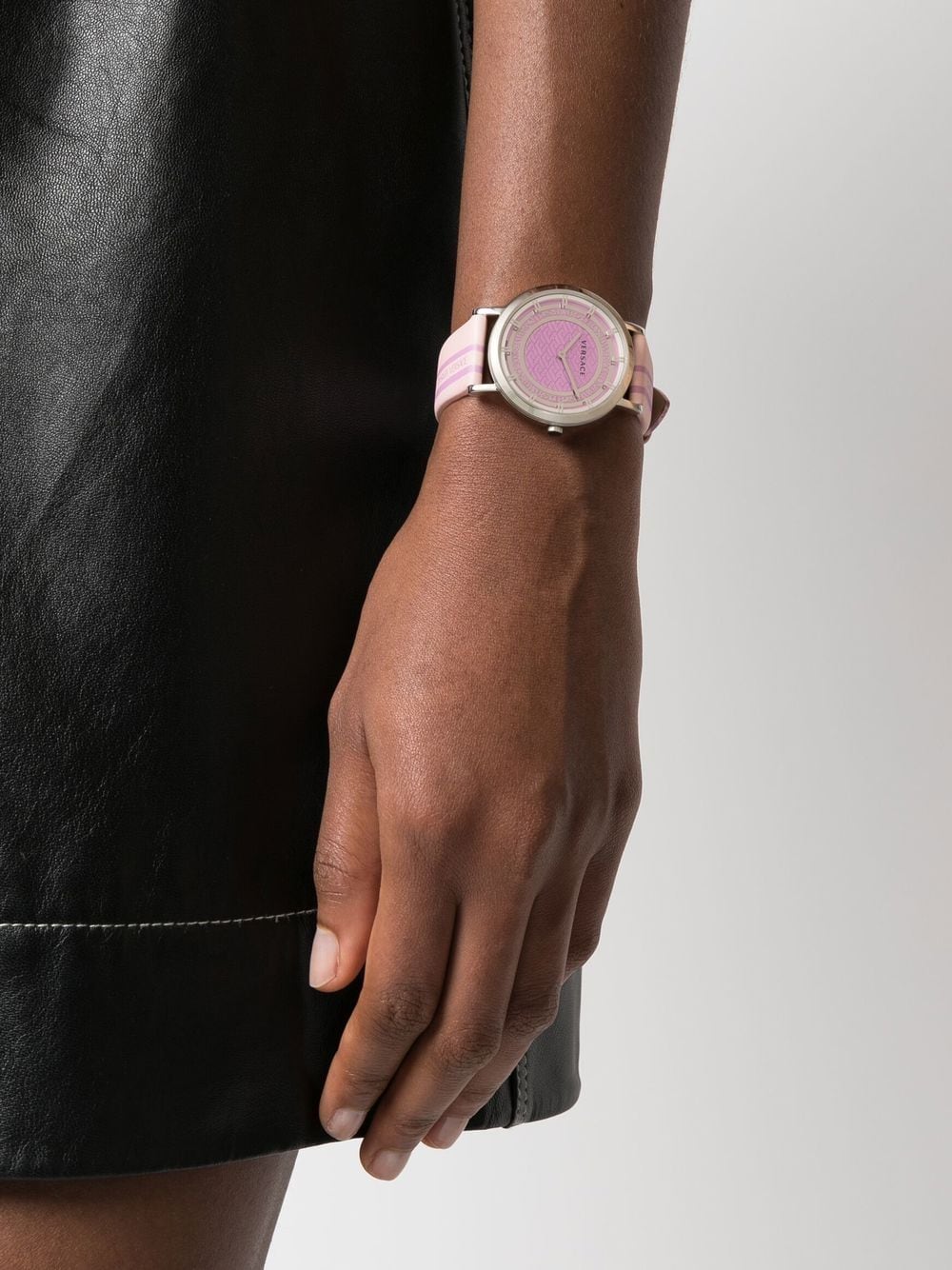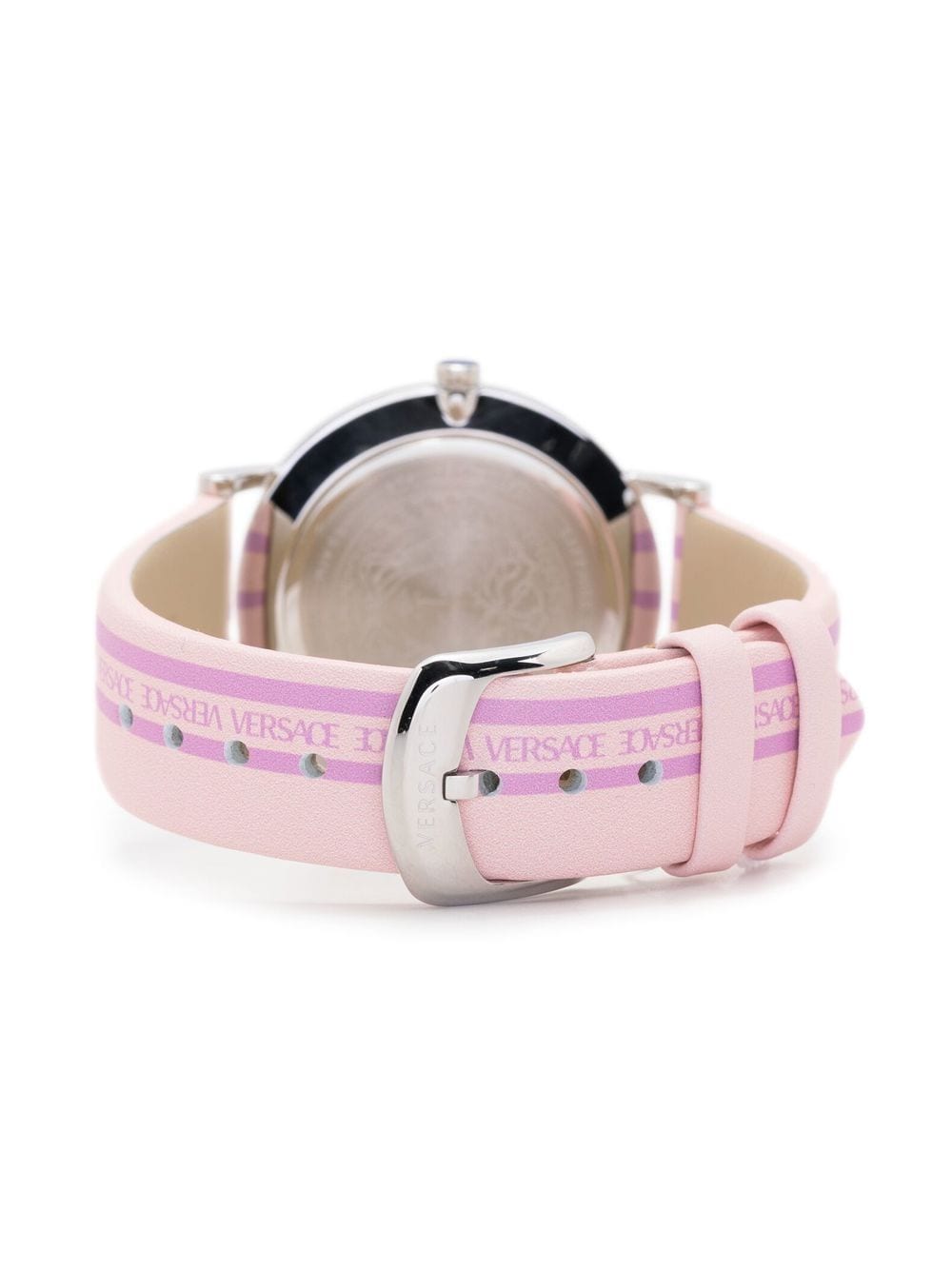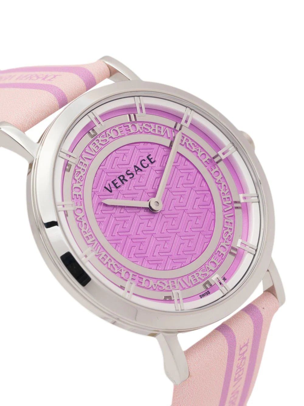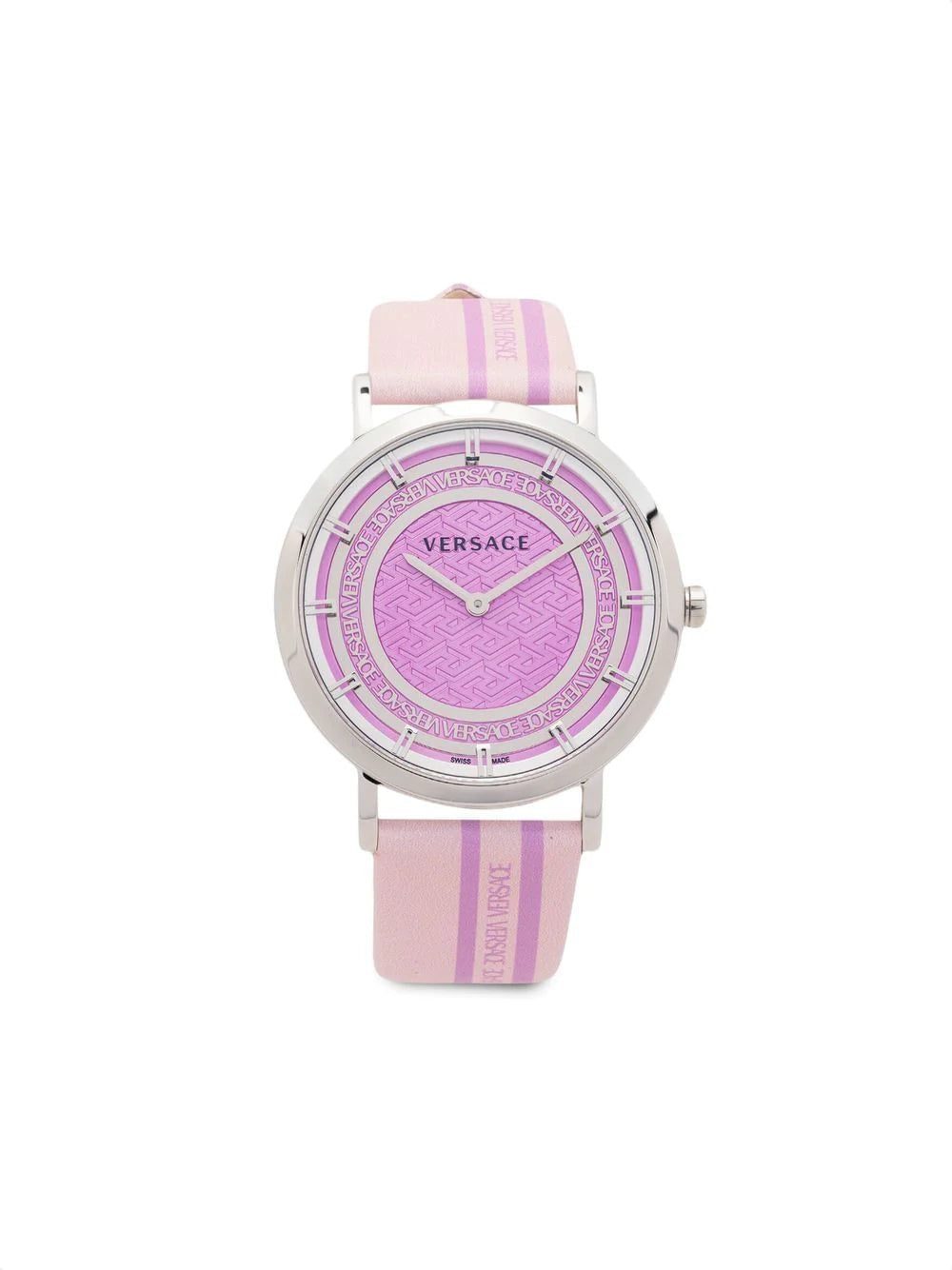 Versace's penchant for logomania is evidenced in this New Generation 35mm: crafted from stainless steel in refined silver tone, the blush pink dial is accented with the Italian fashion house's engraved logo for a branded finish.